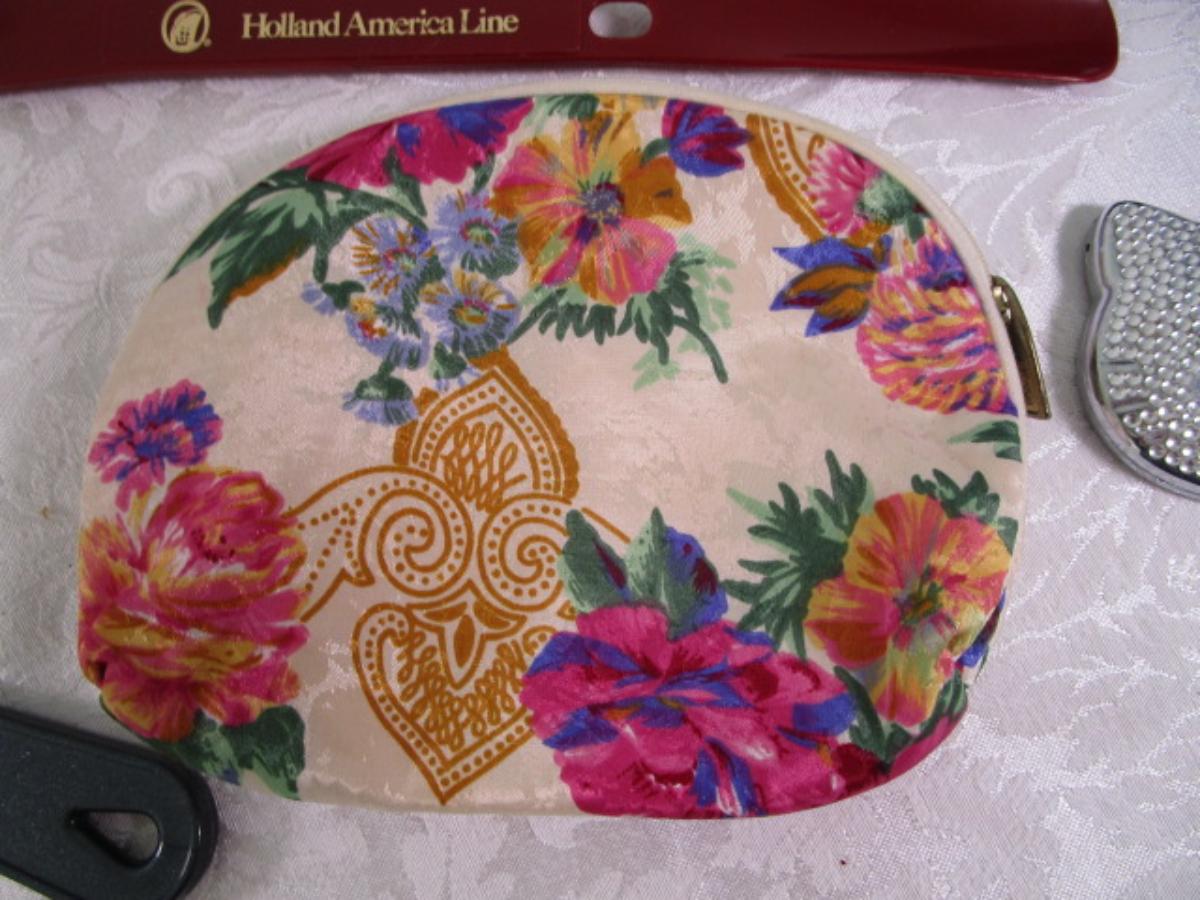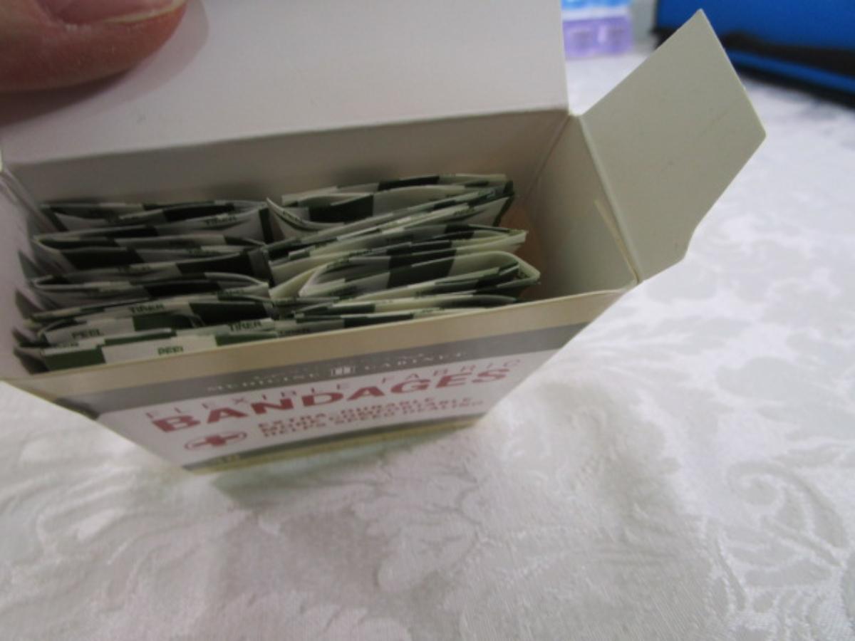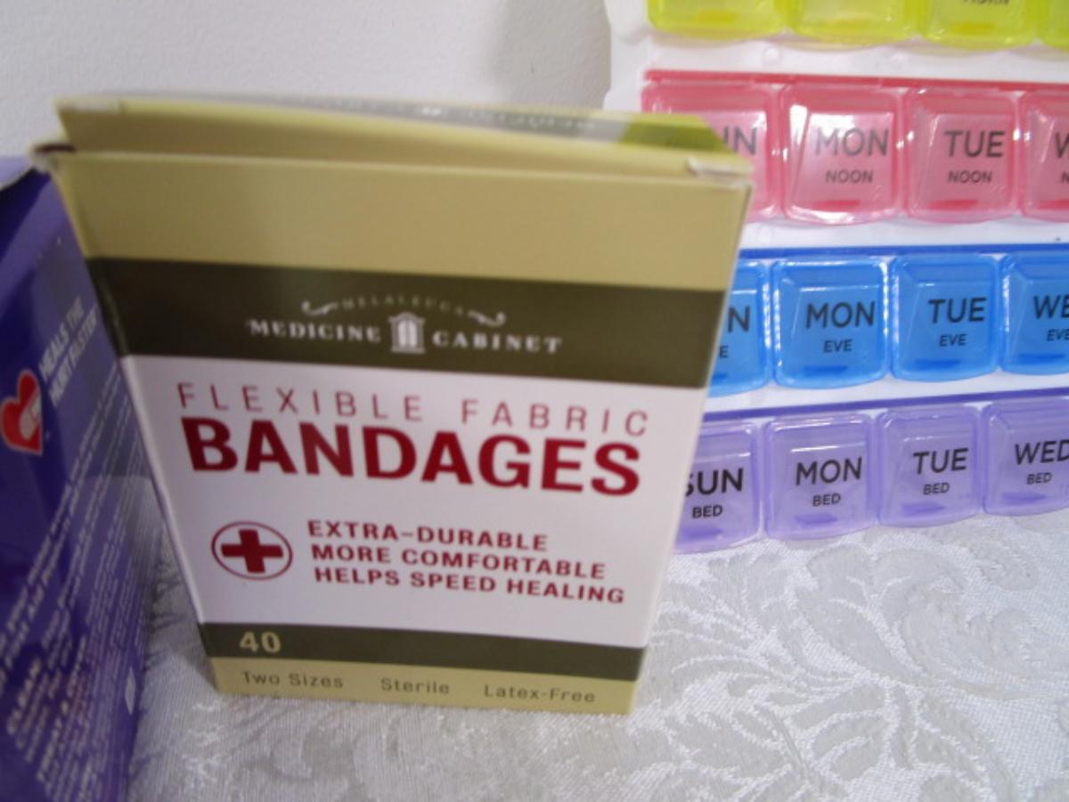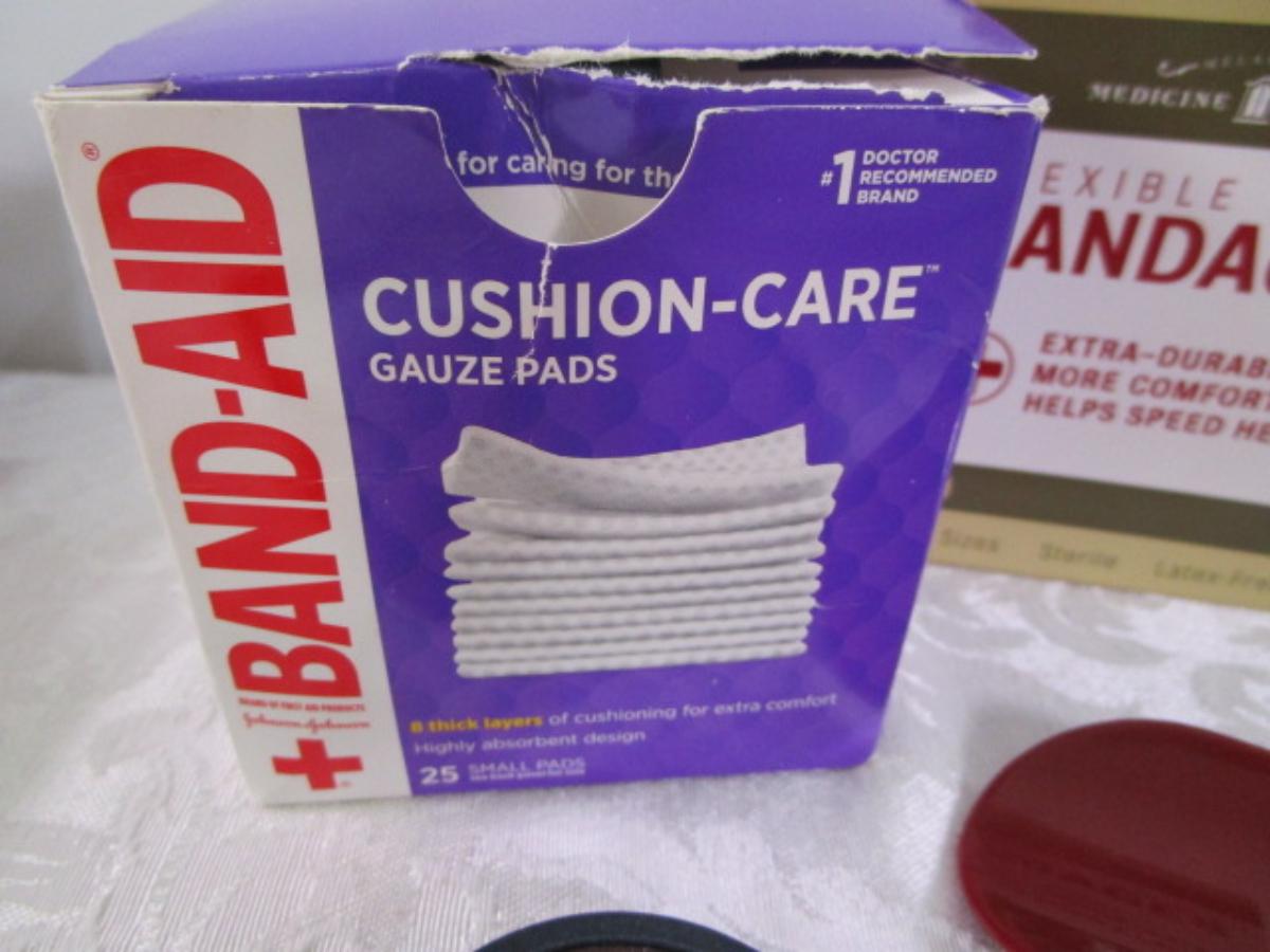 Box gauze pads, bandages, pill organizer, stomach wrap up to 39", shoe horn, mirror, makeup bag, Hello Kitty compact mirror, 3 oz travel bottle, Minnie Mouse pin
