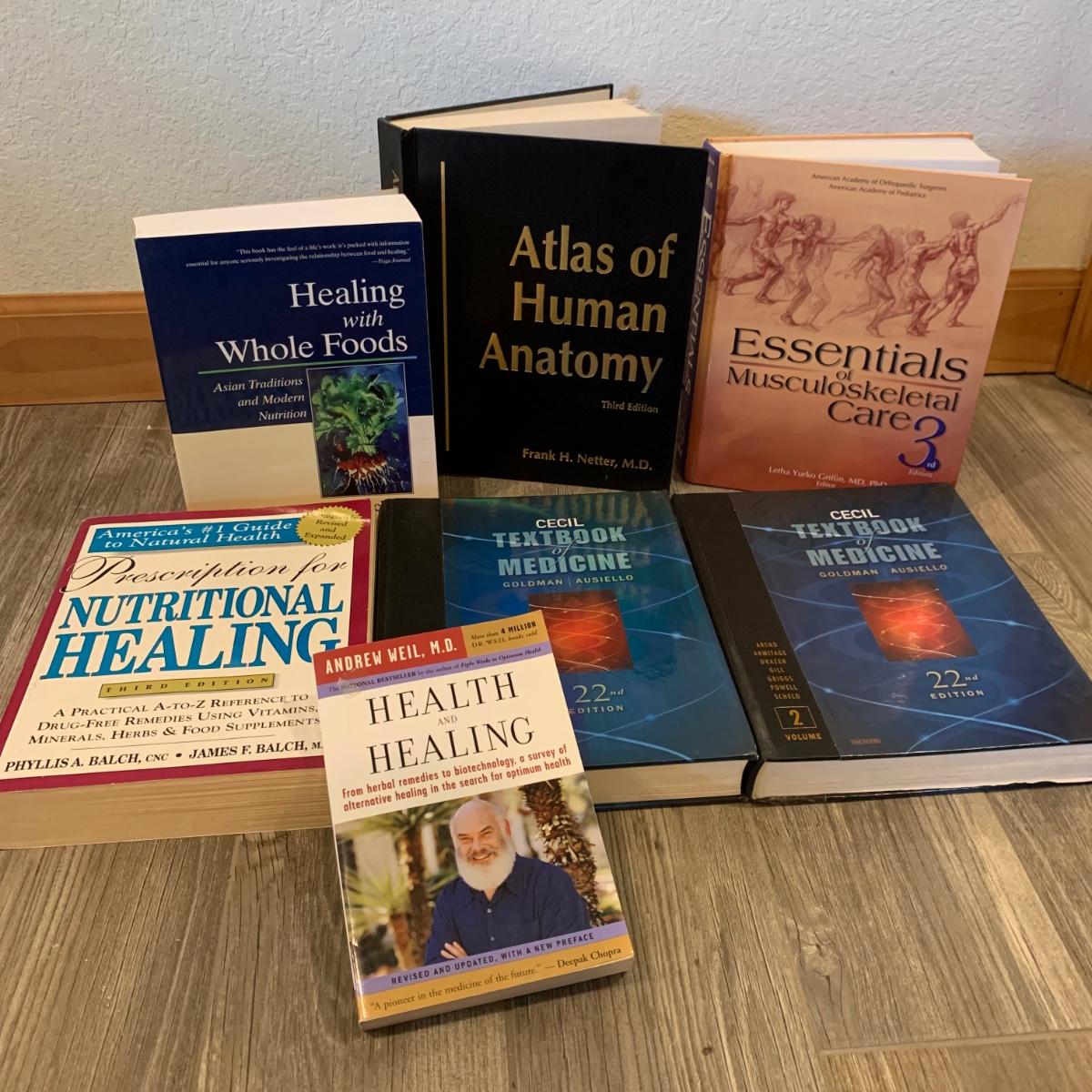 Seven health and medical related books. Three paperbacks and four hardcovers. Books appear to be in good condition, but just a little dusty.