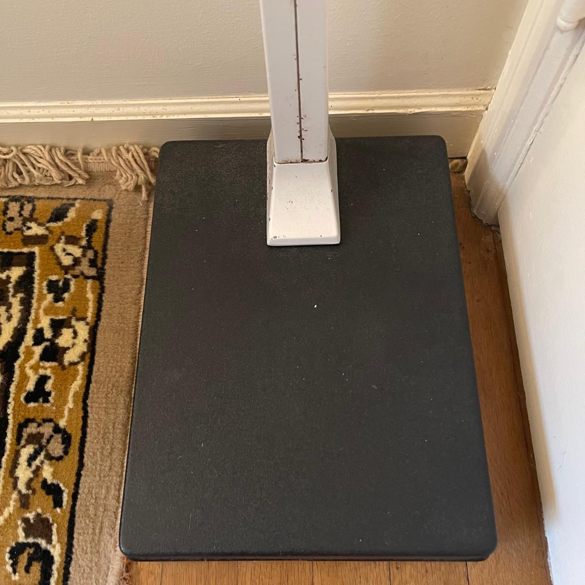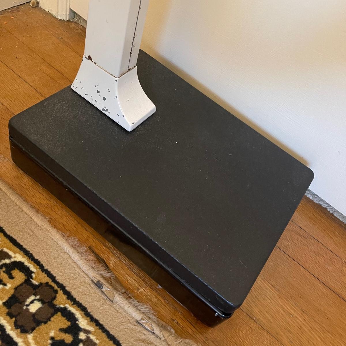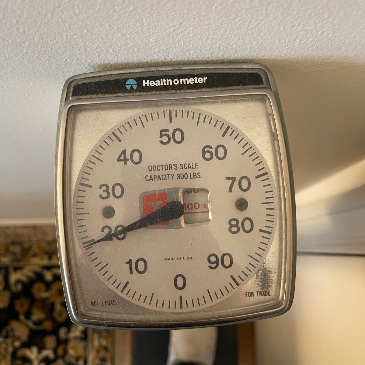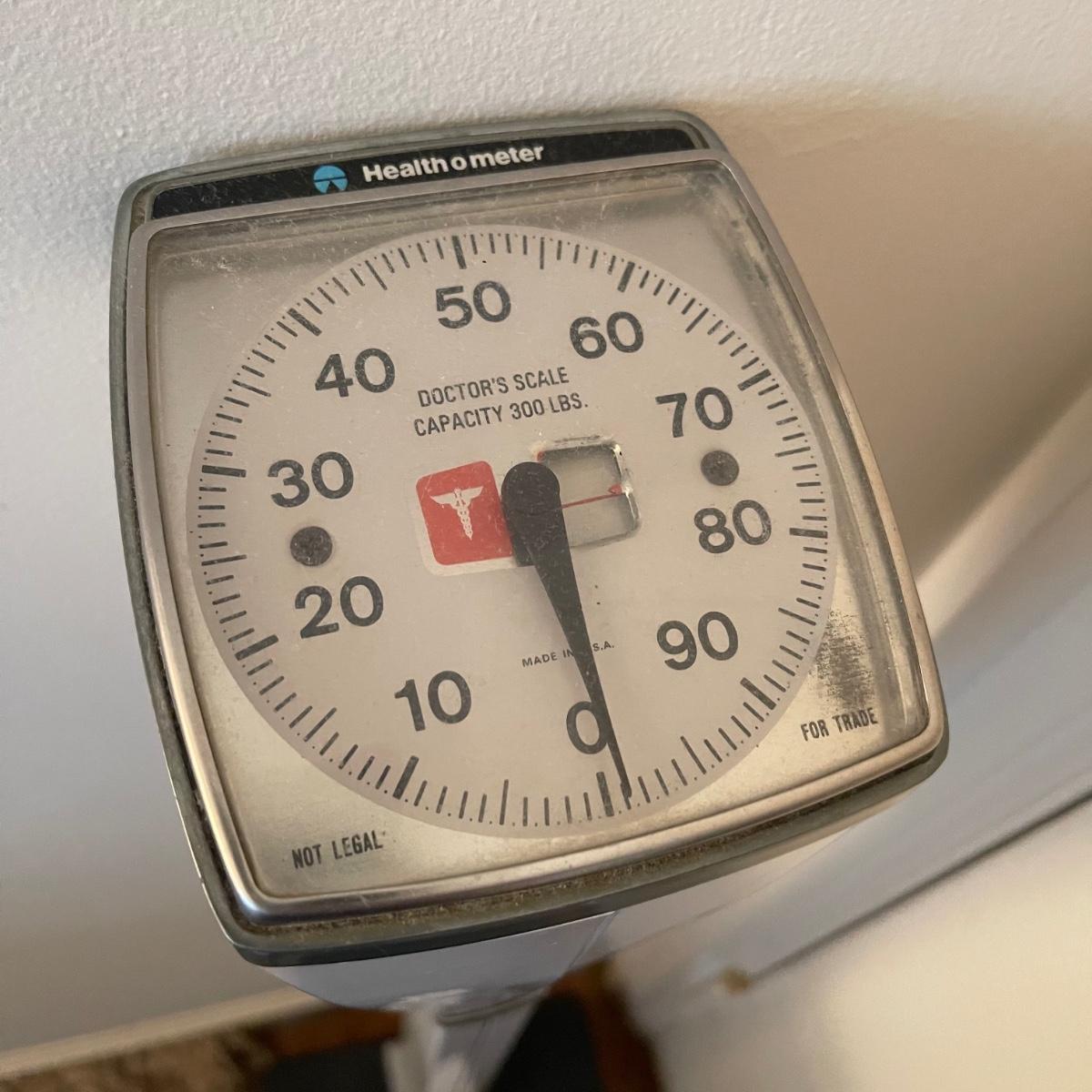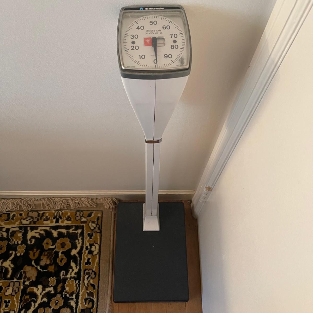 This doctor’s scale appears to be in working condition. It is about 35" tall and the heavy black base is about 13" long. Its label indicates a weight limit of 300lbs. This scale is easy to move and seems to weigh accurately.