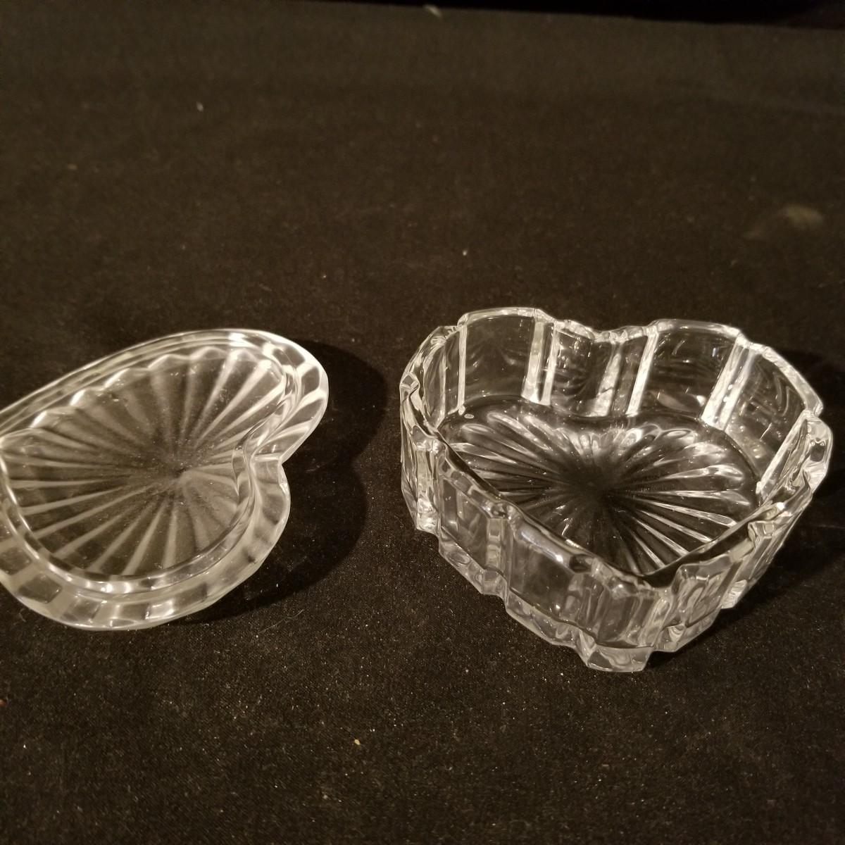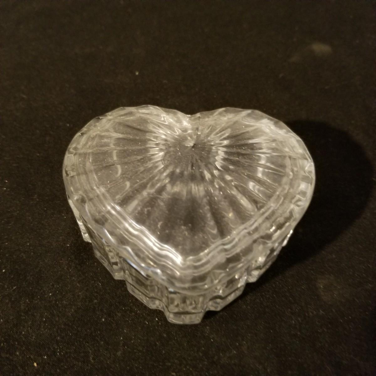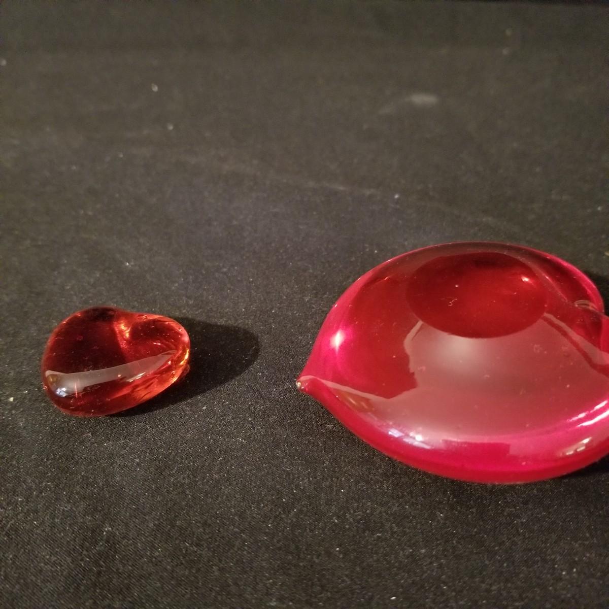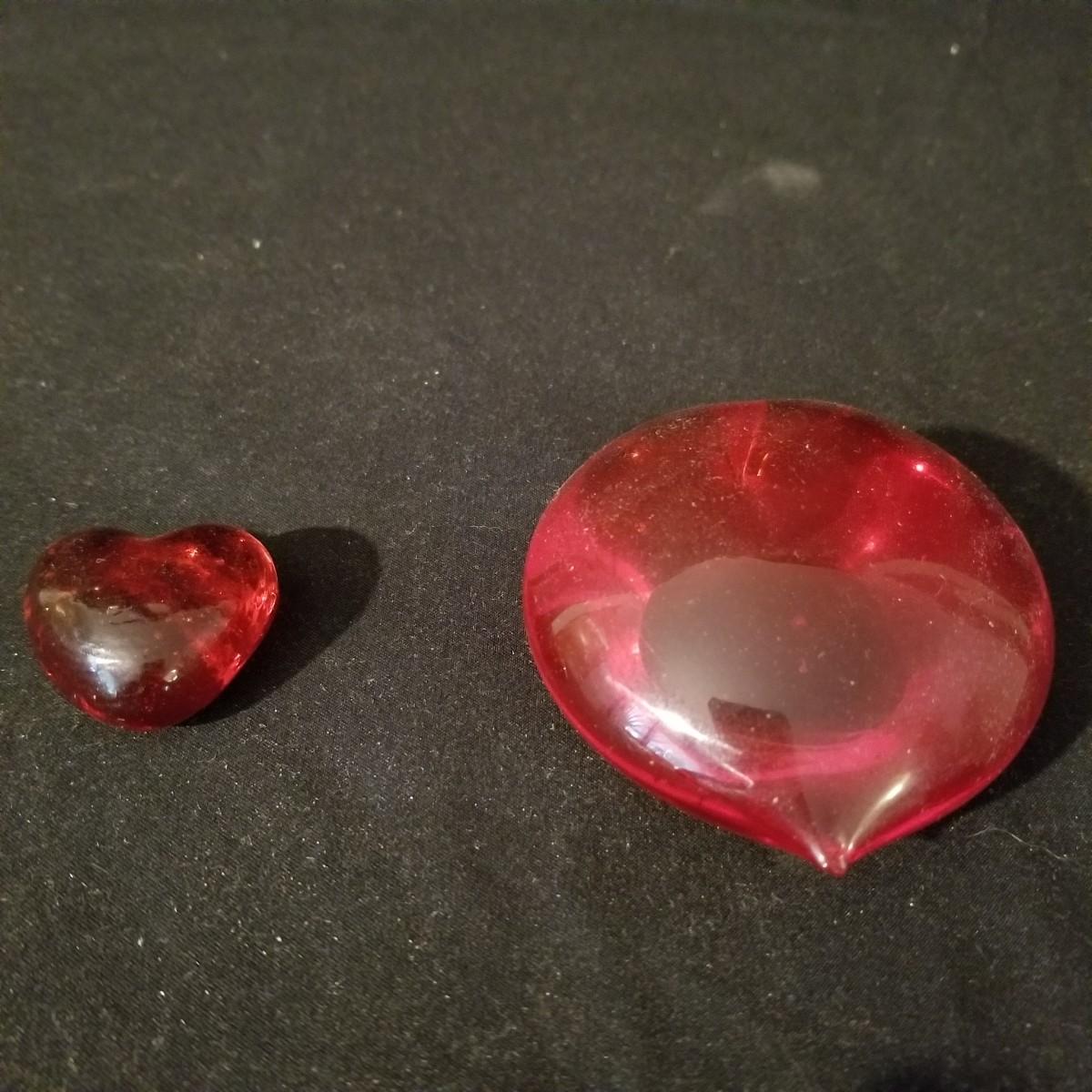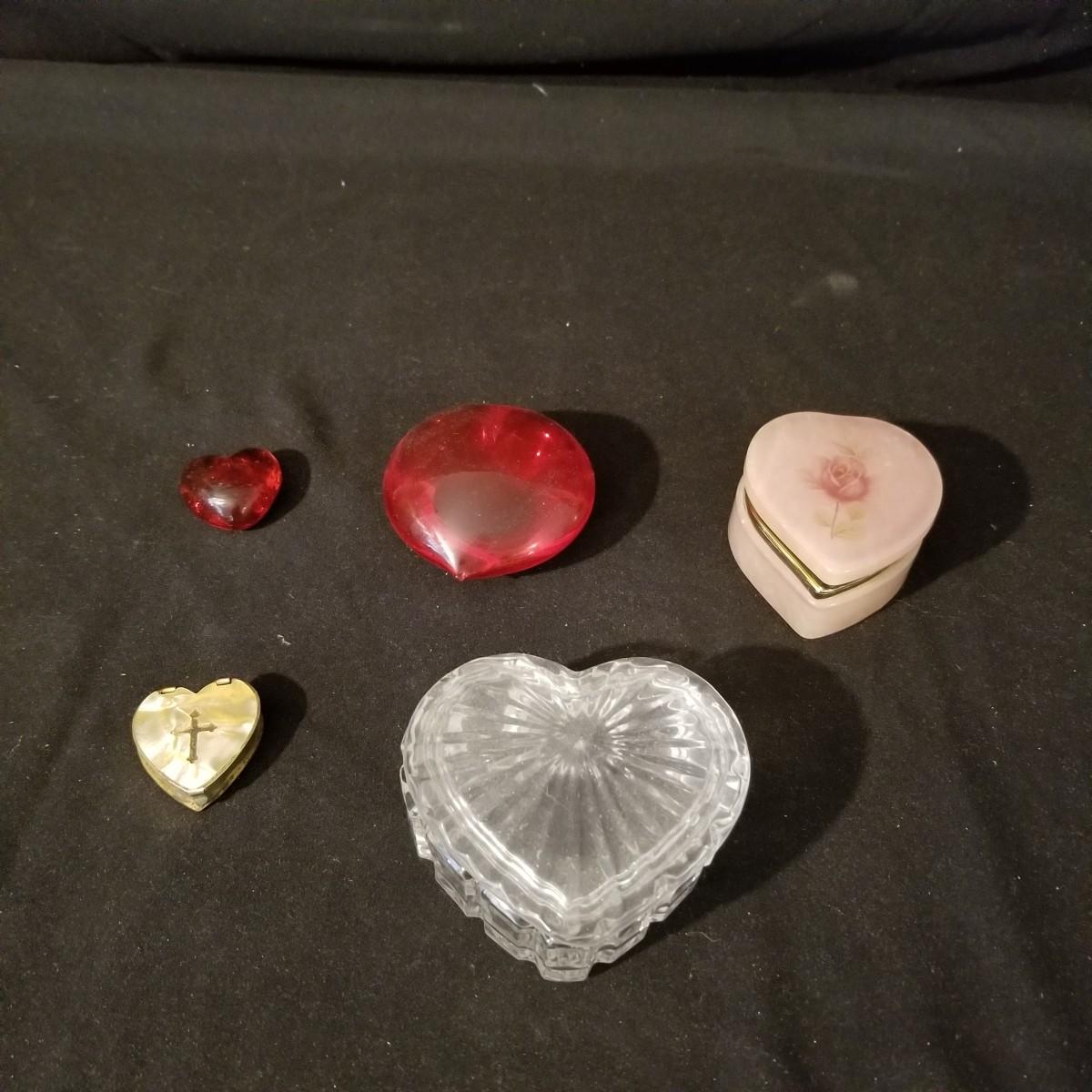 Five heart shaped items: three boxes and two paperweights. One clear glass, one alabaster, and one (what appears to be) mother of pearl boxes, all with lids. Also two red glass paperweights. Clear glass heart measures approximately 3.5" x 3.5" x 1.5" Shipping available.