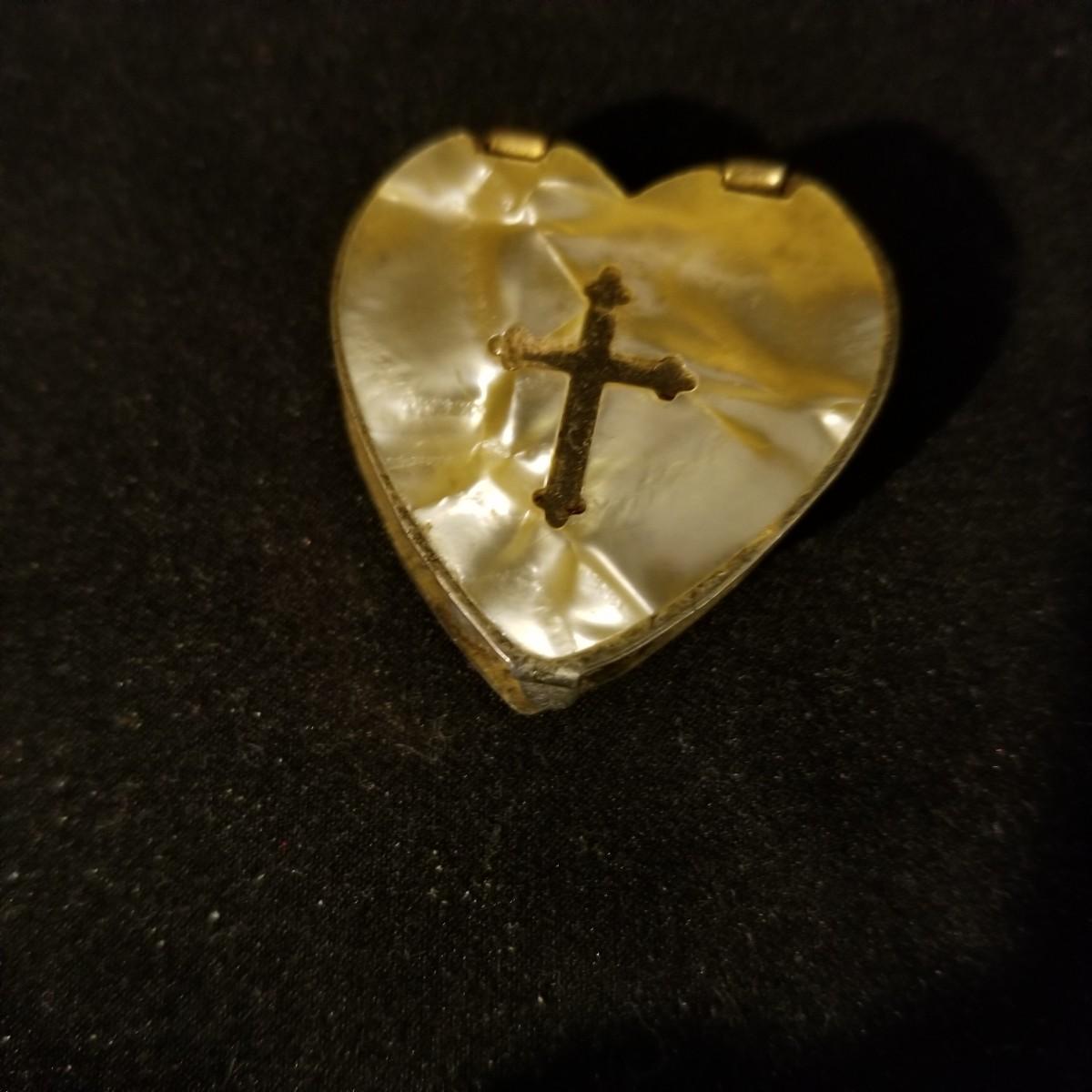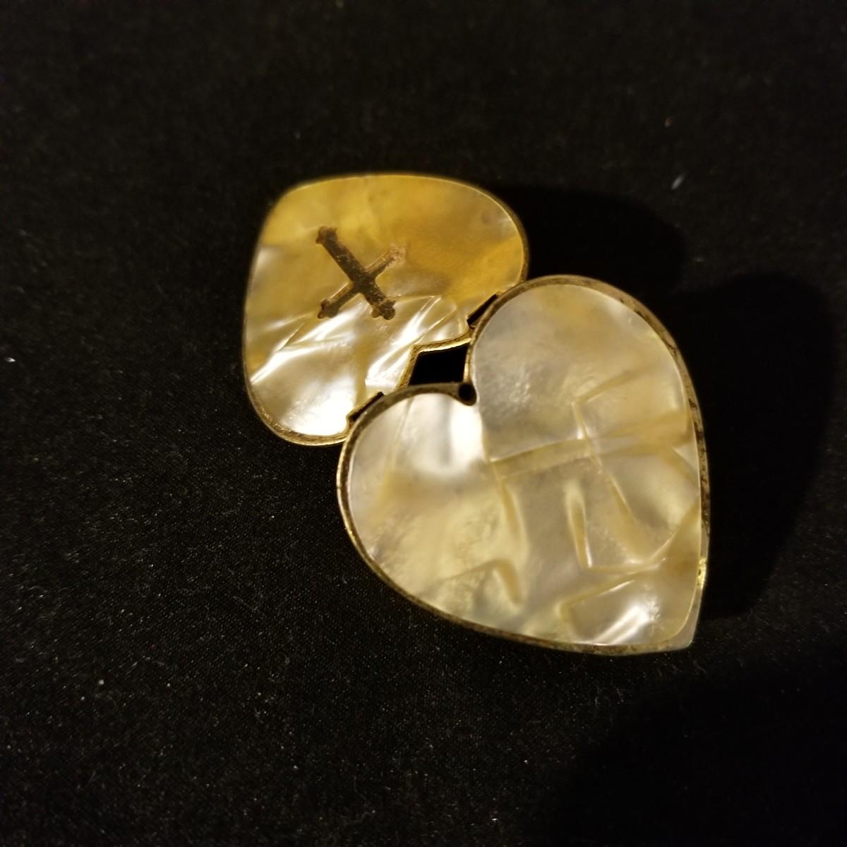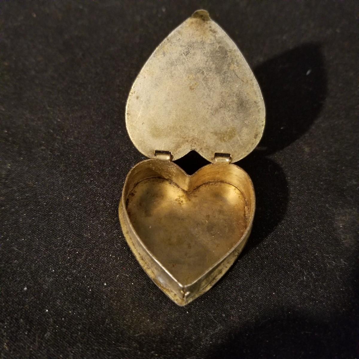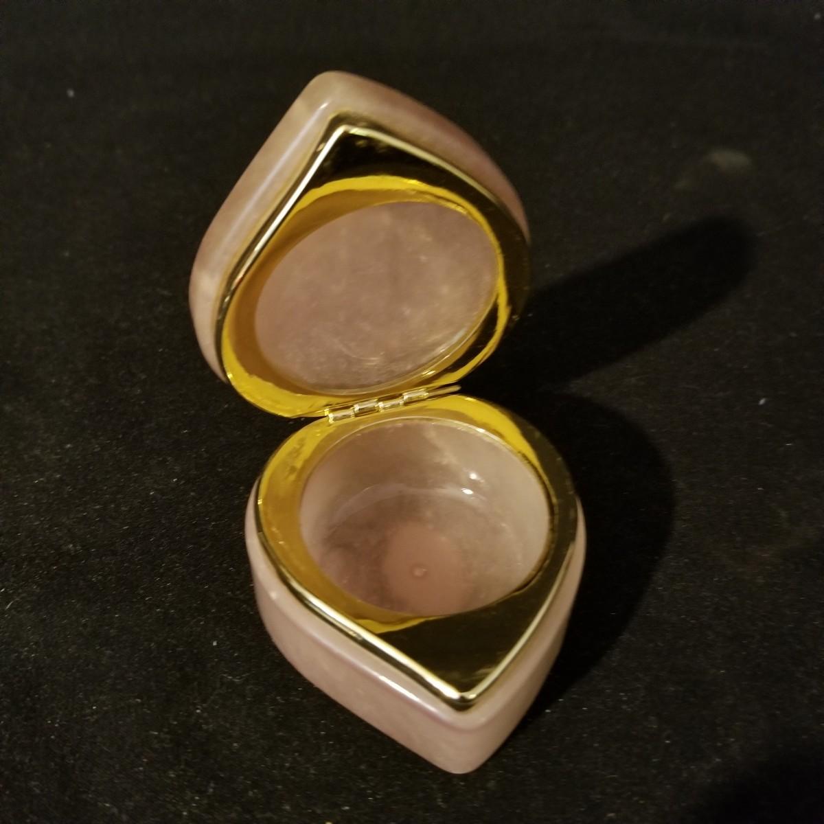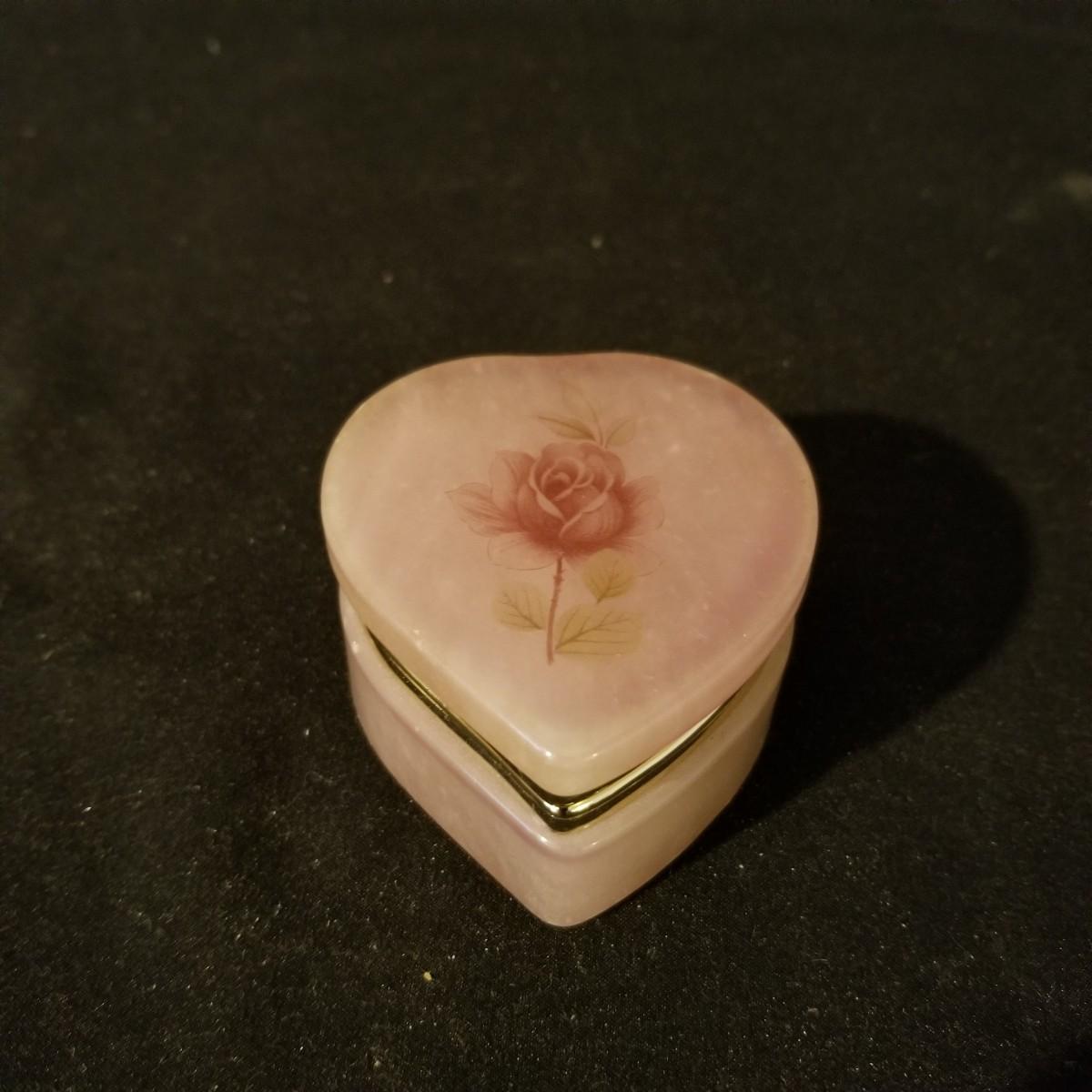 Five heart shaped items: three boxes and two paperweights. One clear glass, one alabaster, and one (what appears to be) mother of pearl boxes, all with lids. Also two red glass paperweights. Clear glass heart measures approximately 3.5" x 3.5" x 1.5" Shipping available.