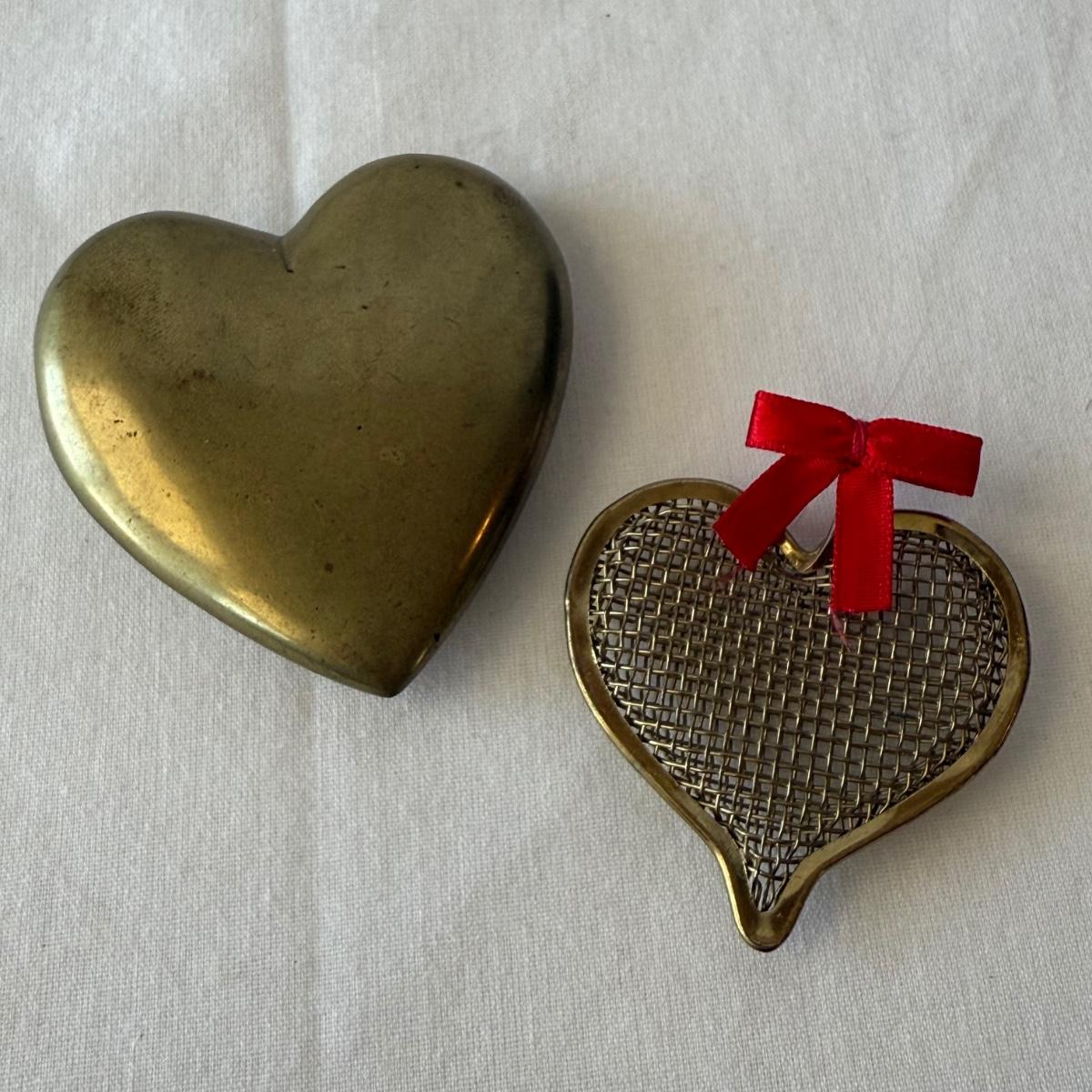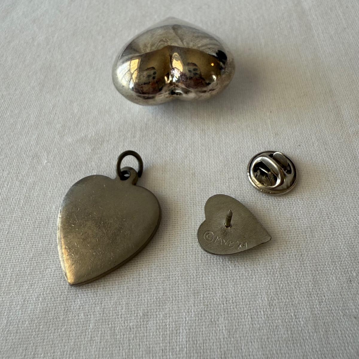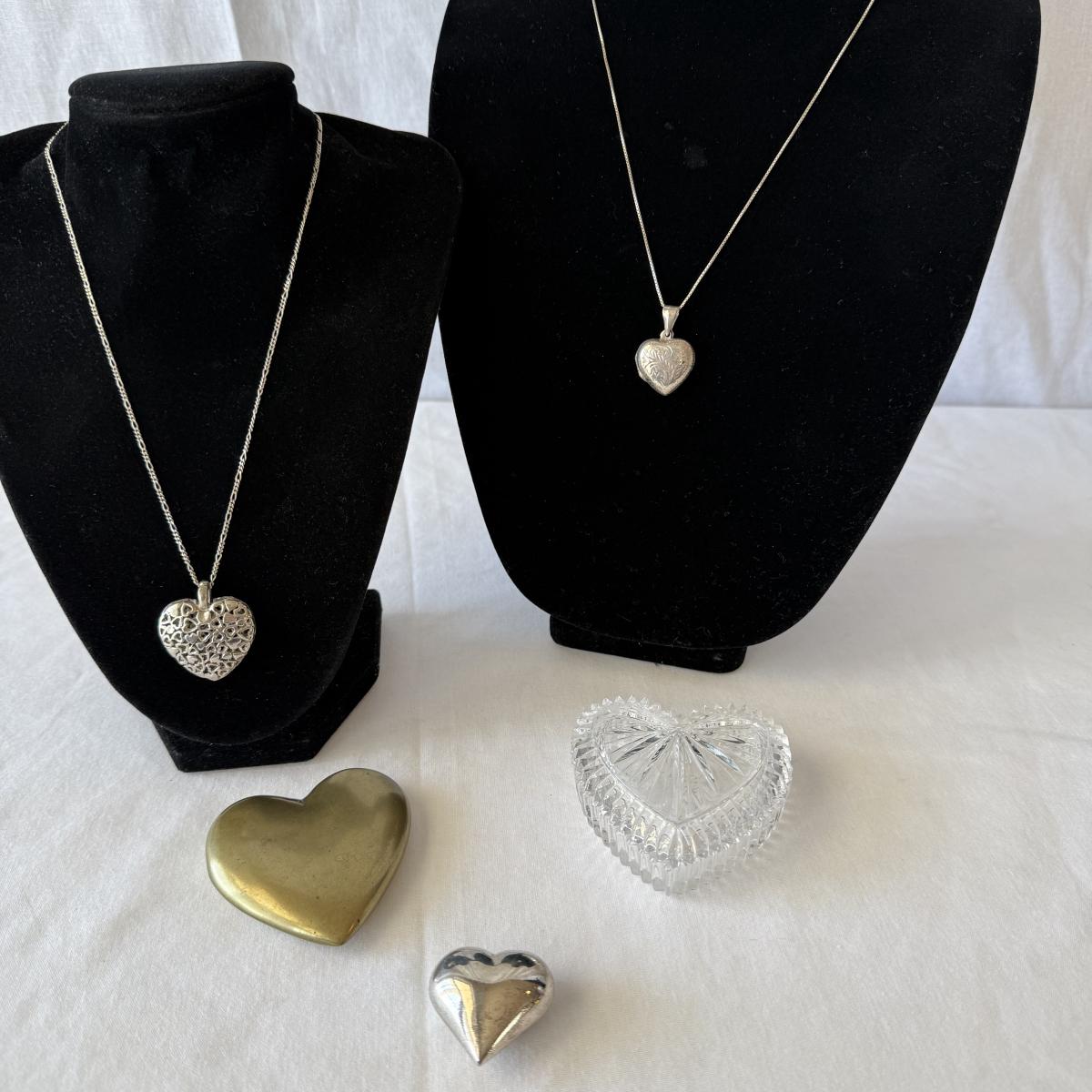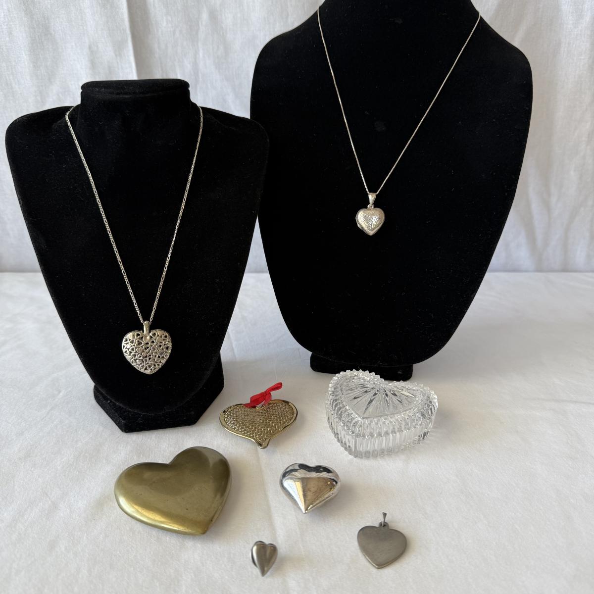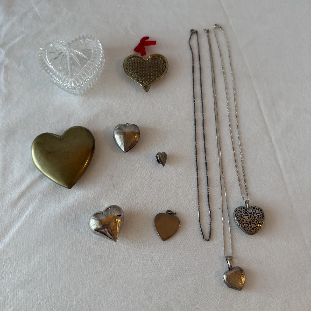 Hearts of all kinds, including heart pendants on 925 chains, a glass heart trinket box, a heart pin, a brass heart, and more. The first locket photographed is stamped 925. The brass heart appears to be solid brass - it’s heavy! The longest necklace chain is 20“. A second locket has a unique inside, see photos. Please see photos for inventory.