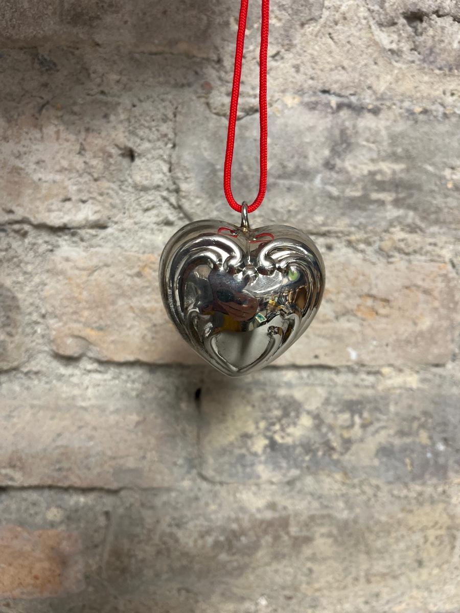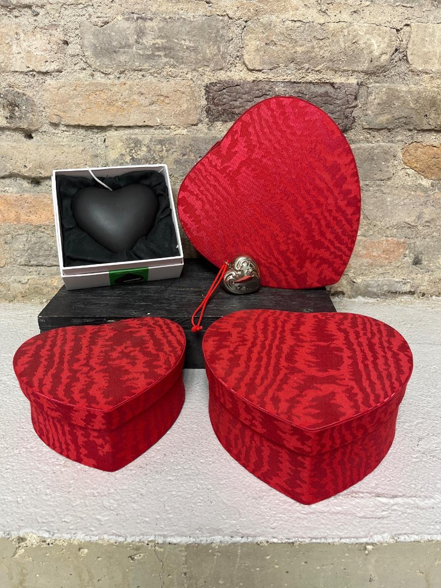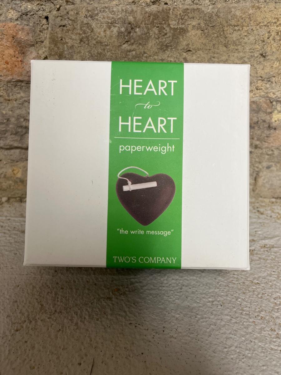 Set of three heart nesting boxes, silver plated heart door hanger bell, and Two’s Company heart note paperweight - chalkboard - super cute