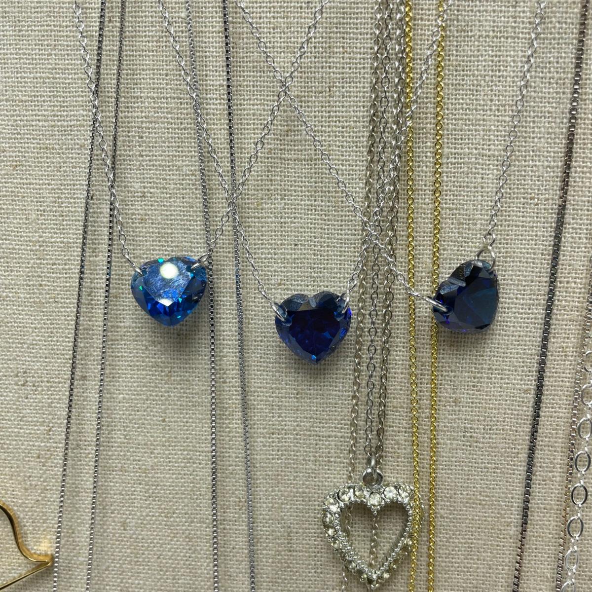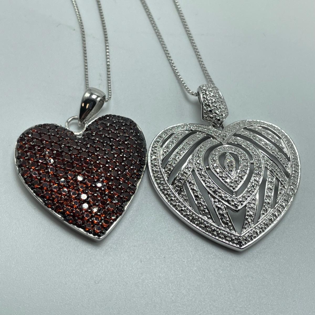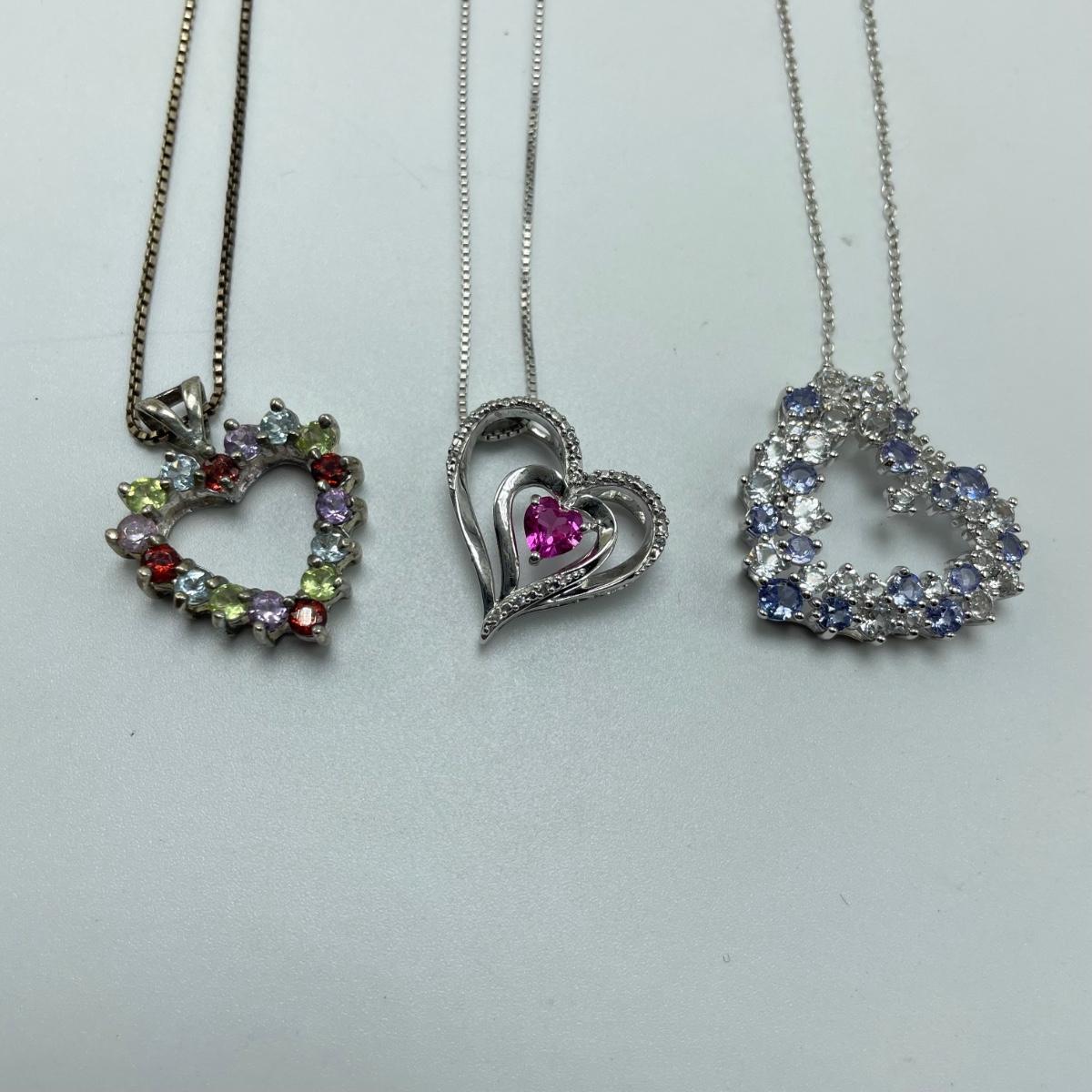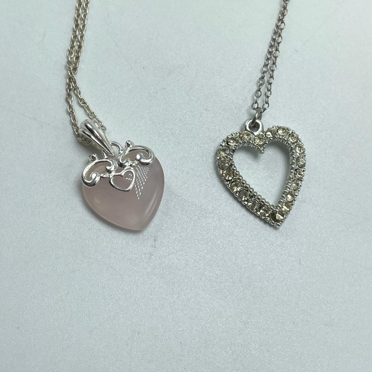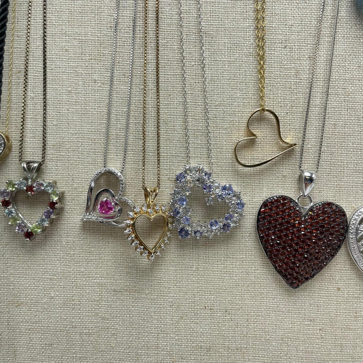 19 heart shaped pendants with chains. Lot features a 925 stamped heart pendant and chain, the gems tested as diamonds, and a pendant and chain marked 10K, both of these necklaces are shown in images with the wooden ruler. Other highlights are the earring necklace set stamped Avon, a locket on a 24” long black cord, two garnet colored pendants and more. A lot of other pieces are stamped 925. Please see photos for all markings found. We cannot guarantee the authenticity of the gemstones. All sales are final. No returns or refunds. Please bid accordingly.