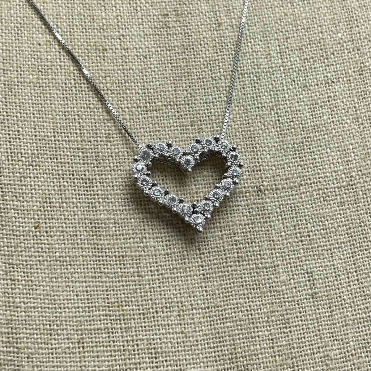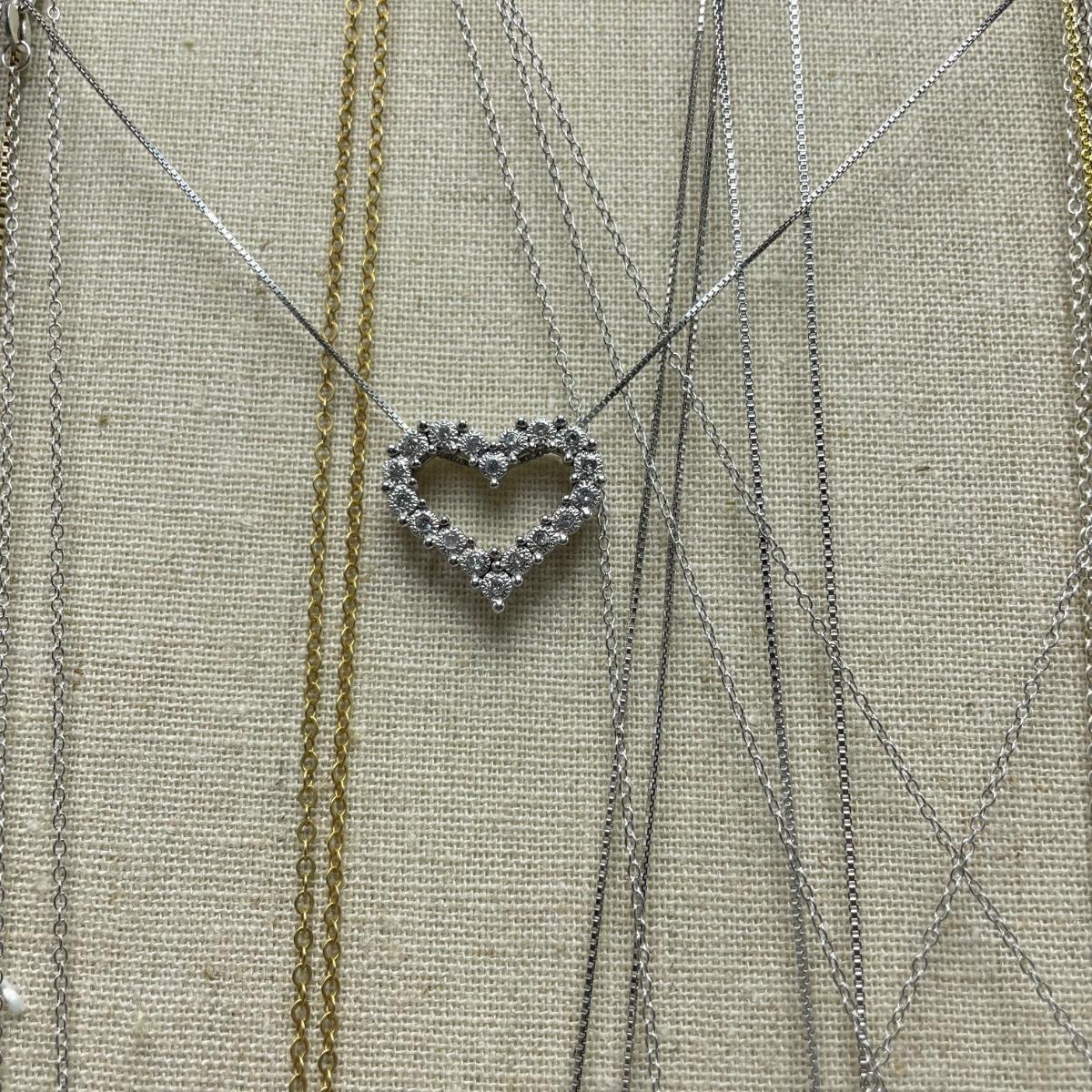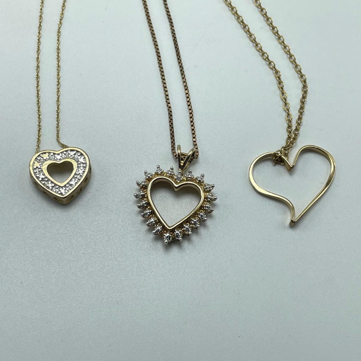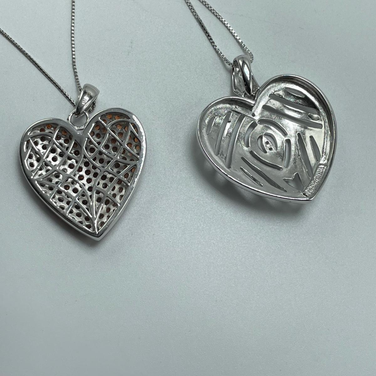 19 heart shaped pendants with chains. Lot features a 925 stamped heart pendant and chain, the gems tested as diamonds, and a pendant and chain marked 10K, both of these necklaces are shown in images with the wooden ruler. Other highlights are the earring necklace set stamped Avon, a locket on a 24” long black cord, two garnet colored pendants and more. A lot of other pieces are stamped 925. Please see photos for all markings found. We cannot guarantee the authenticity of the gemstones. All sales are final. No returns or refunds. Please bid accordingly.