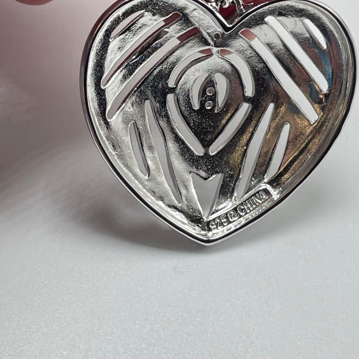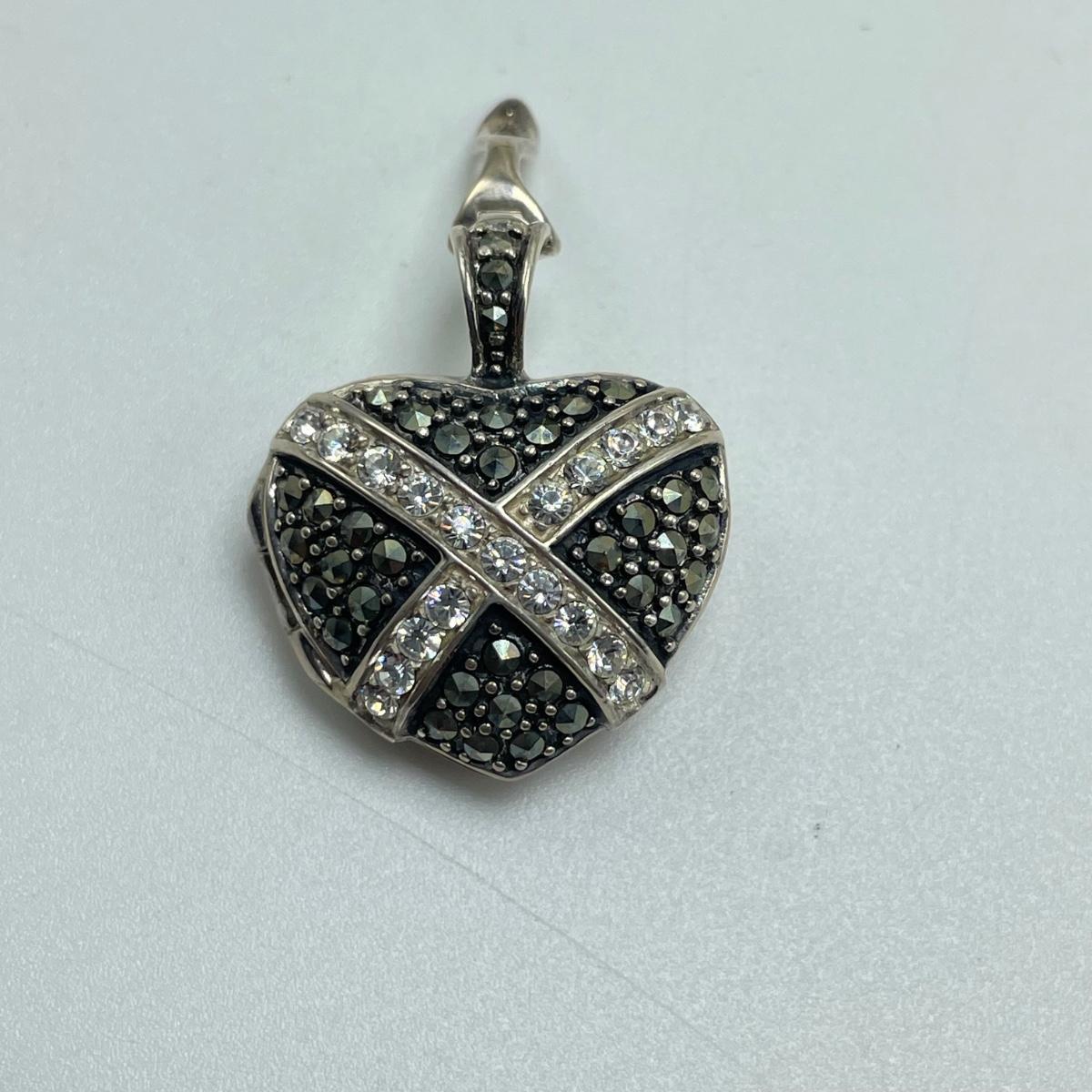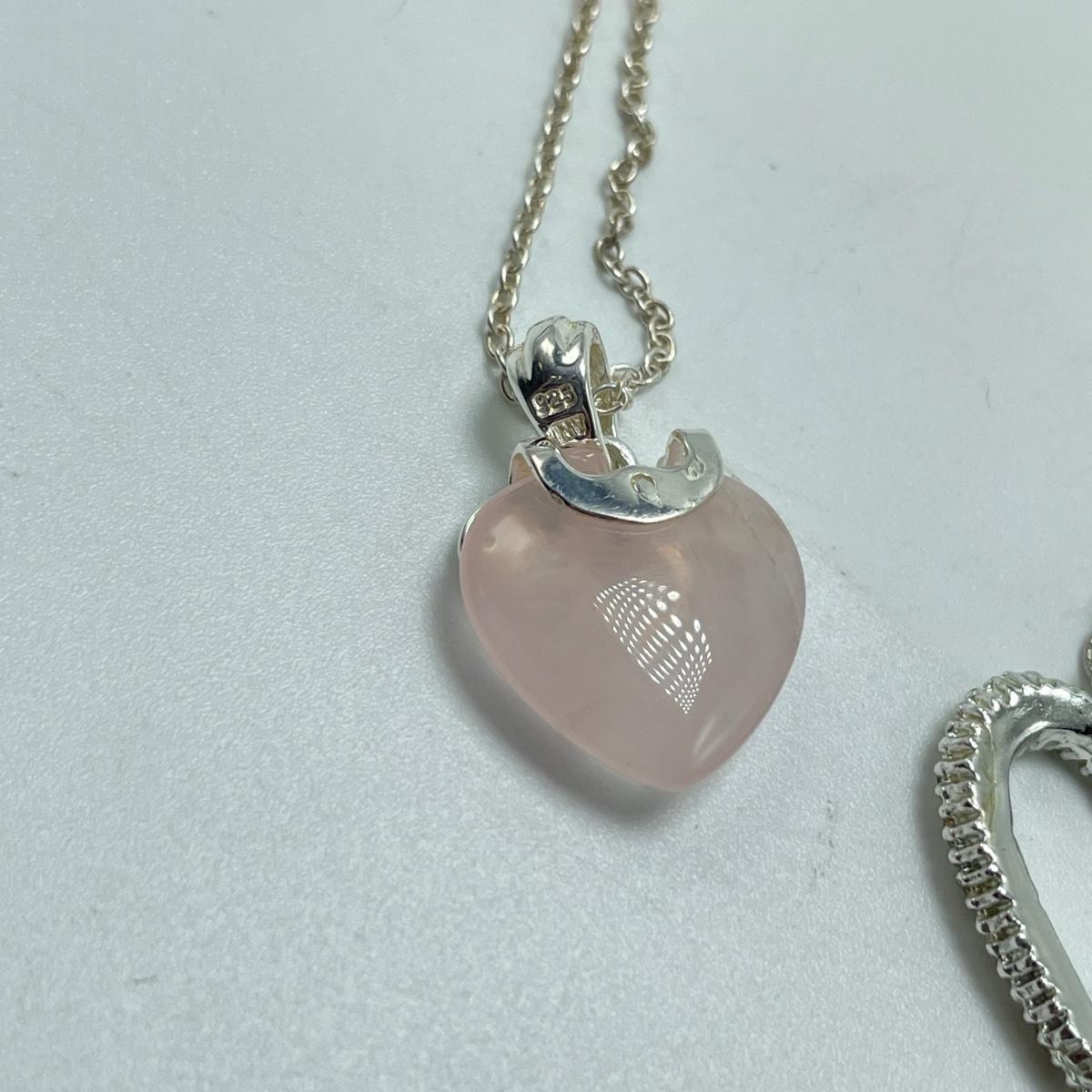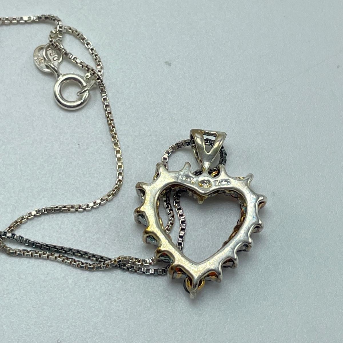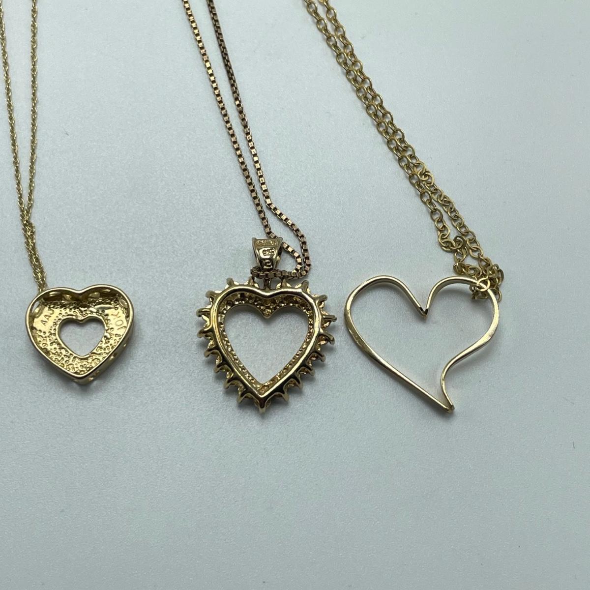 19 heart shaped pendants with chains. Lot features a 925 stamped heart pendant and chain, the gems tested as diamonds, and a pendant and chain marked 10K, both of these necklaces are shown in images with the wooden ruler. Other highlights are the earring necklace set stamped Avon, a locket on a 24” long black cord, two garnet colored pendants and more. A lot of other pieces are stamped 925. Please see photos for all markings found. We cannot guarantee the authenticity of the gemstones. All sales are final. No returns or refunds. Please bid accordingly.