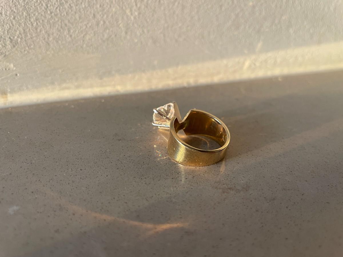 This ring is not a real diamond but it is a beauty! Size 5. Thick gold band is 14kt and stamped as such..