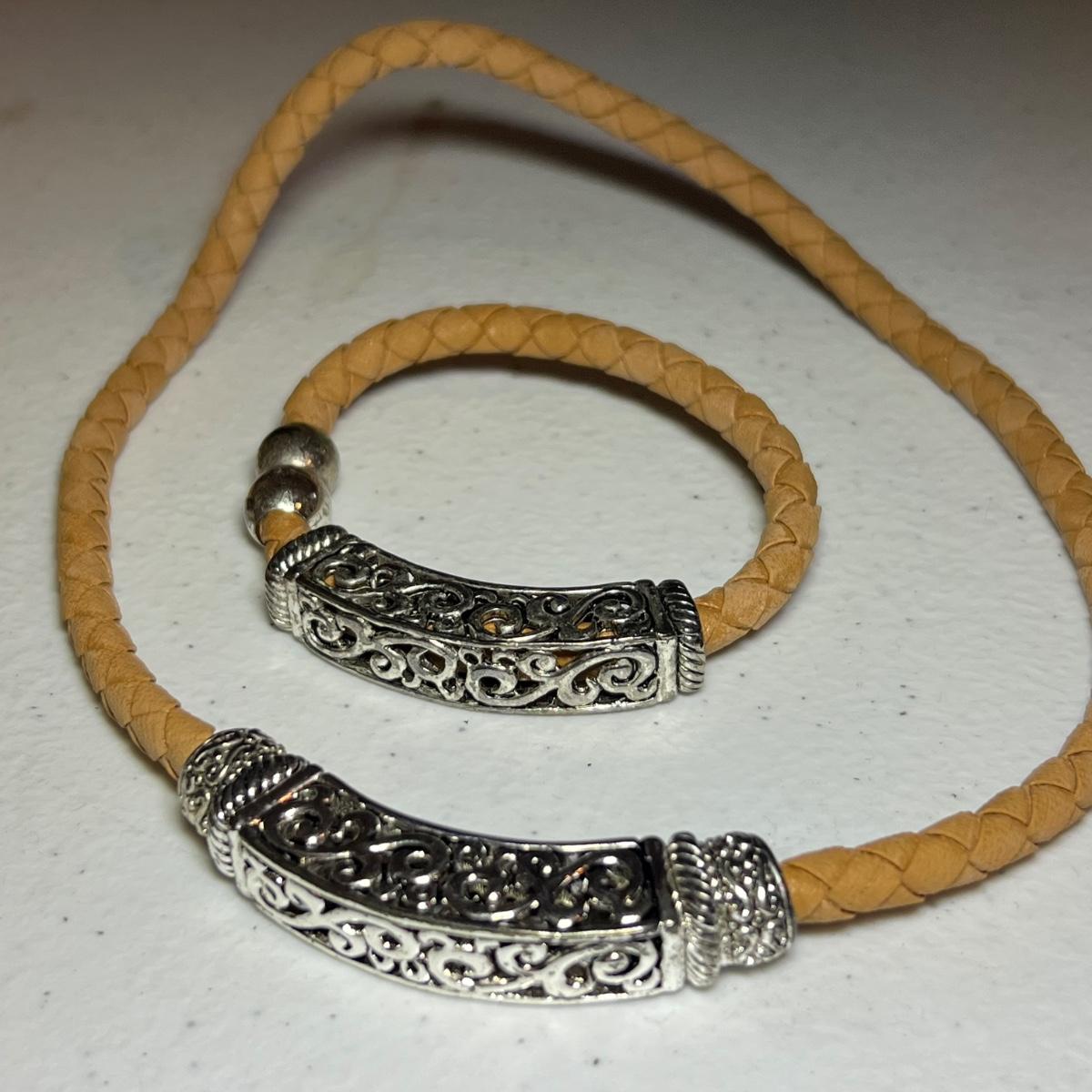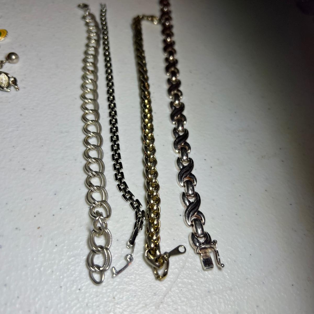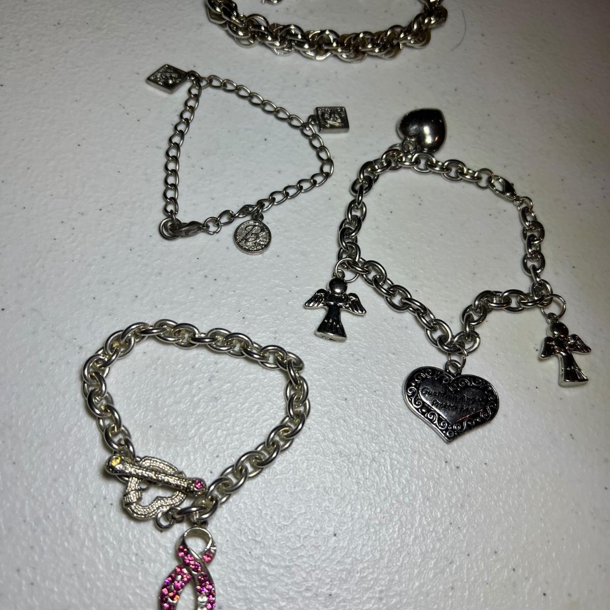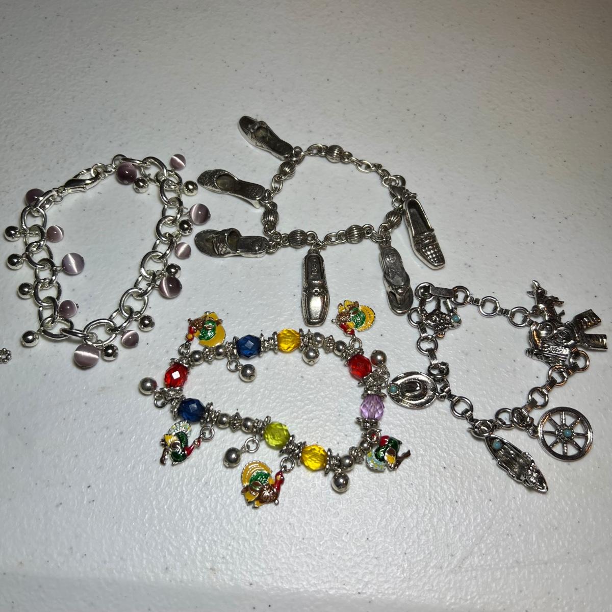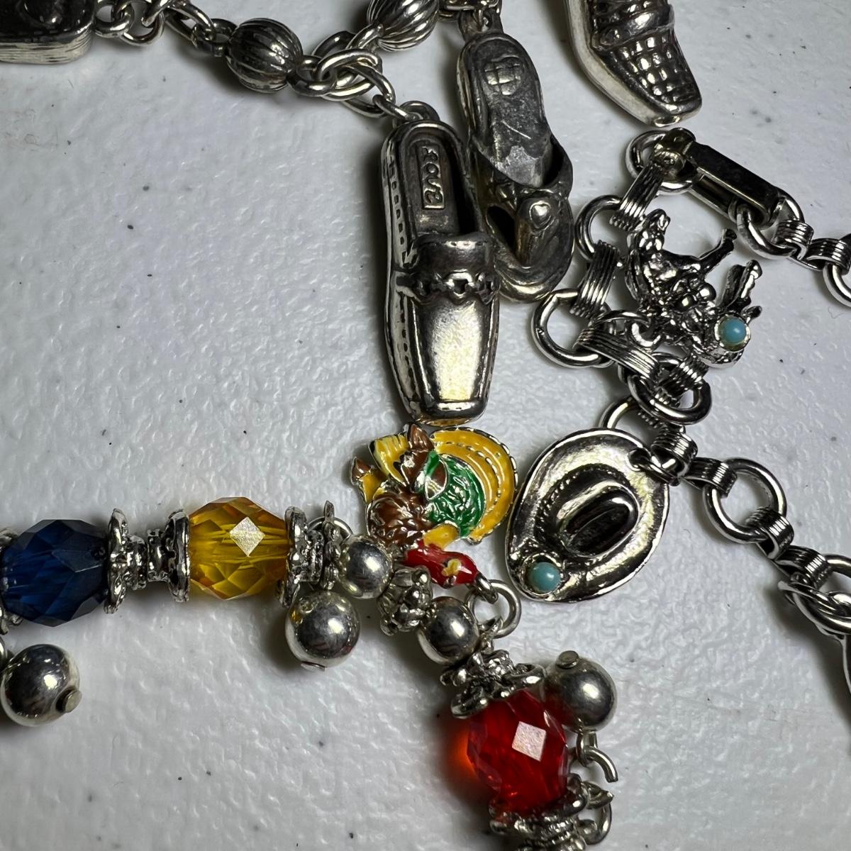 15 silver toned bracelets includes charm bracelets, chain style and more. A matching faux leather necklace and bracelet also included along with a pewter owl with matching container, extra shoe shaped charms and a heart shaped locket pendant marked 925.