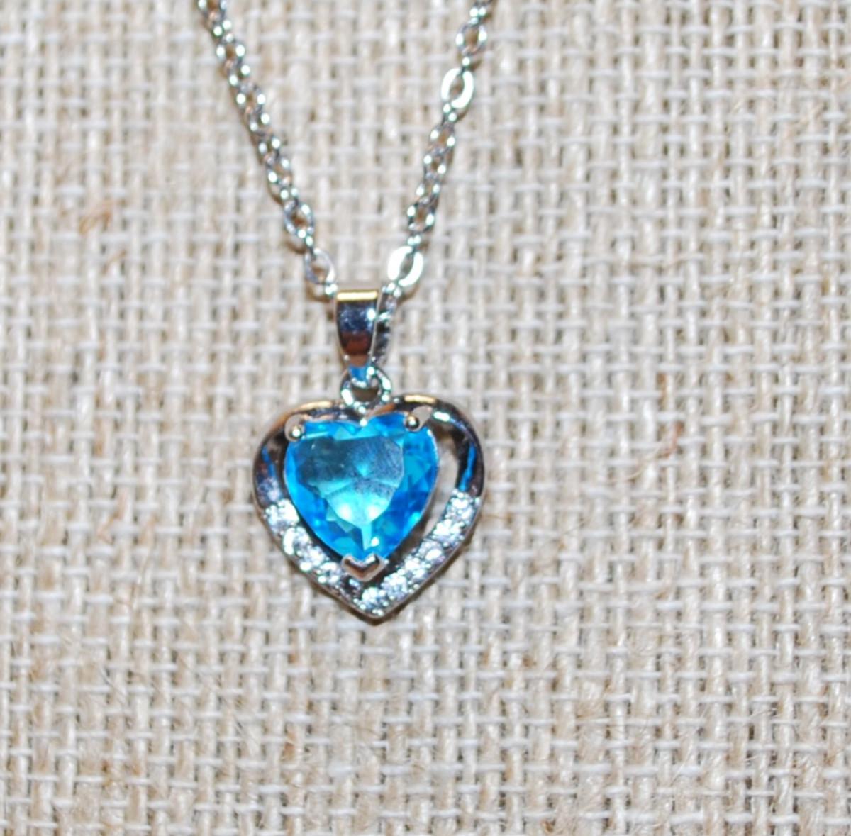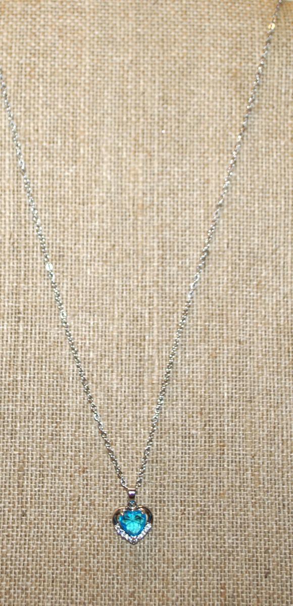 Heart Shaped Blue Stone PENDANT (¾" x ¾") in a Heart Full Surround Setting on a Silver Tone Necklace Chain 18" L