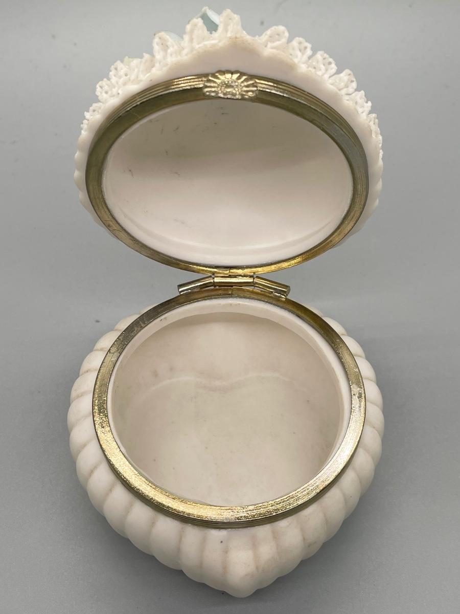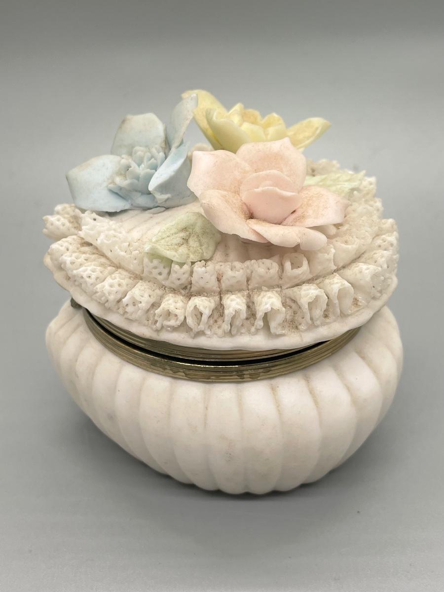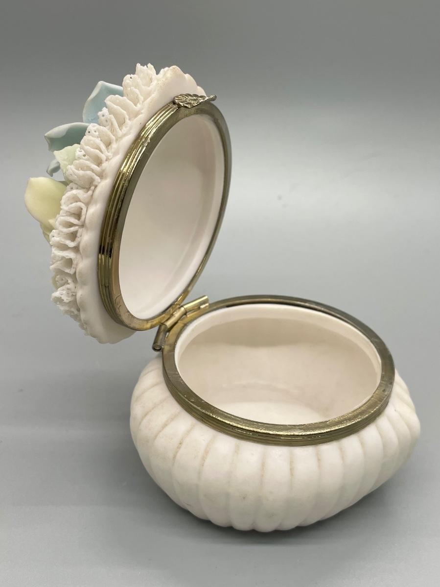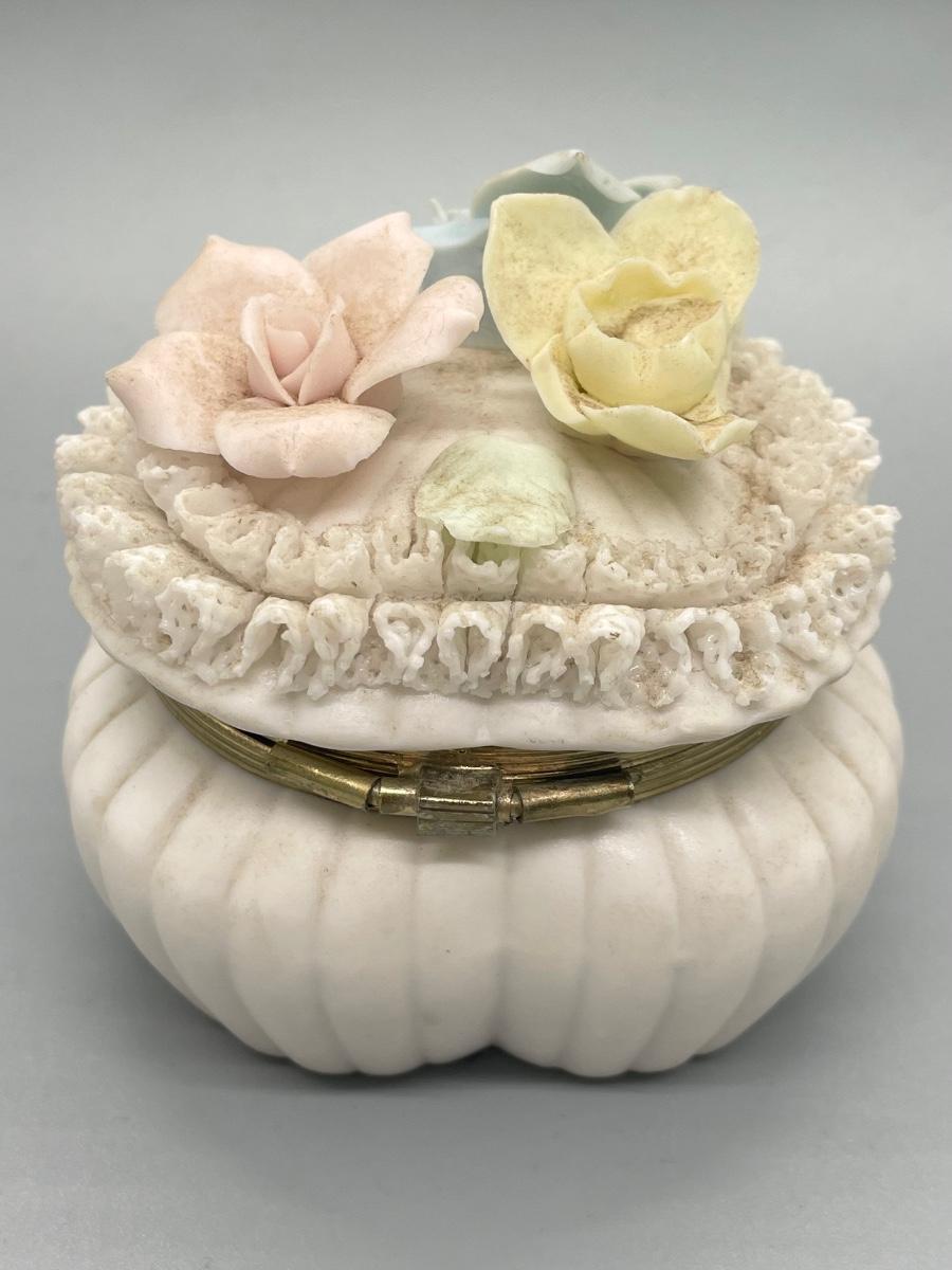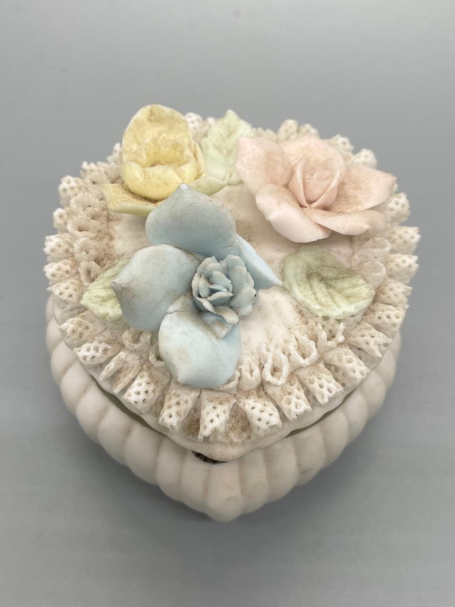 This item is in good condition. It is a bit dusty due to years of ownership. It opened pretty easy so be careful when holding it. The blue flower on the front has a little piece missing, but it’s not noticeable.