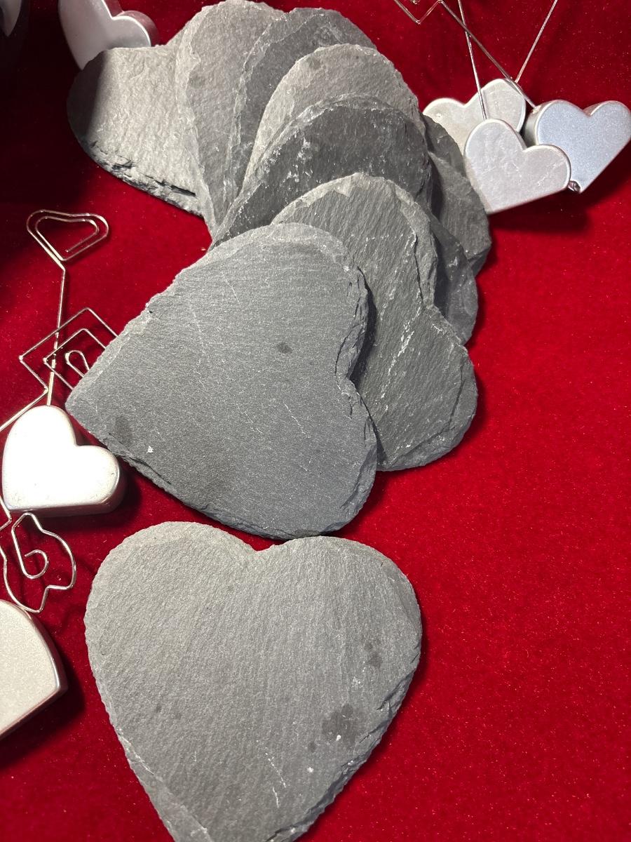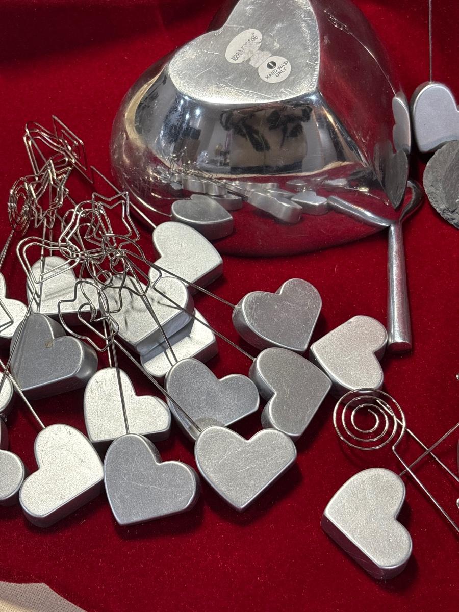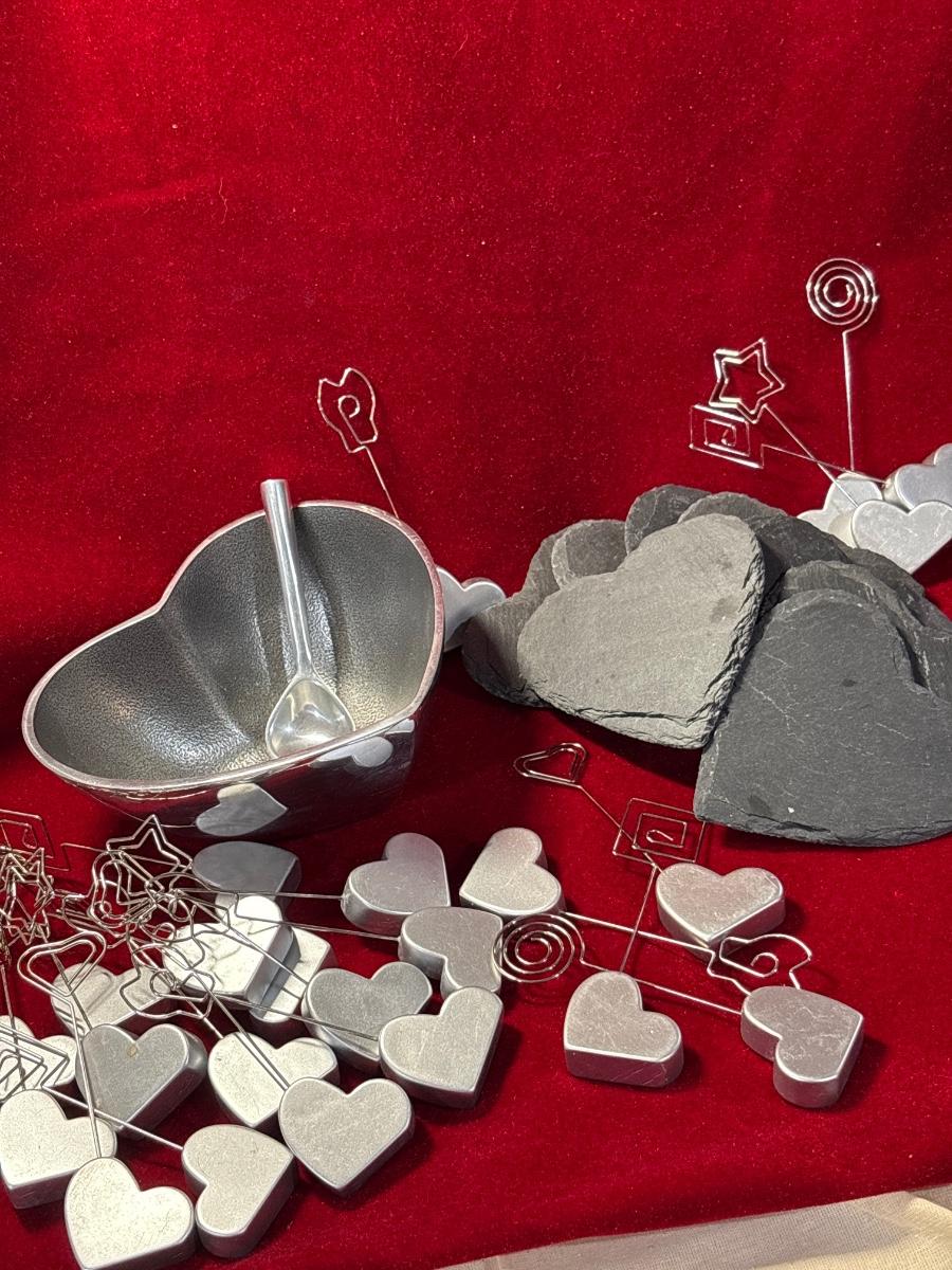 Eight black slate appetizer plates. Collection of place card/photo heart holders. Armetale like serving dish