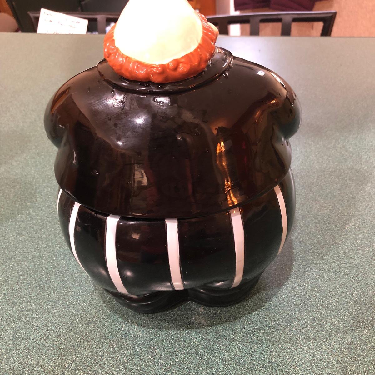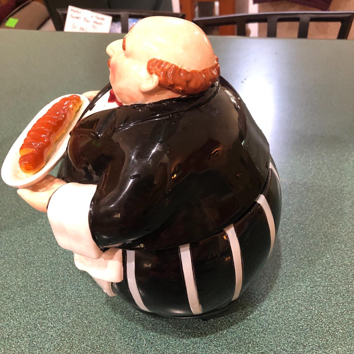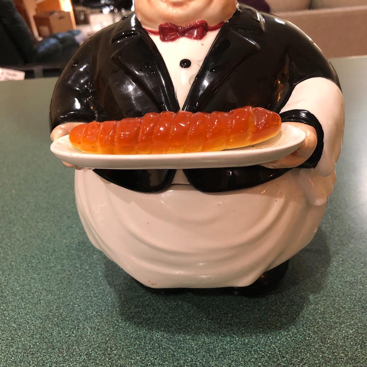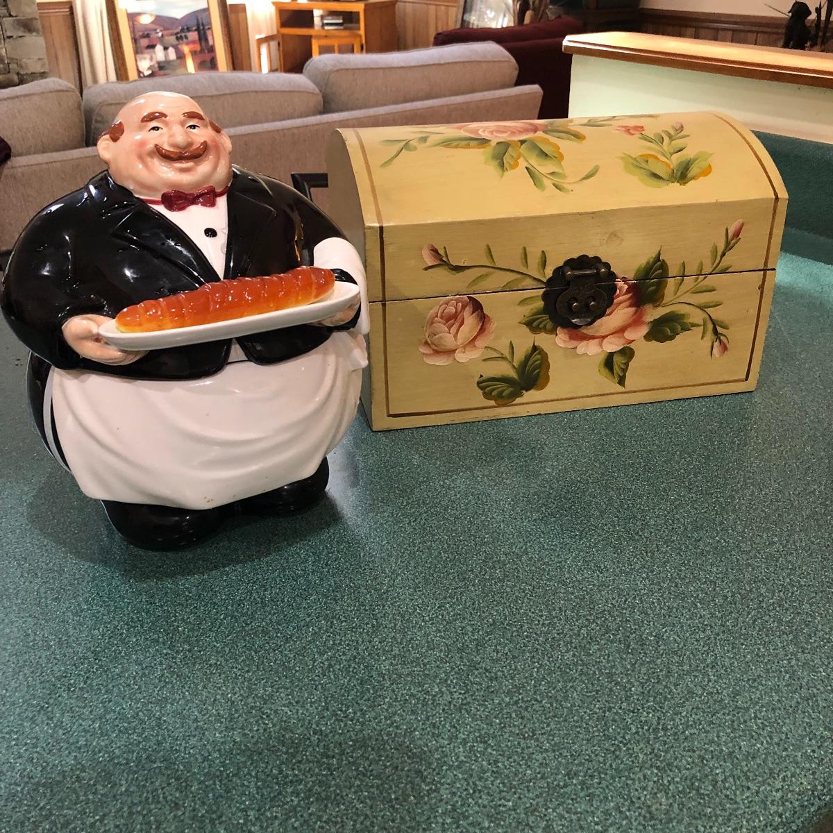 The cookie jar measures about 8” in diameter and is 11” tall. He has a small chip on the loaf tray. The recipe box measures 12.5” x 9” x 8”. It has two hinged handles on each end. Shipping Available.