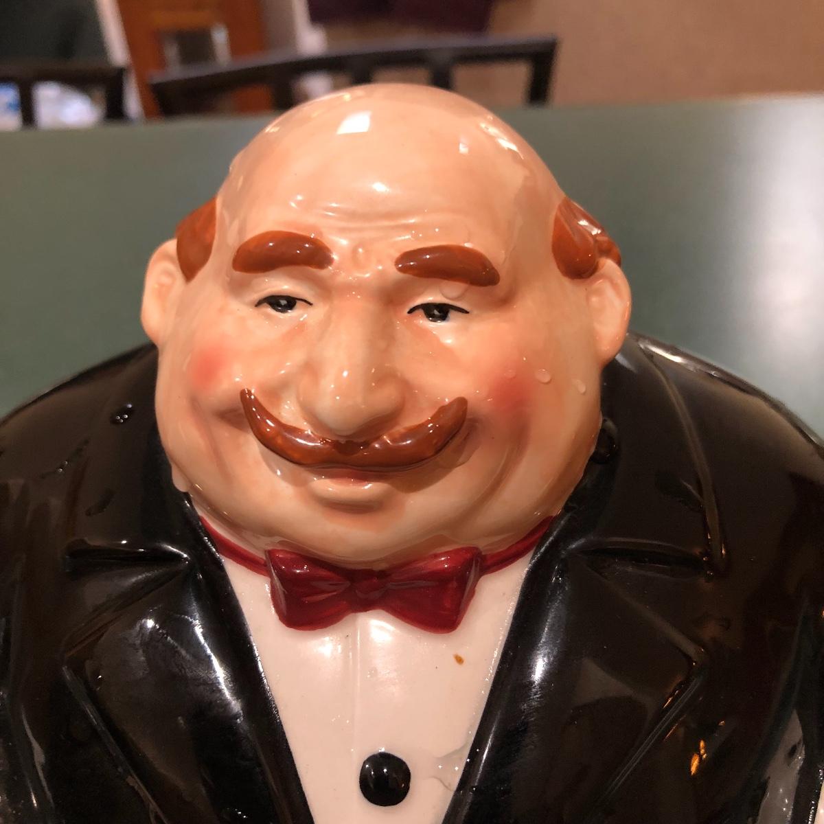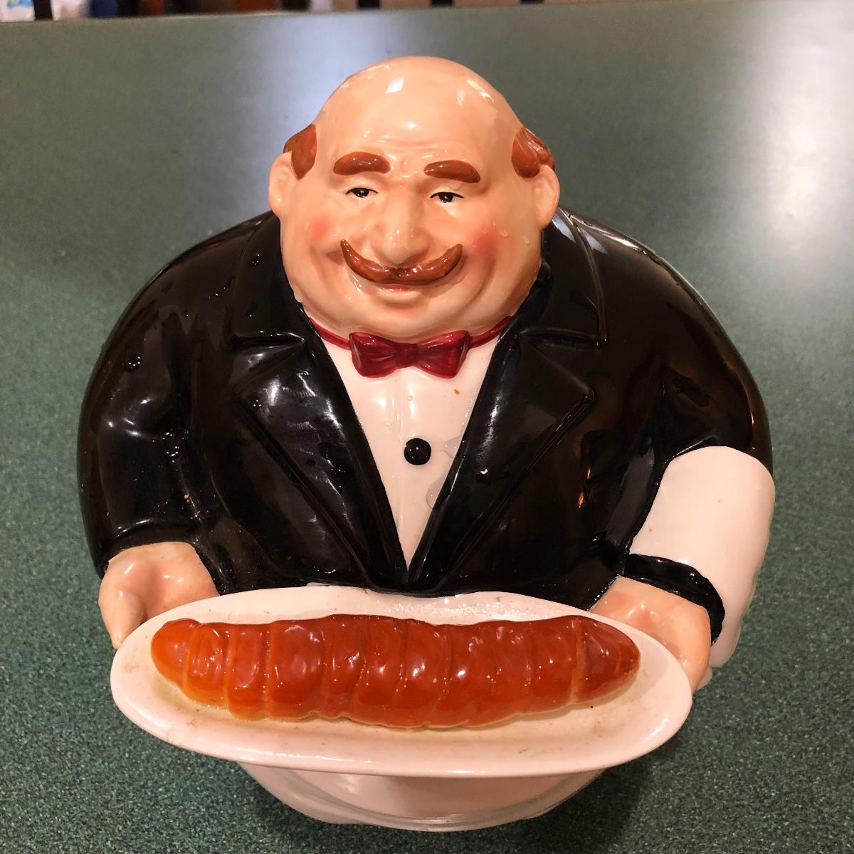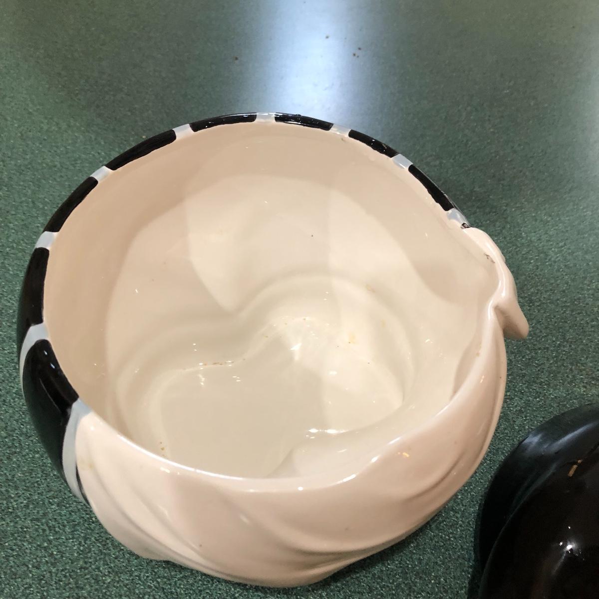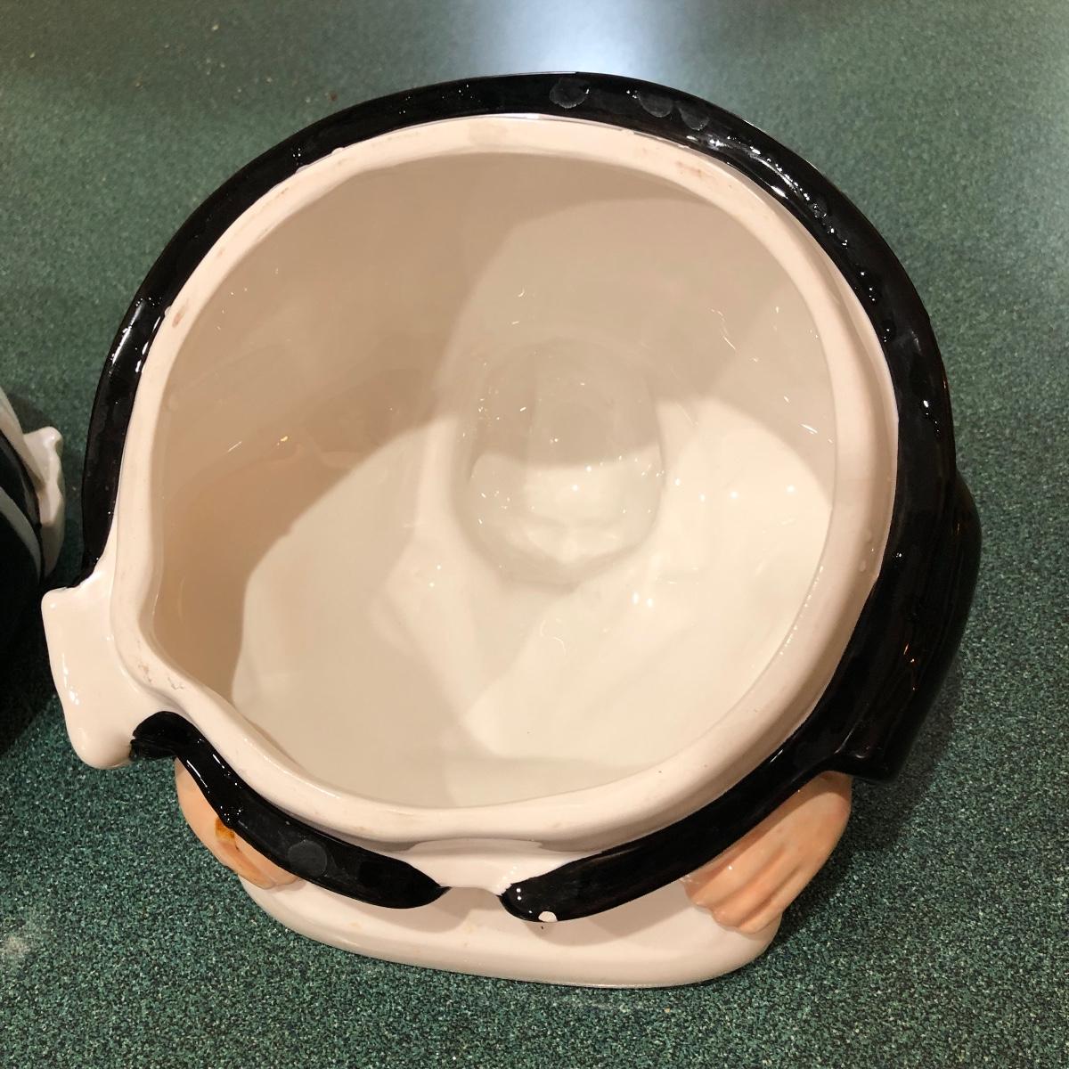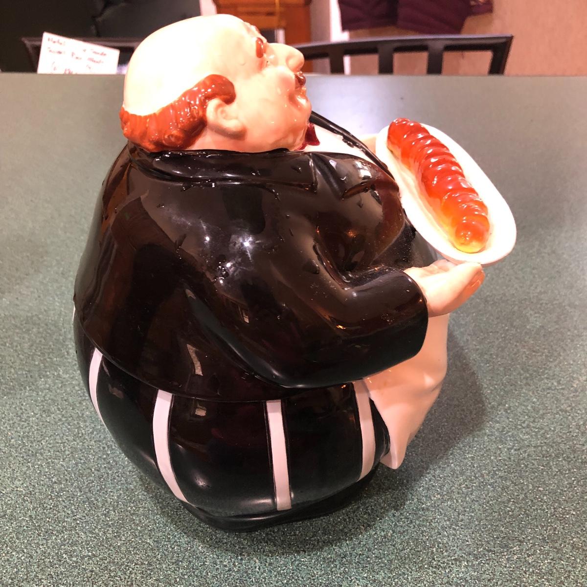 The cookie jar measures about 8” in diameter and is 11” tall. He has a small chip on the loaf tray. The recipe box measures 12.5” x 9” x 8”. It has two hinged handles on each end. Shipping Available.