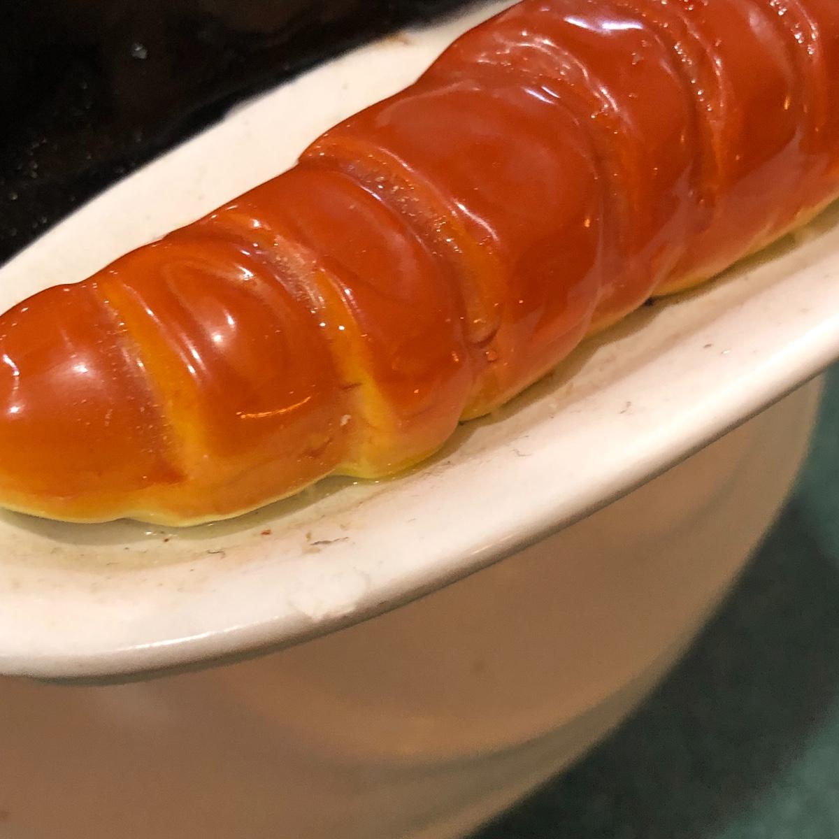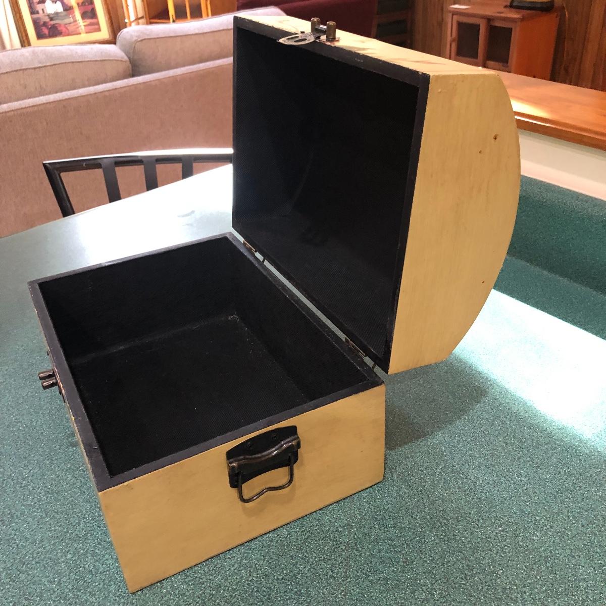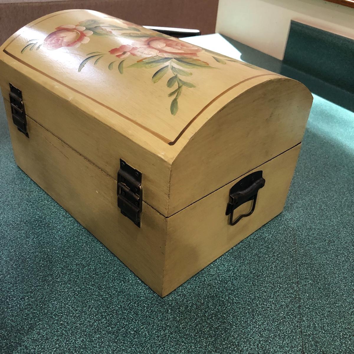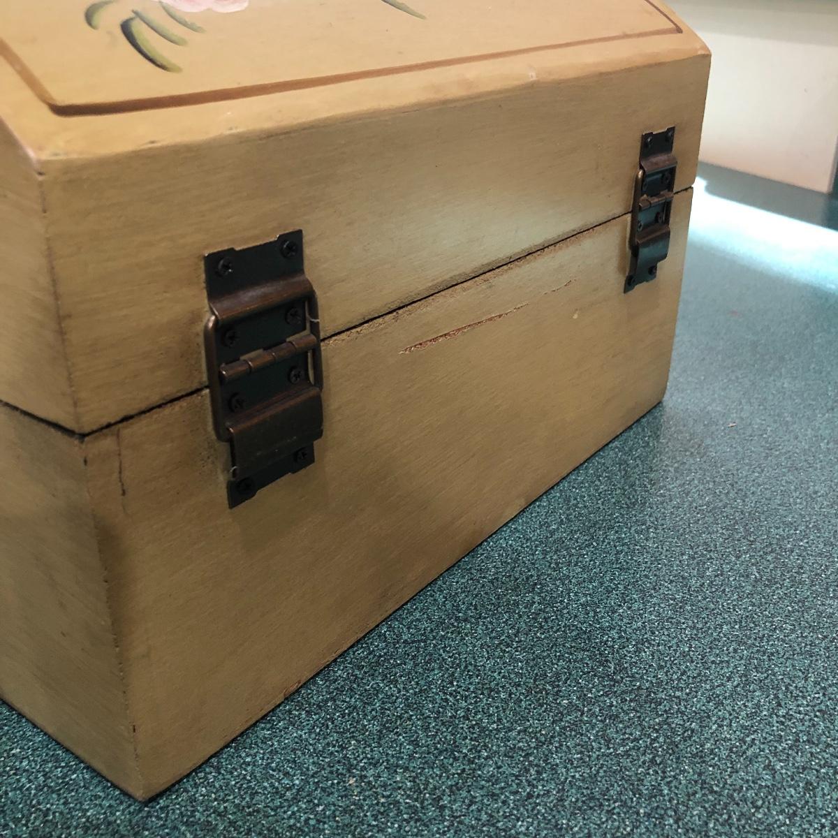 The cookie jar measures about 8” in diameter and is 11” tall. He has a small chip on the loaf tray. The recipe box measures 12.5” x 9” x 8”. It has two hinged handles on each end. Shipping Available.