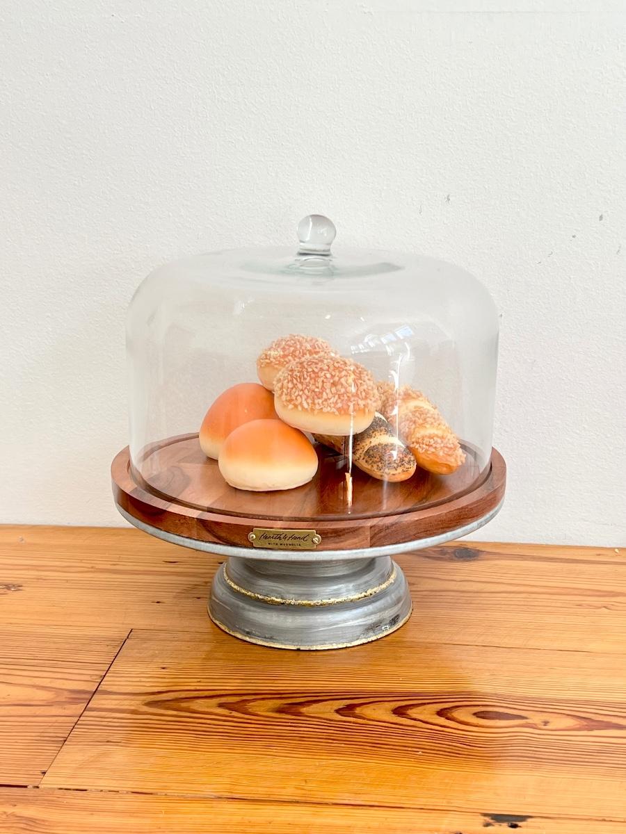 Includes bread decor ~ Stand with glass = 12” H x 11.5” Round ~ Without glass = 4.75” H ~ Fits a 5” H x 10” Round cake