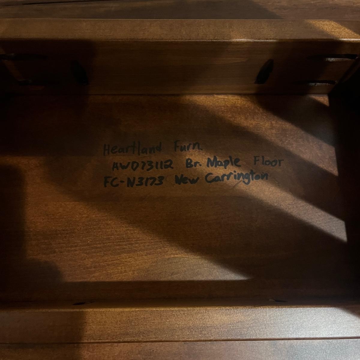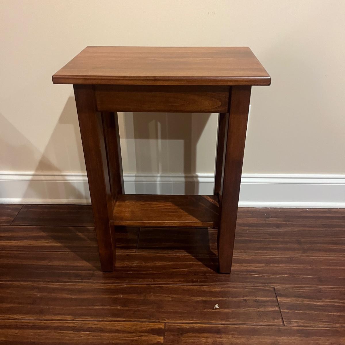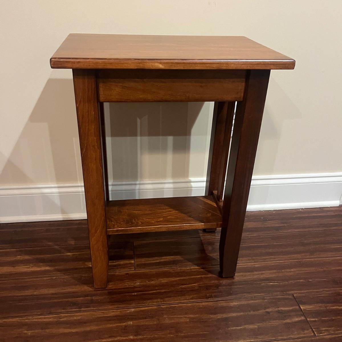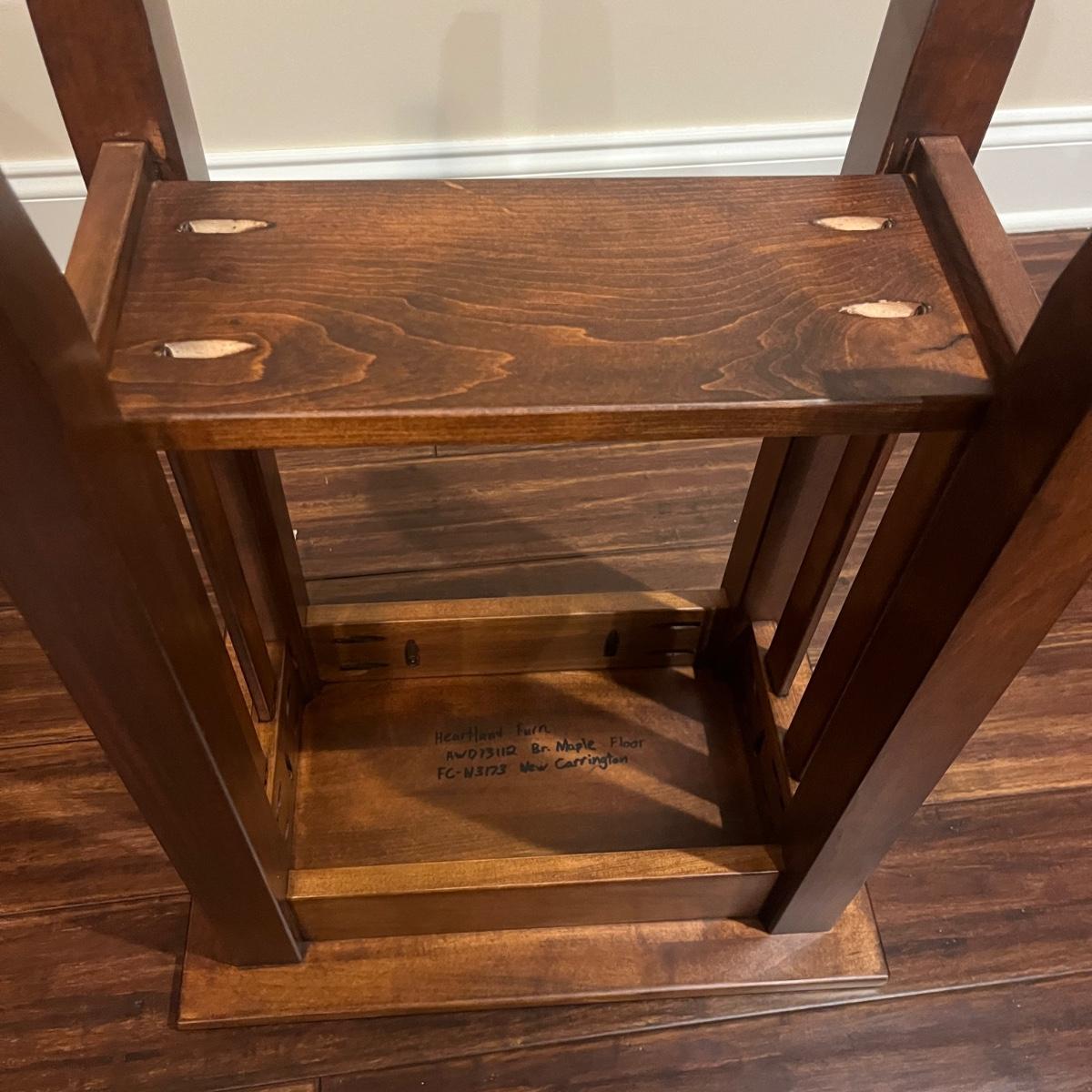 Lot includes a solid wood Heartland Furniture Mission style side table. It features a lower shelf.