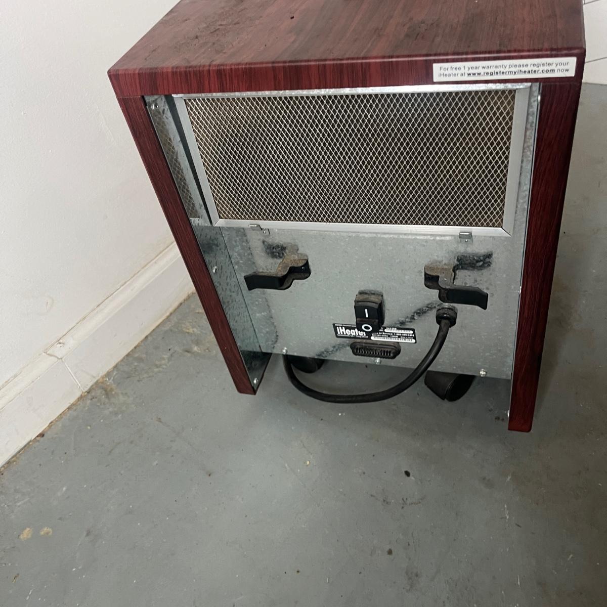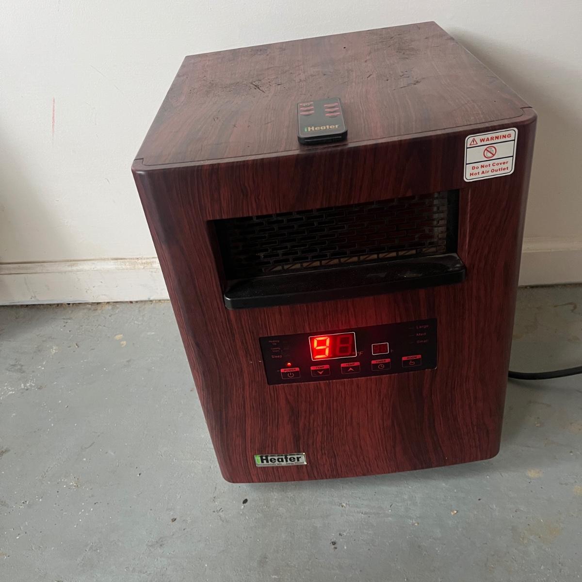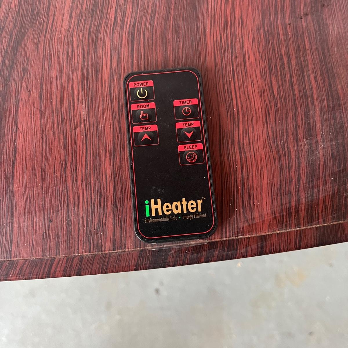 Lot includes a portable room heater with remote made by "Iheater". Heater powered on when plugged in. Heater measures 13” x 15” x 17”H and has wheels.