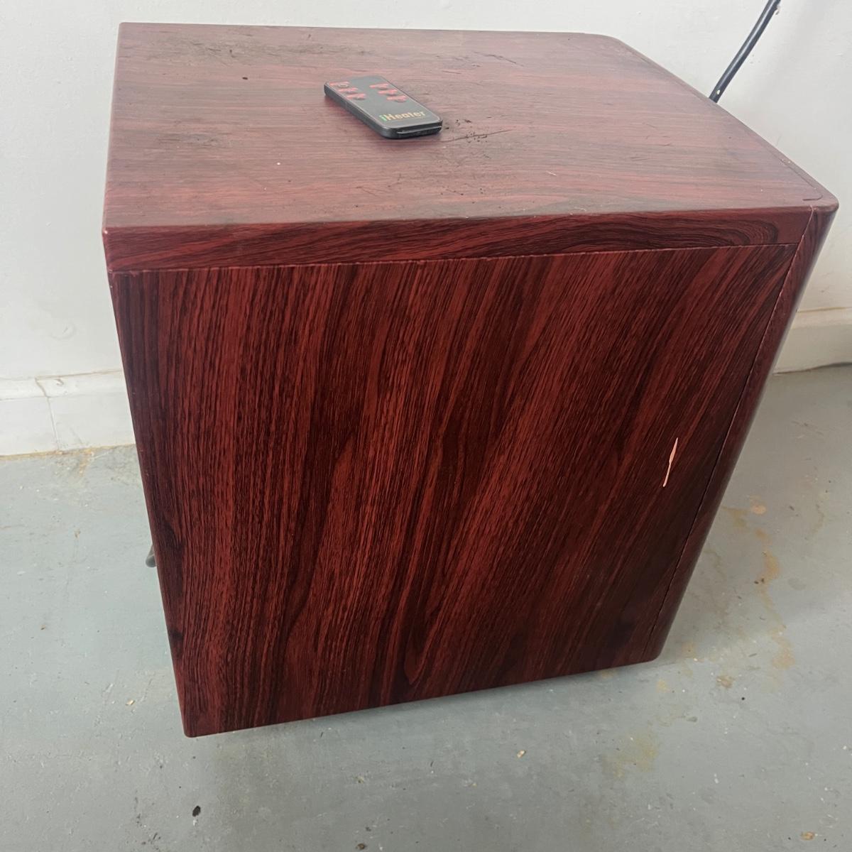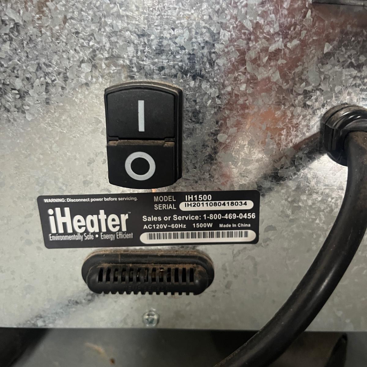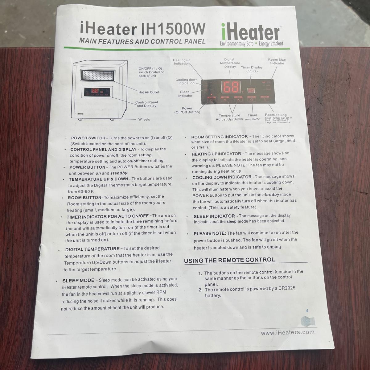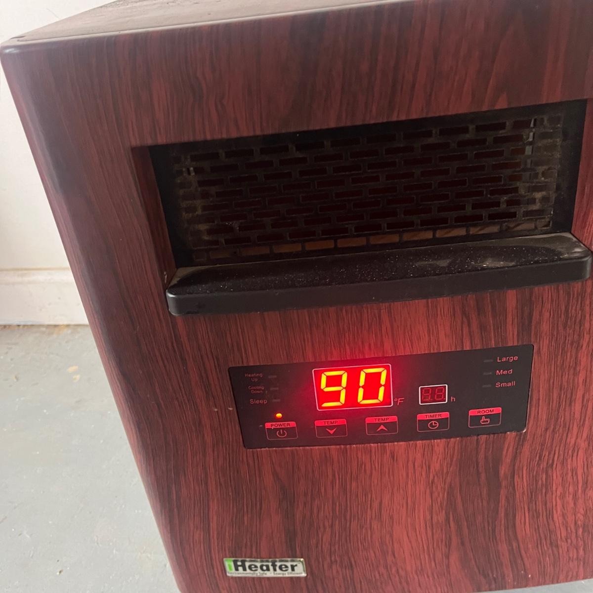 Lot includes a portable room heater with remote made by "Iheater". Heater powered on when plugged in. Heater measures 13” x 15” x 17”H and has wheels.