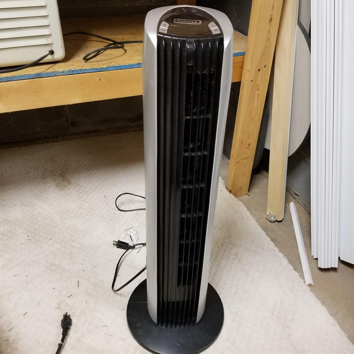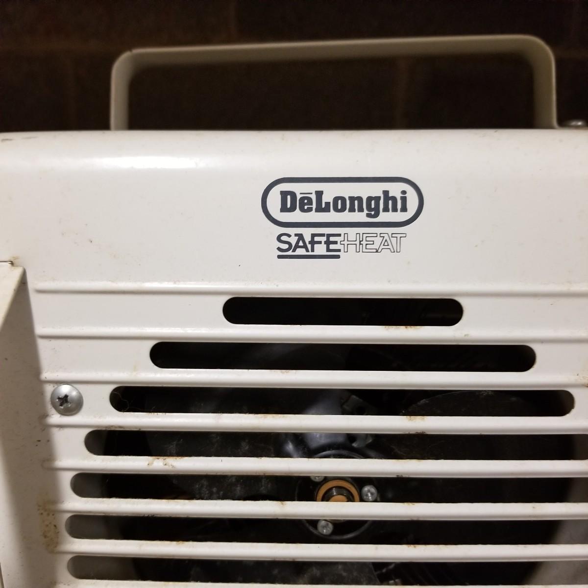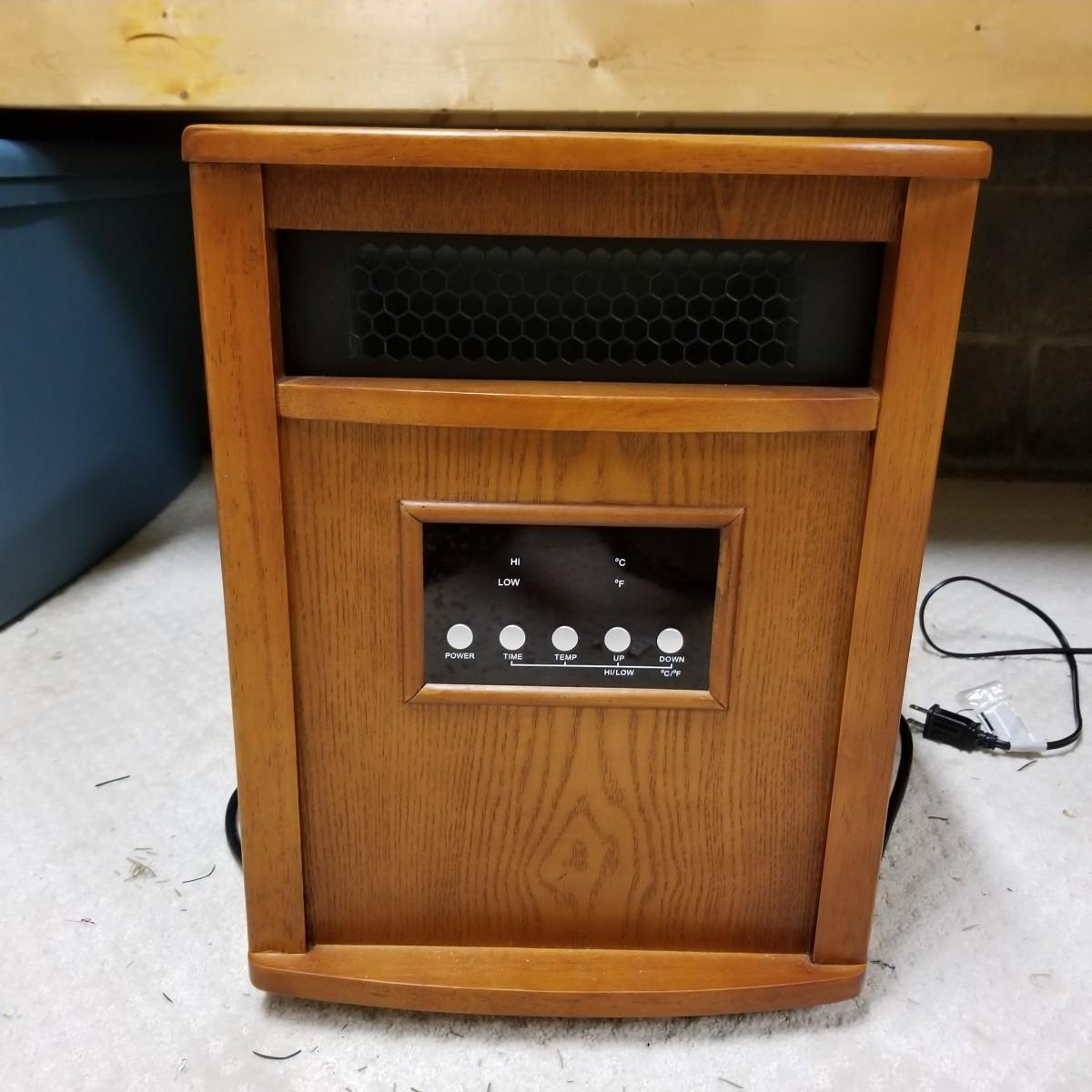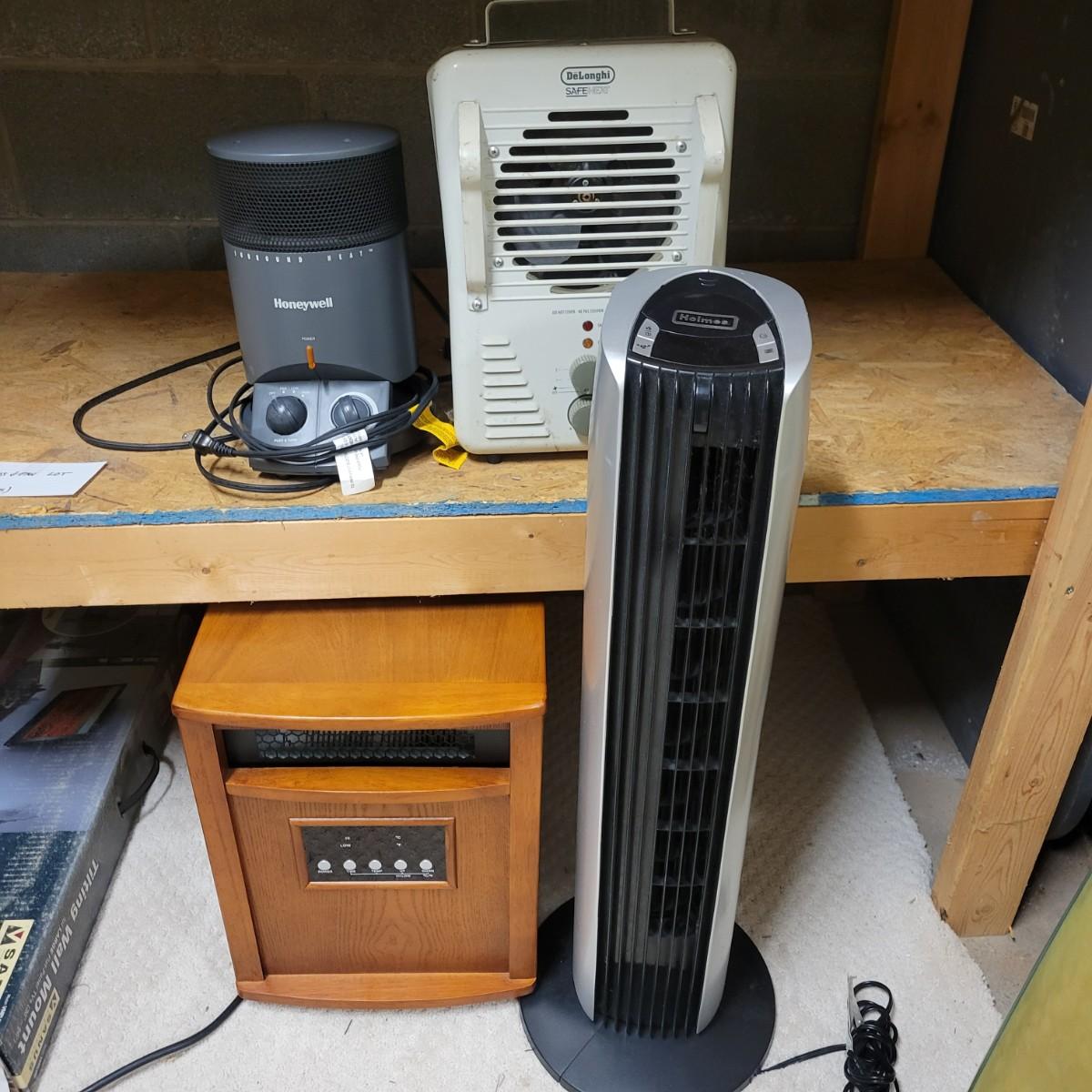 Three portable space heaters and one tower fan. One DeLonghi SafeHeat heater with two heat settings and tip over switch, has a small dent on the side & measures 10" x 7" x 16". One Shenzhen infrared heater with wood case that has digital readout and settings and measures 13" x 15" x 17". One Honeywell surround heat that is 8”D x 11” tall. One Holmes oscillating tower fan with three speeds and timer function, that measures 11" x 32". All items powered on when tested. See photos for details. Local pickup only.