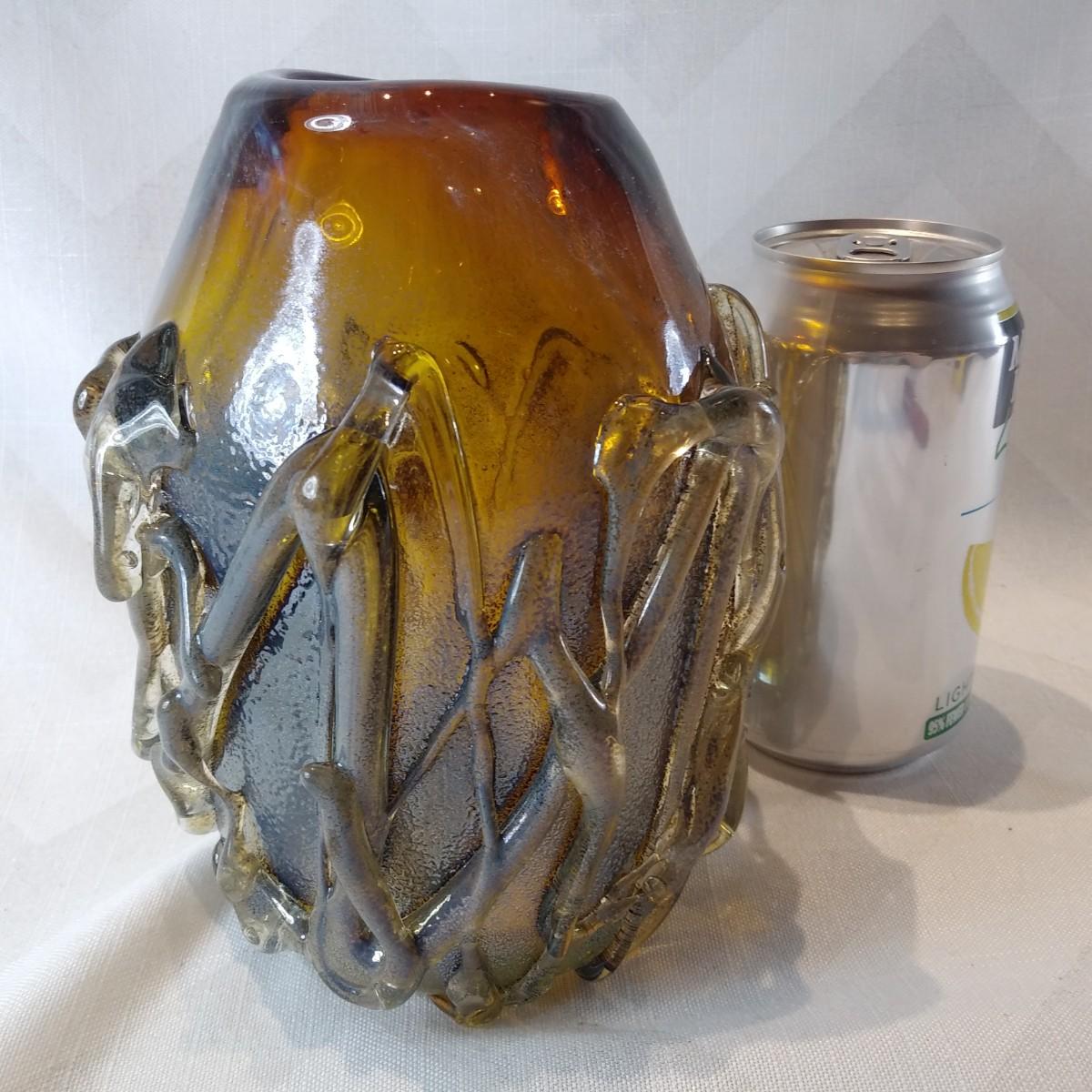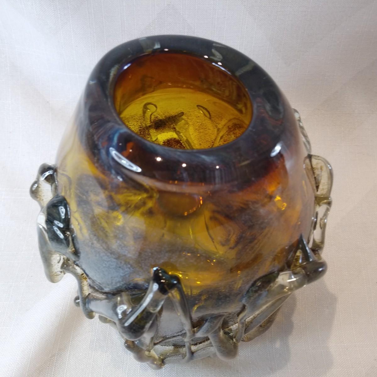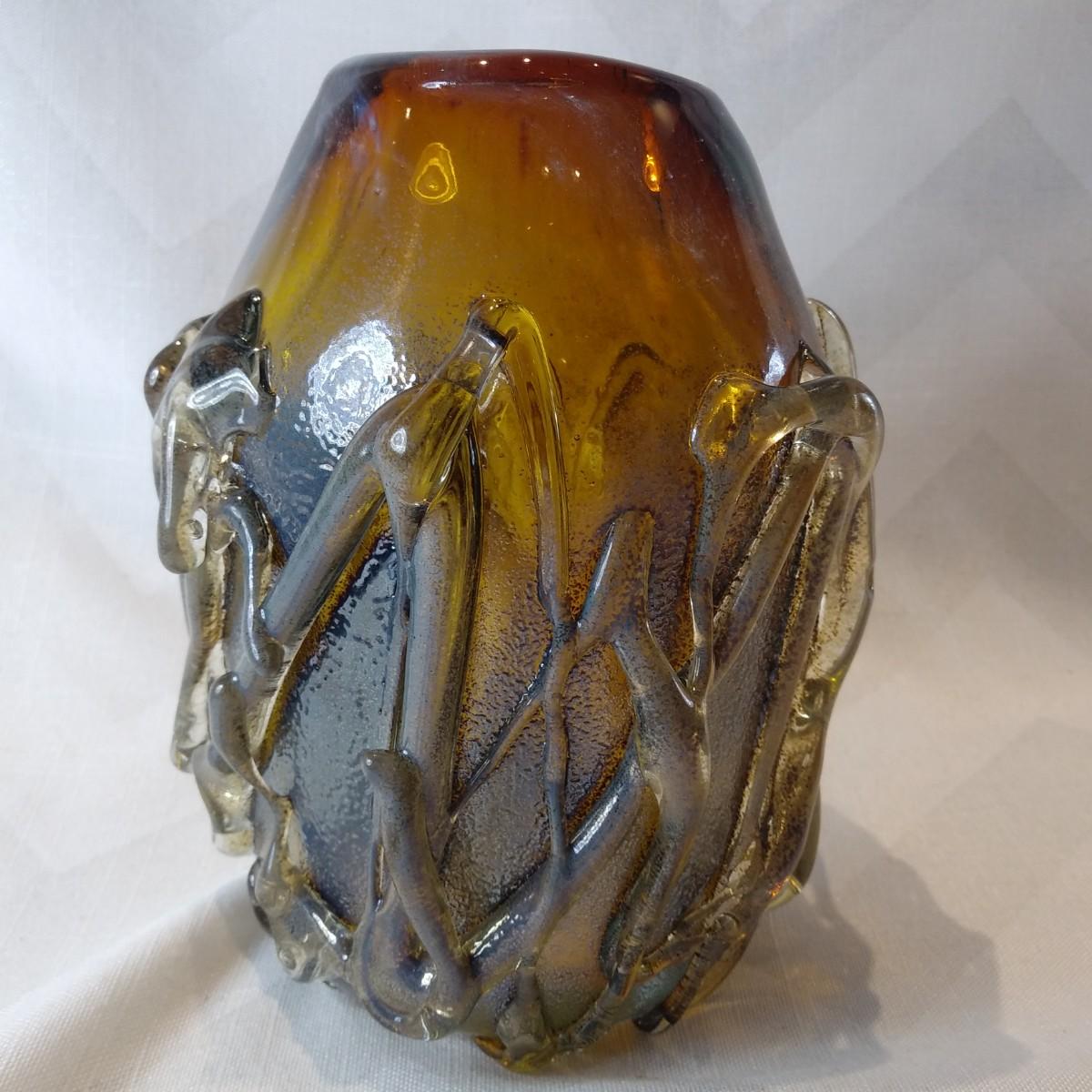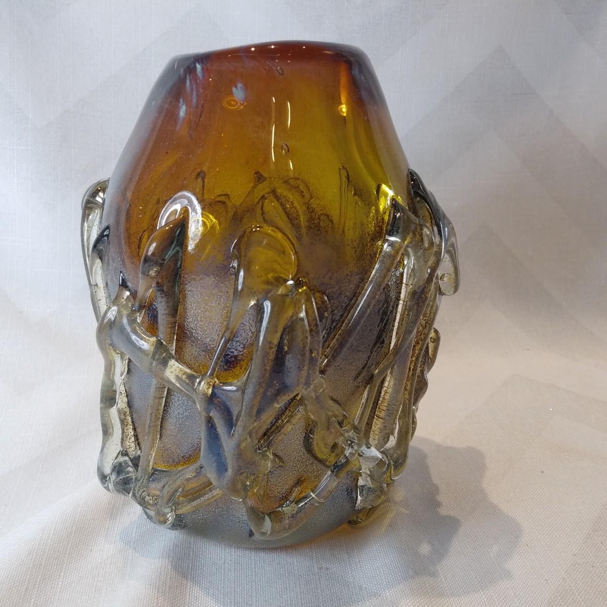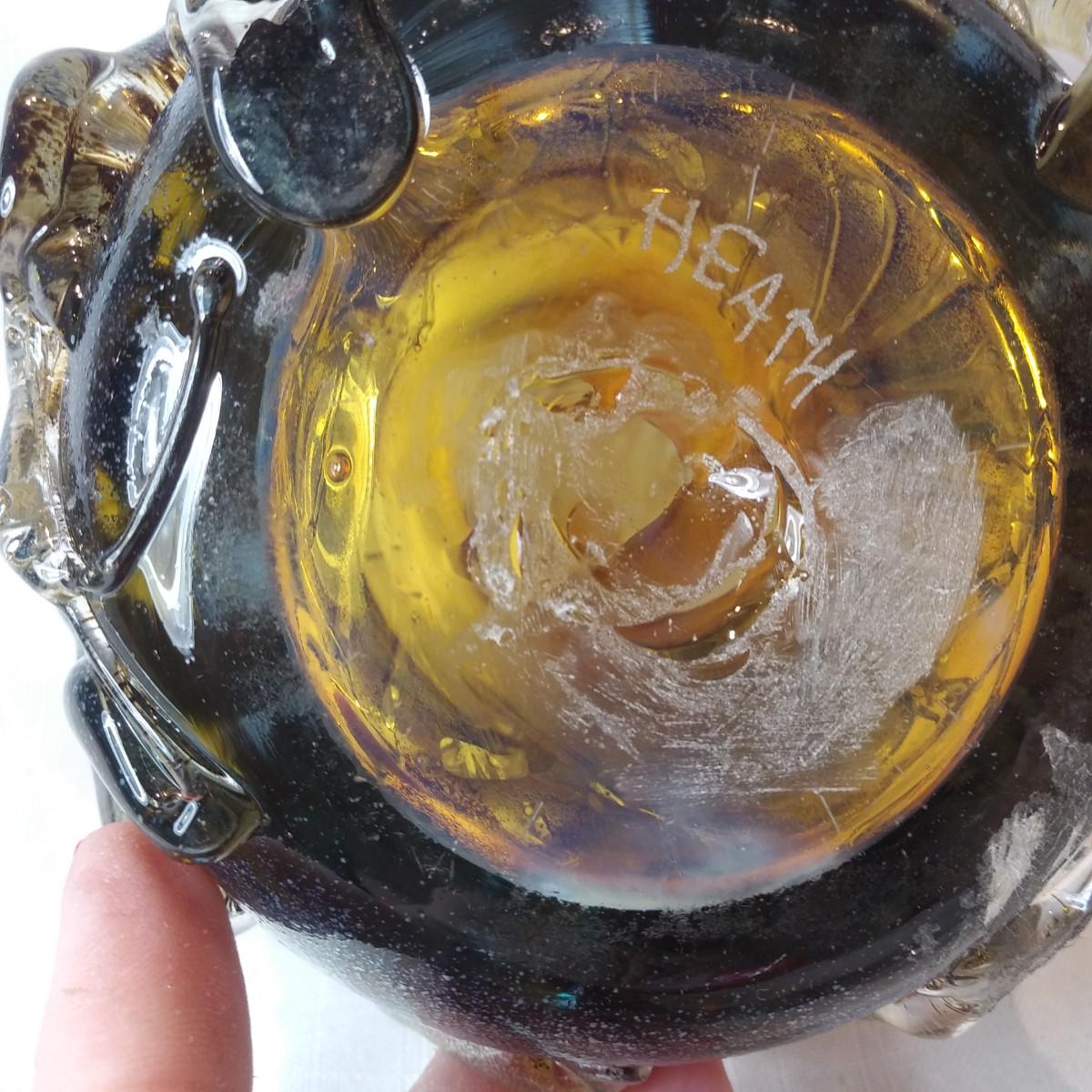 This auction lot is for a Heath Art Glass Vase. This item is signed Heath on the bottom. We are not sure If this item is the work of Gavin Heath who is known for working in a very primitive style and producing mostly renditions of animals and tribal dolls based on his upbringing in South Africa. It would be an unusual and rare piece for him. He works out of his studio in Laguna Beach, CA.. This vase has wonderful colors of ambers and blue greys and is in fine condition.