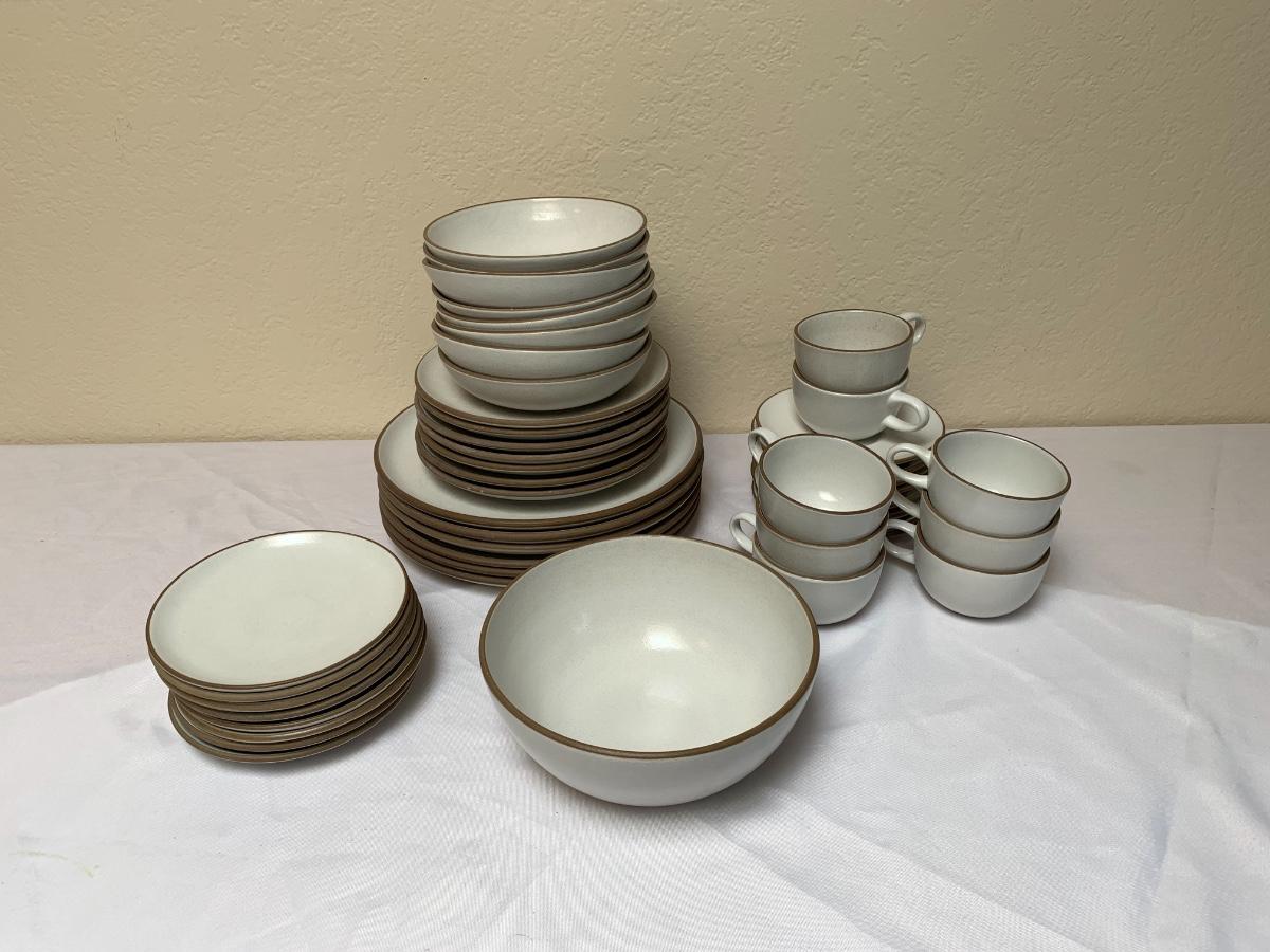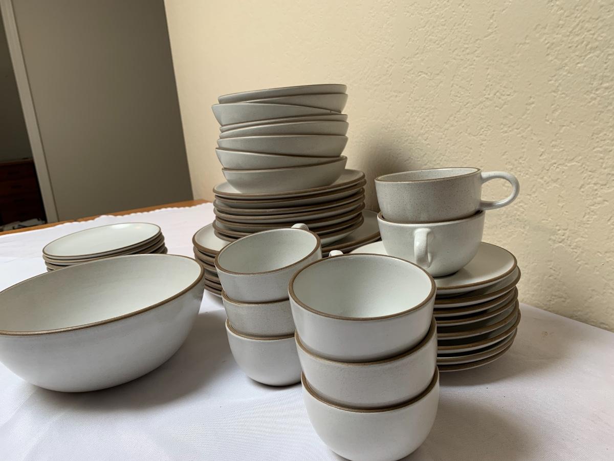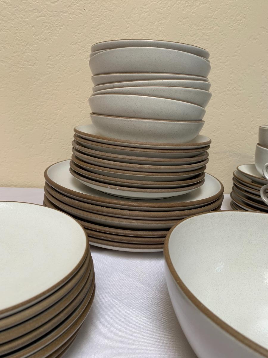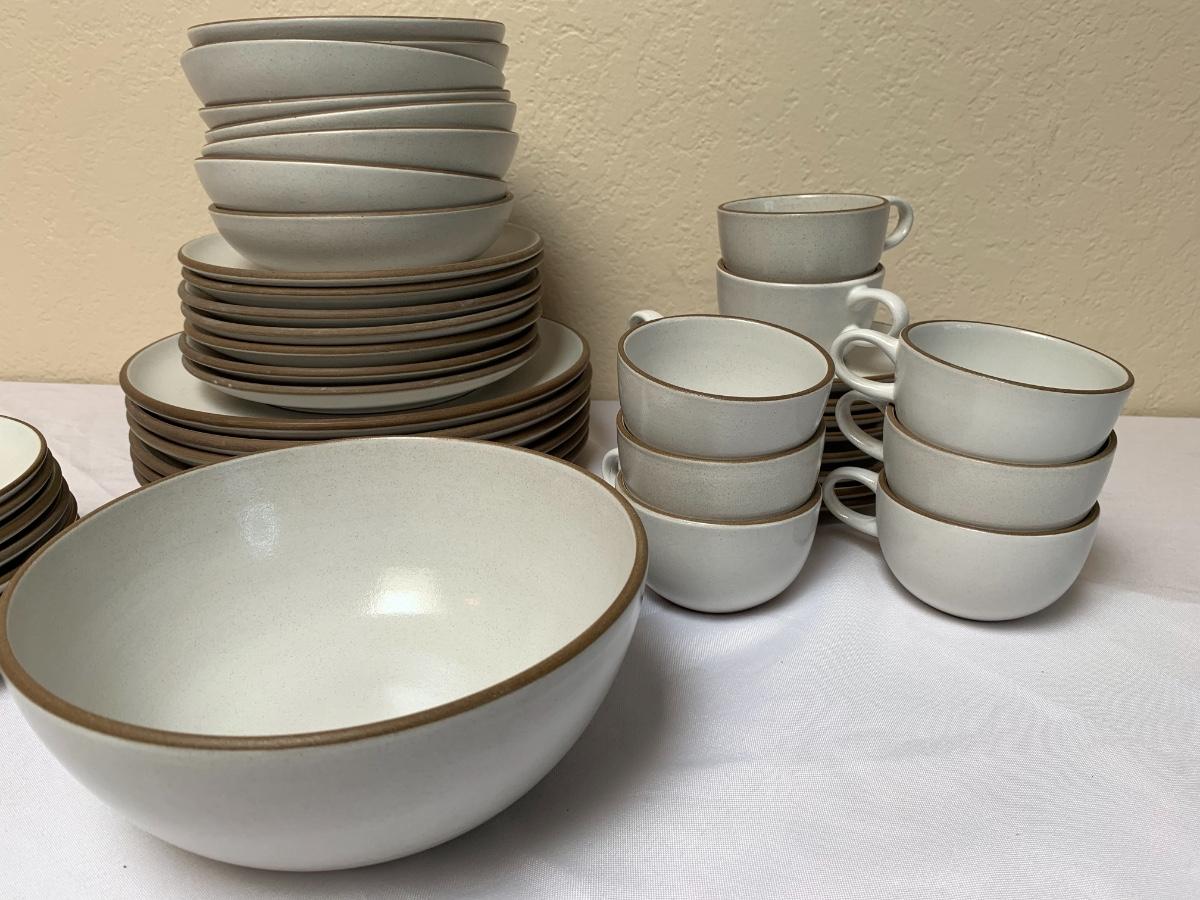 Heath Pottery Dishes Made in USA, Sausalito, CA. 6 dinner plates, 7 salad plates, 8 bowls, 8 dessert plates, 1 serving bowl, 8 cups, 8 saucers.