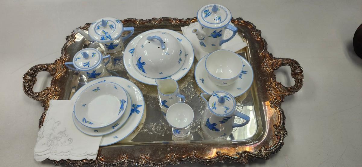 Included are: 2 piece cloche, coffeepot, teapot, milk jug with a cover, sugar with lid and a creamer,