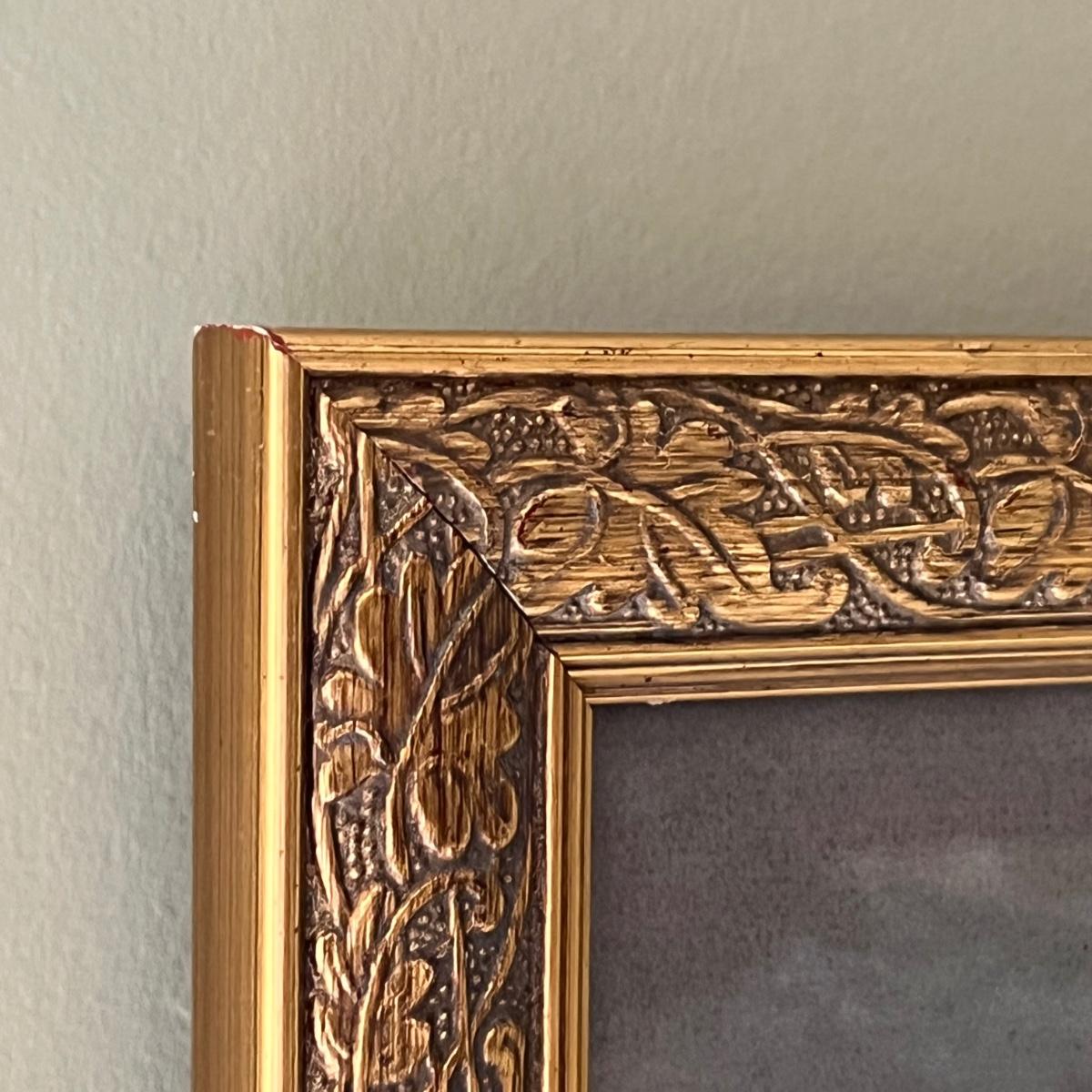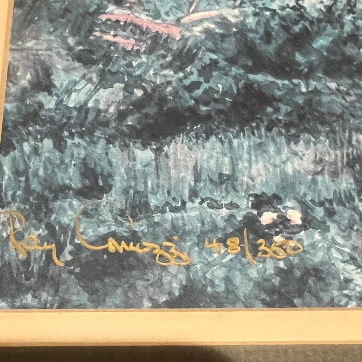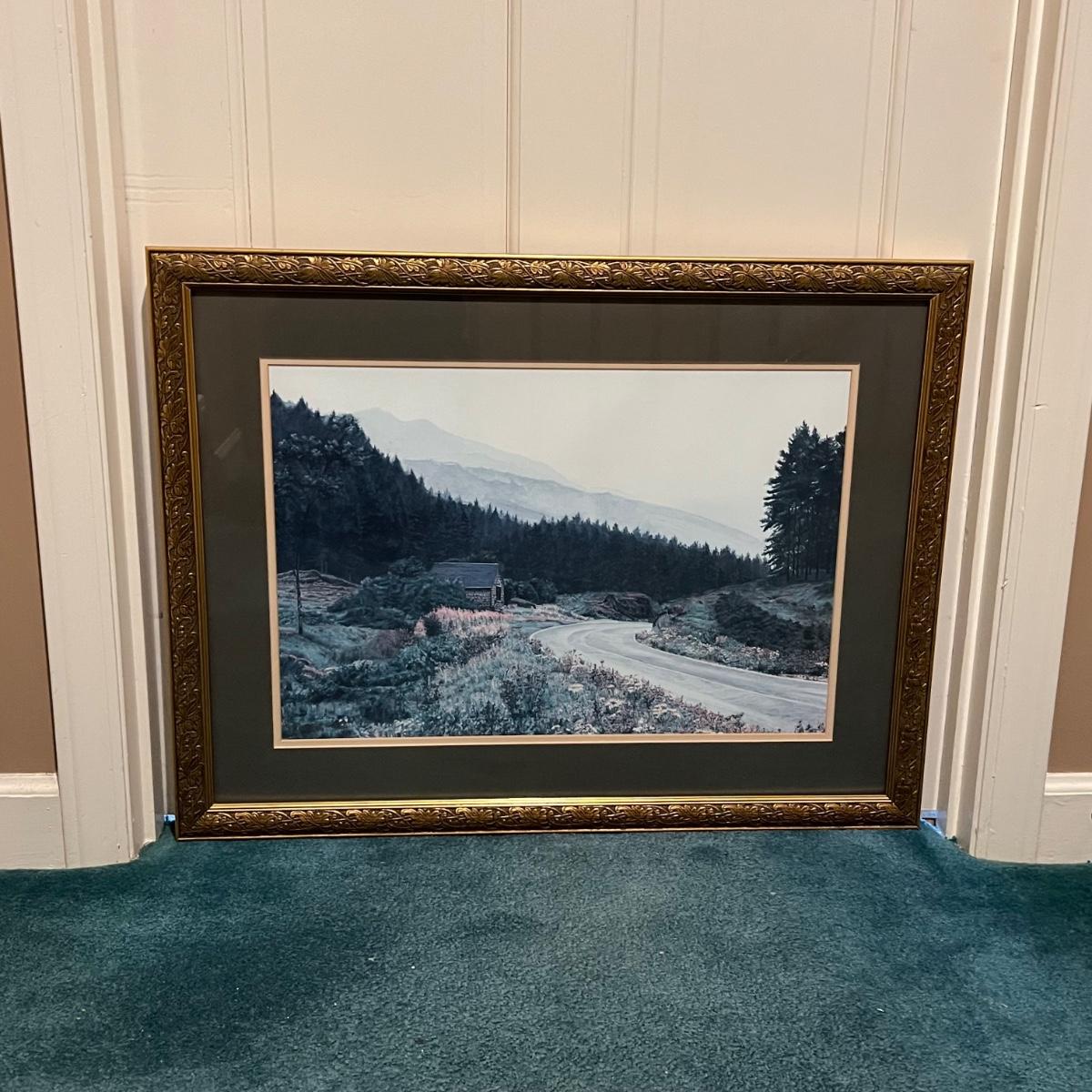 Beautiful mountain scene with a small stone barn. This print has a signature and numbered 48/350. Mounted under glass in a gilded wooden frame which measures 29” x 22.5”H.