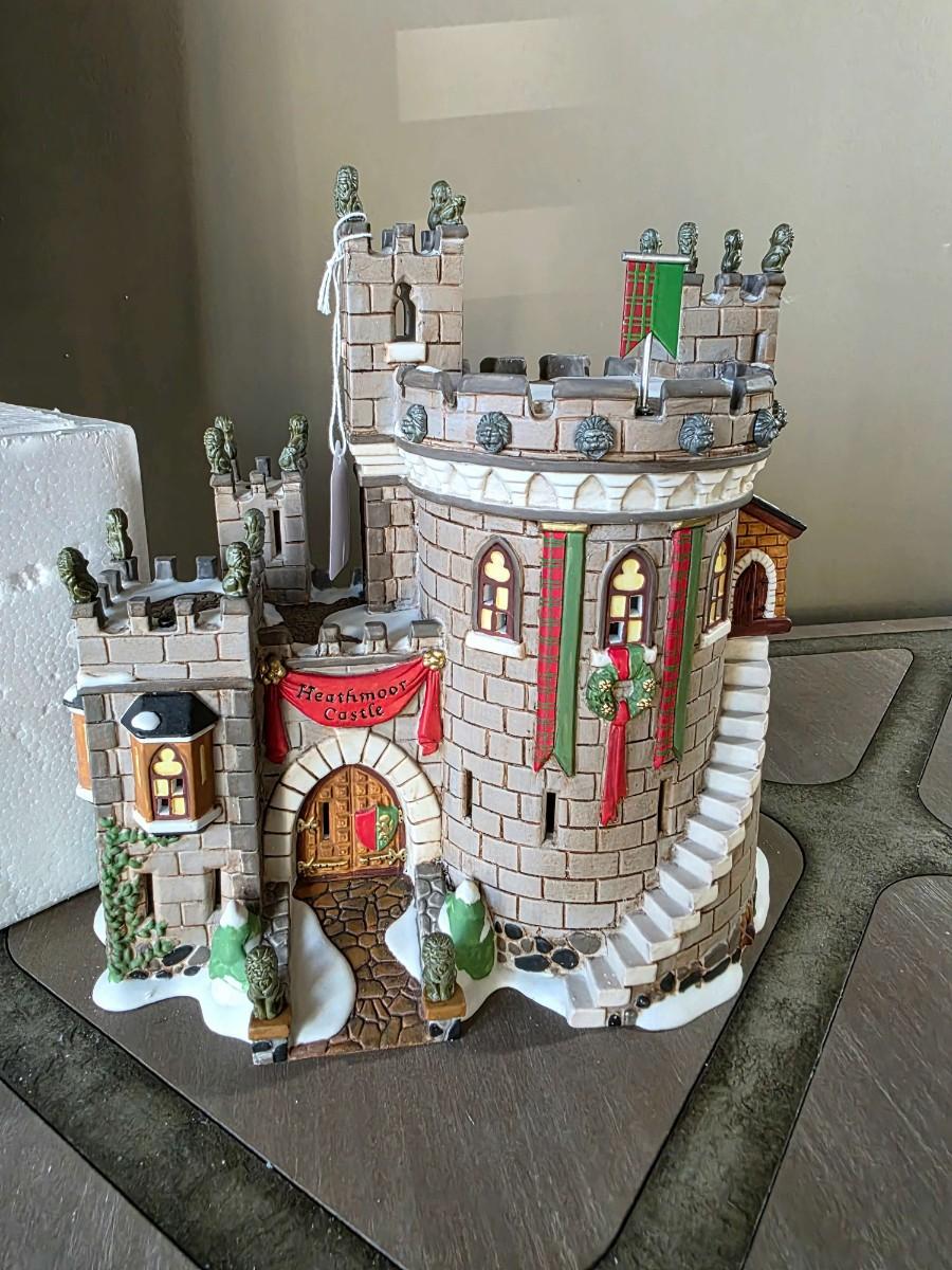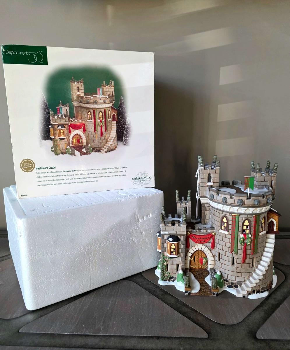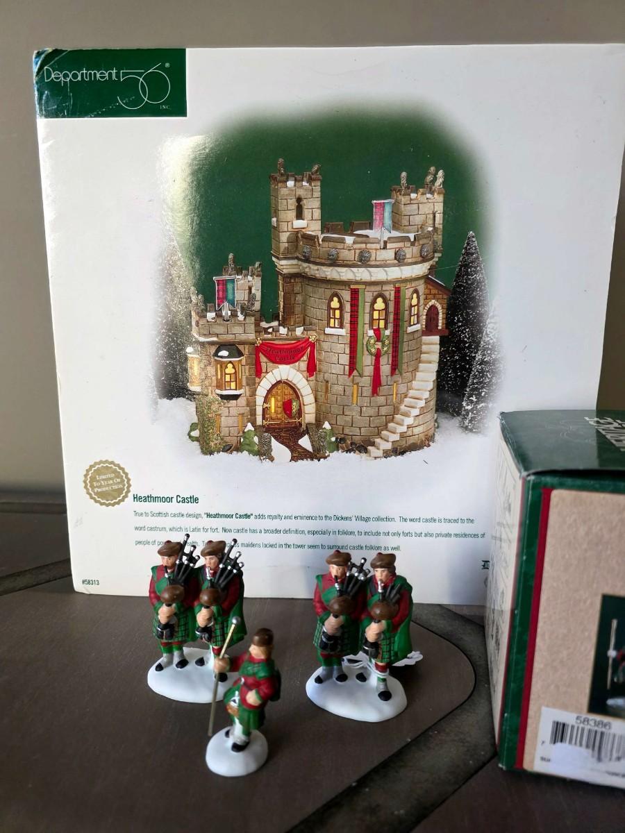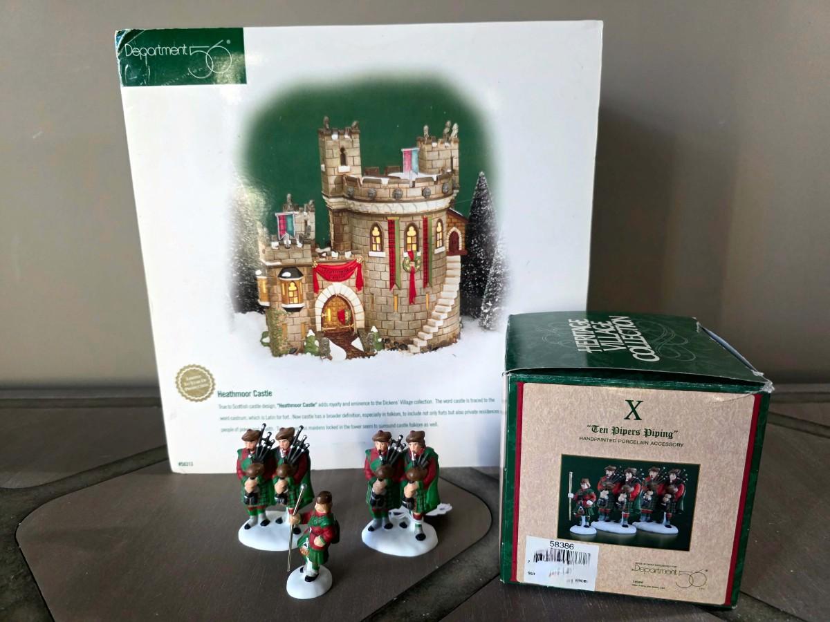 Dept. 56 Dickens Village, "Heathmoor Castle" lot includes castle in original box and "Five Pipers Piping."