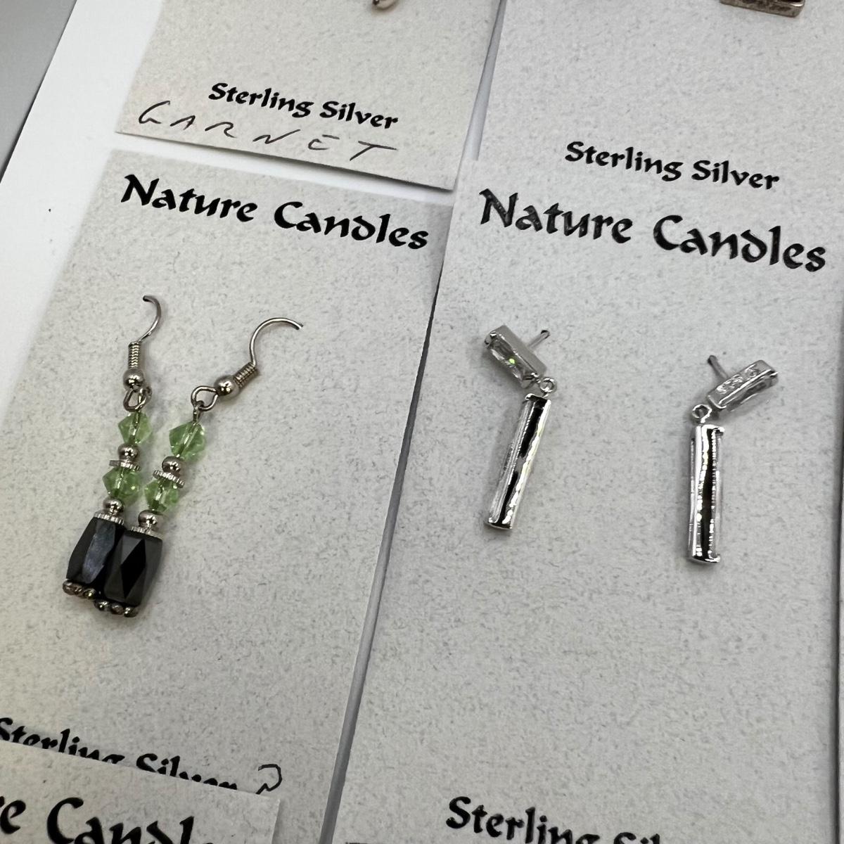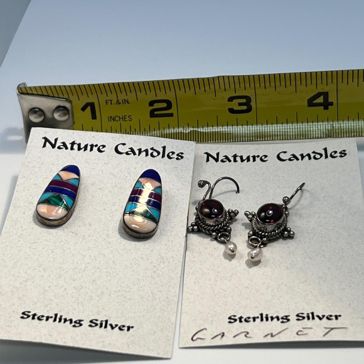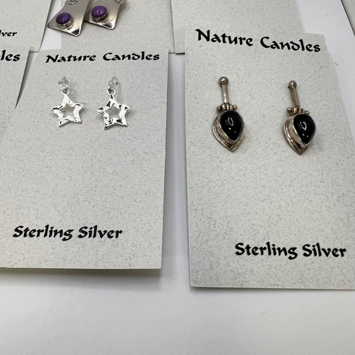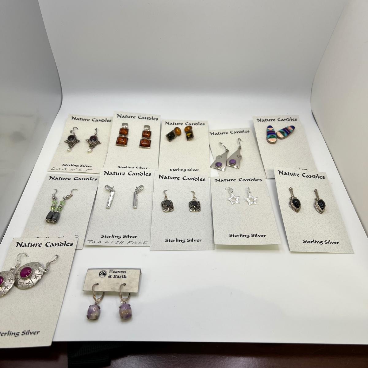 A dozen pairs of earrings, all but one are mounted on Nature Candles cards and are sterling. The one pair of Heaven & Earth have no known marking. One pair have magnetic hematite stones. See images for full inventory and measurements.