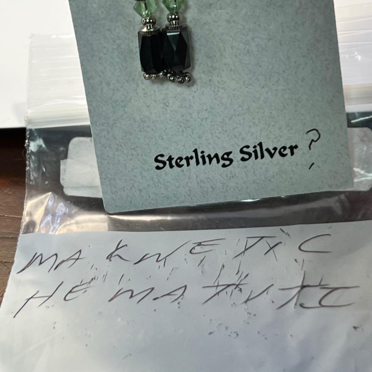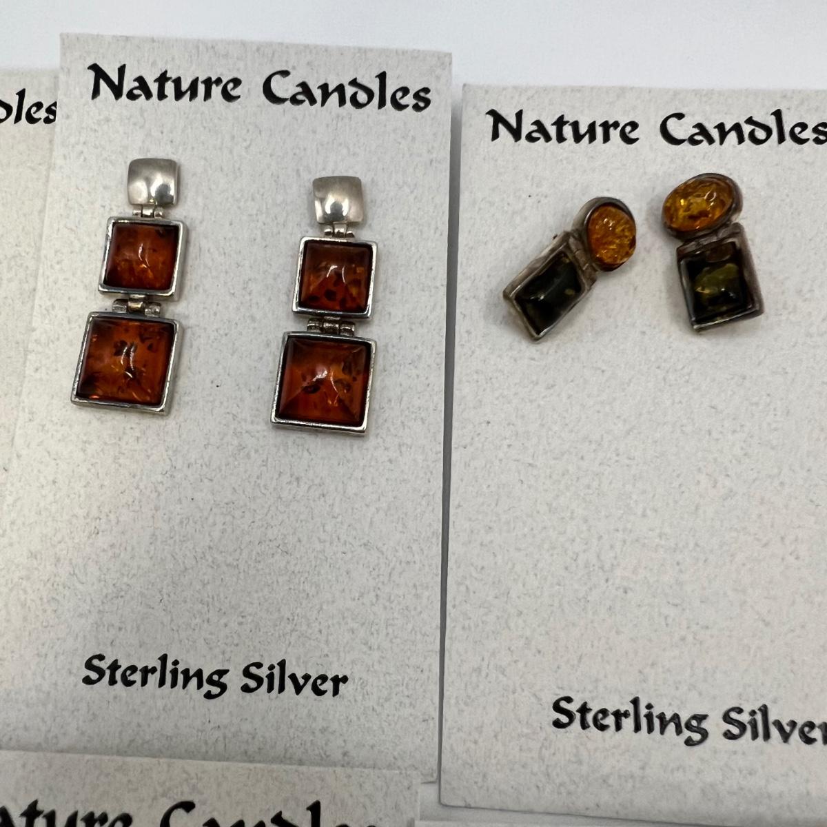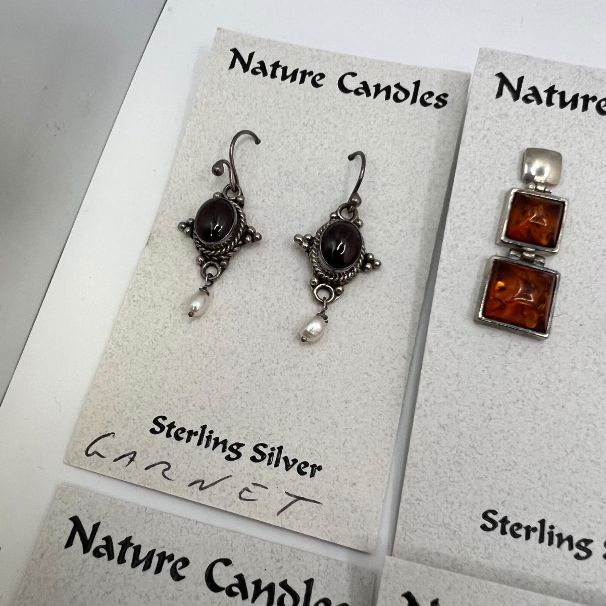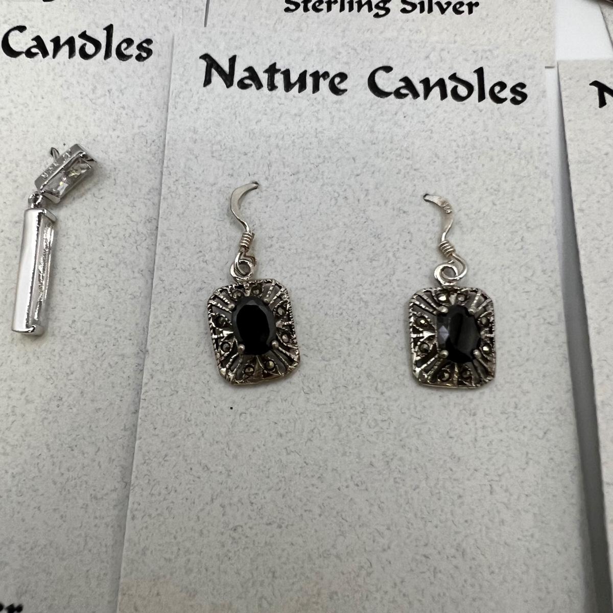 A dozen pairs of earrings, all but one are mounted on Nature Candles cards and are sterling. The one pair of Heaven & Earth have no known marking. One pair have magnetic hematite stones. See images for full inventory and measurements.