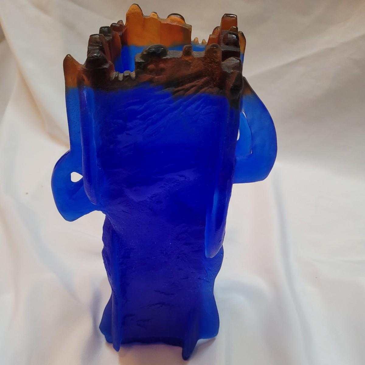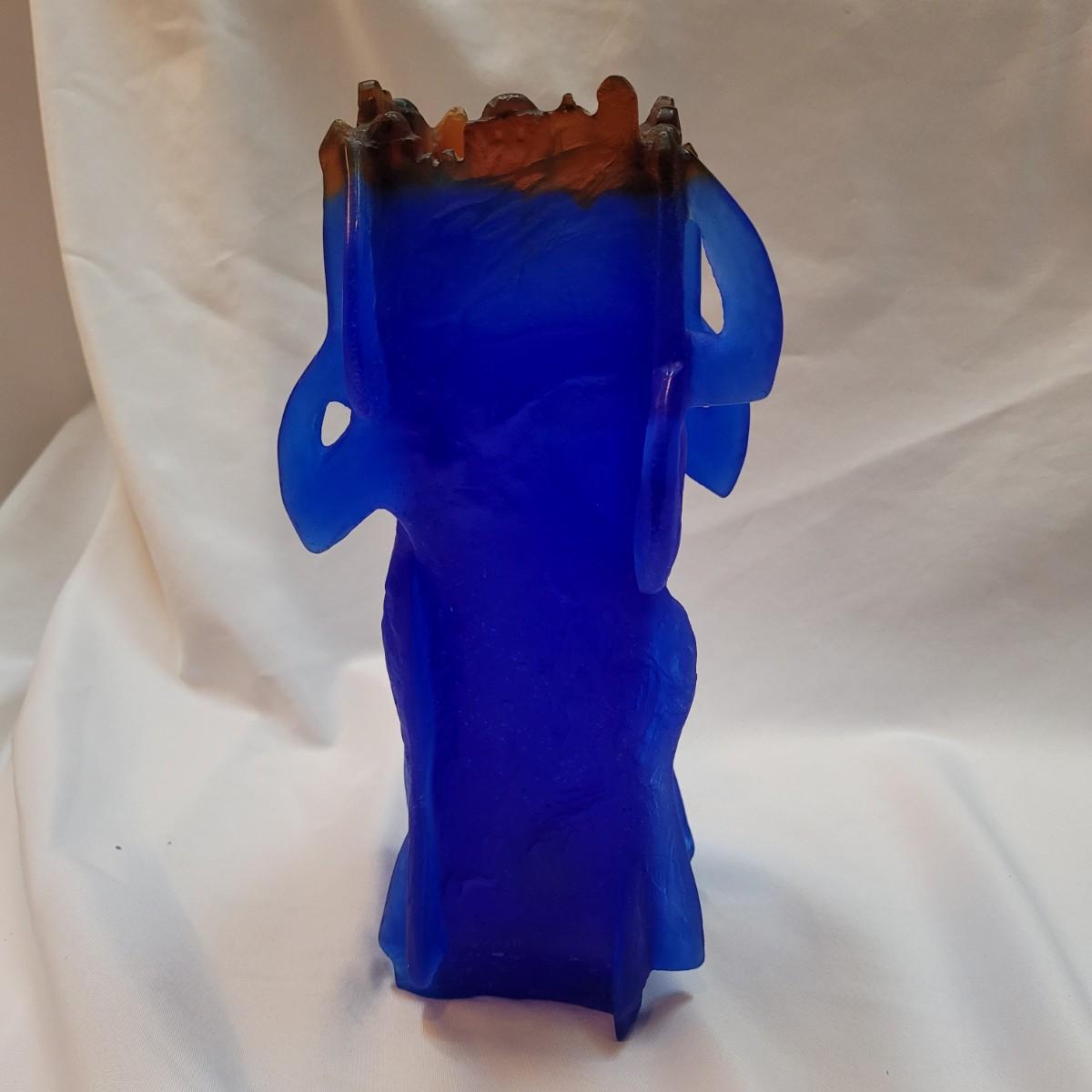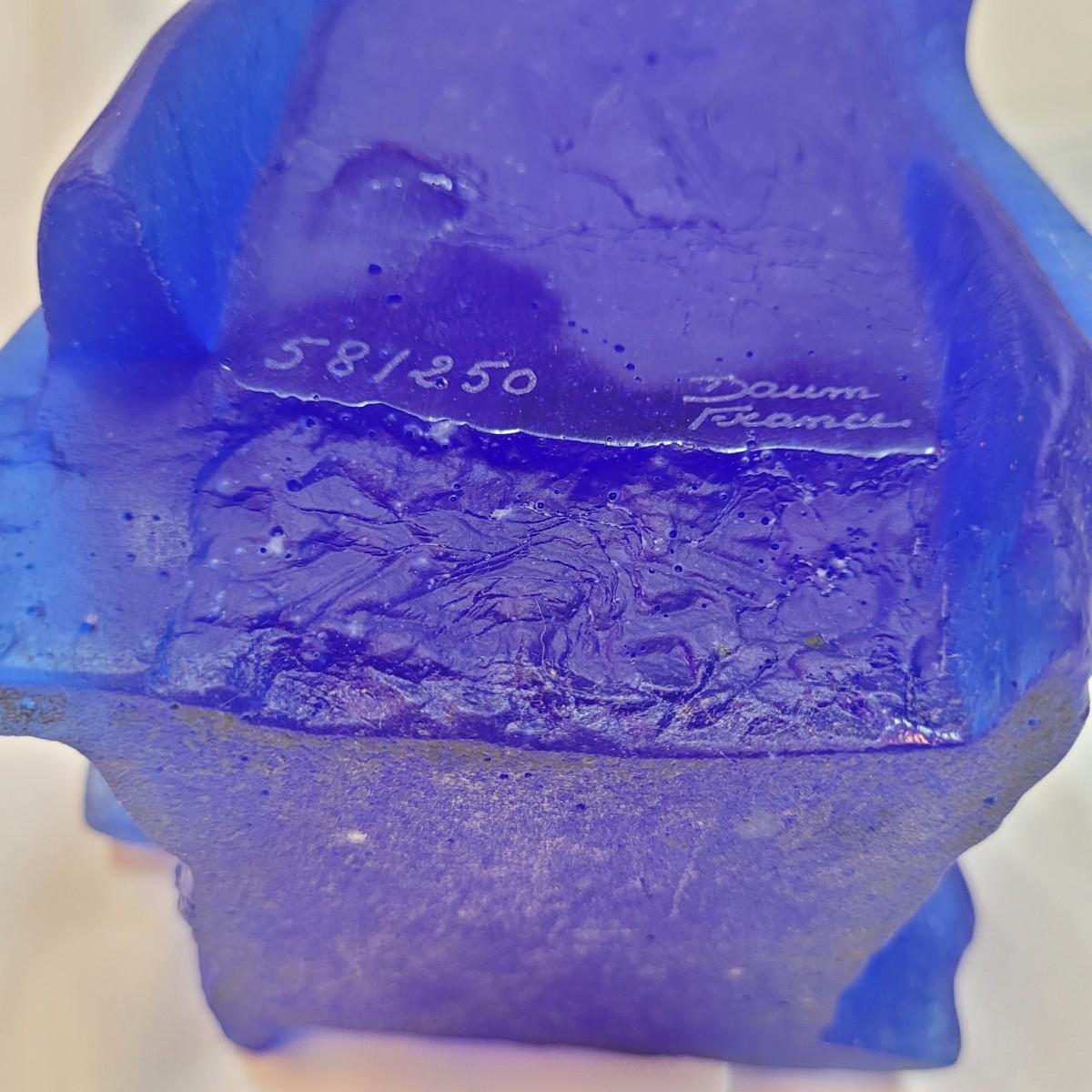 This is a decorative vase appears to be "Heavenly Jerusalem" from Daum crystal of France by Yoël Benharrouche. According to the seller, the vase depicts four women from the Bible holding up the city of Jerusalem. It is made from thick, heavy frosted blue and brown glass. It is signed "Daum France" and numbered 58/250. Vase measures 7"x 7" x 13"H.