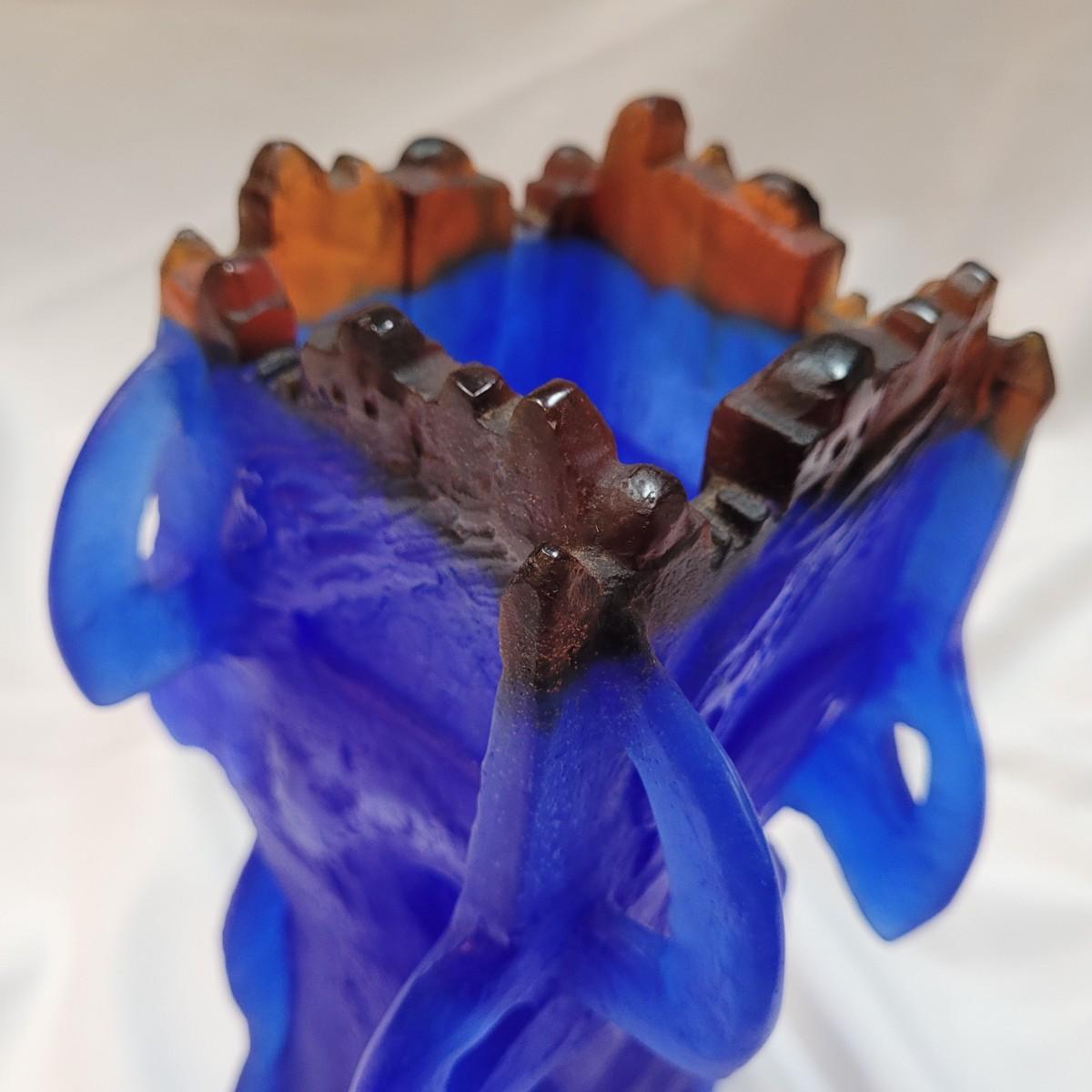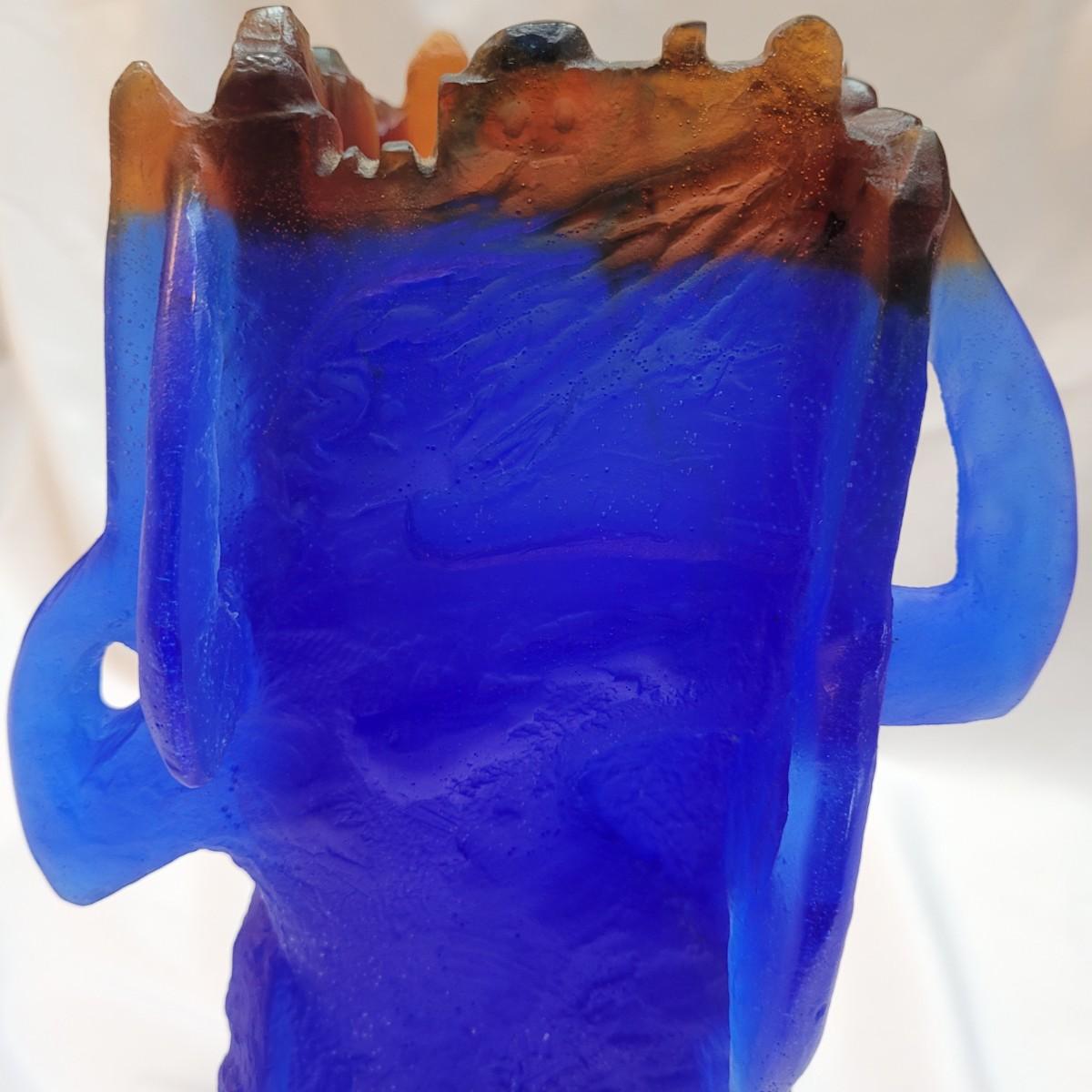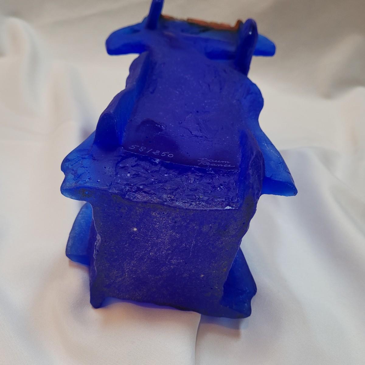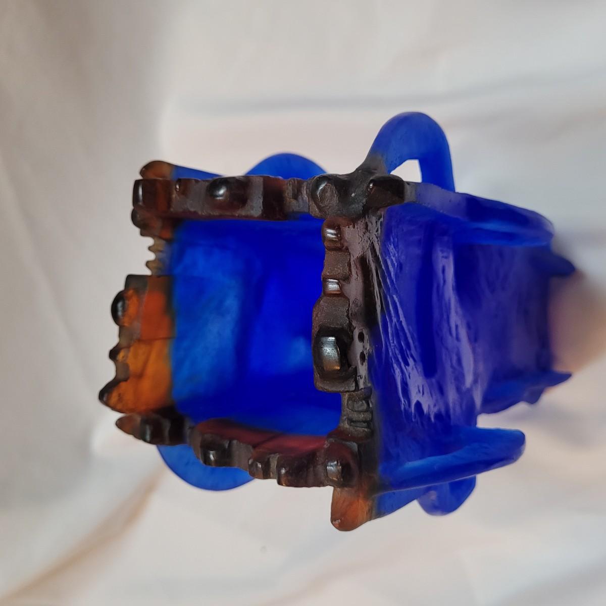This is a decorative vase appears to be "Heavenly Jerusalem" from Daum crystal of France by Yoël Benharrouche. According to the seller, the vase depicts four women from the Bible holding up the city of Jerusalem. It is made from thick, heavy frosted blue and brown glass. It is signed "Daum France" and numbered 58/250. Vase measures 7"x 7" x 13"H.