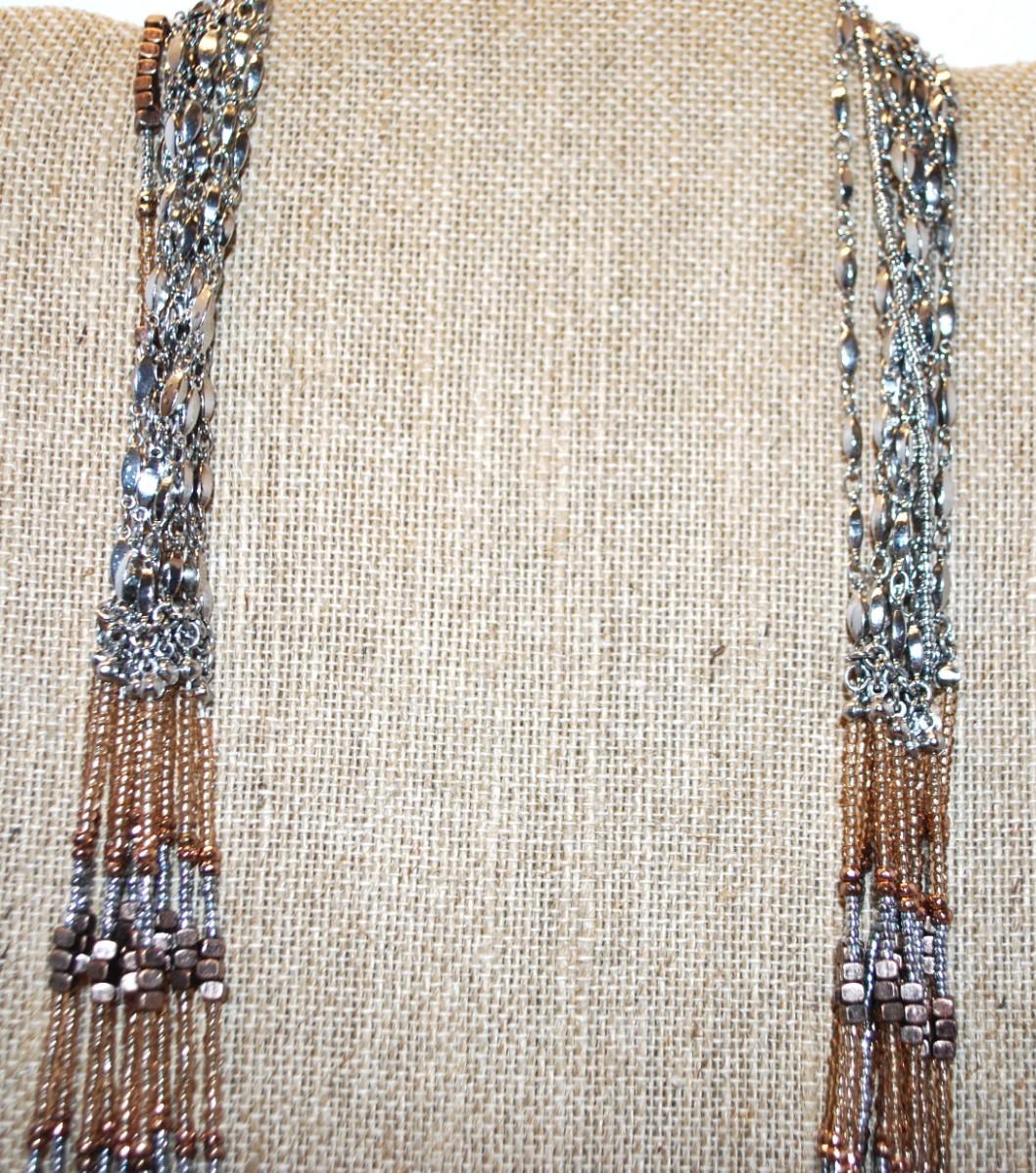 Heavily Beaded 11 Strands Browns Necklace with Shiny Silver Tone Neck Strands 30" L