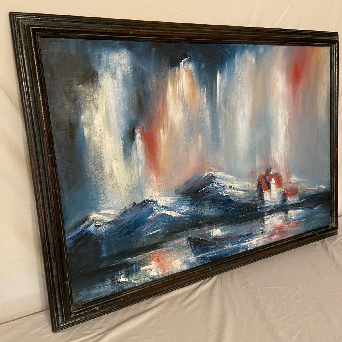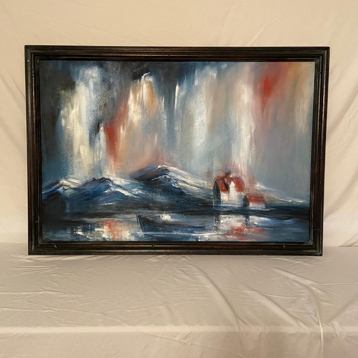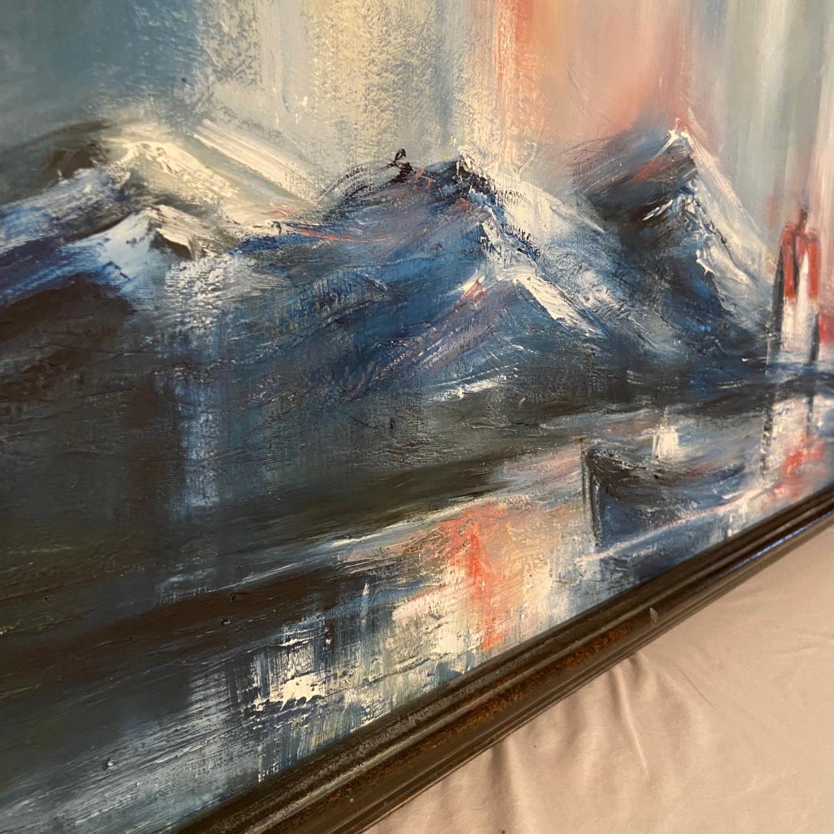 Painting of mountain landscape with textured layers. Wood frame has a dark finish. The painting appears to be an original on canvas with no signature. Frame measures 39” x 27”H.