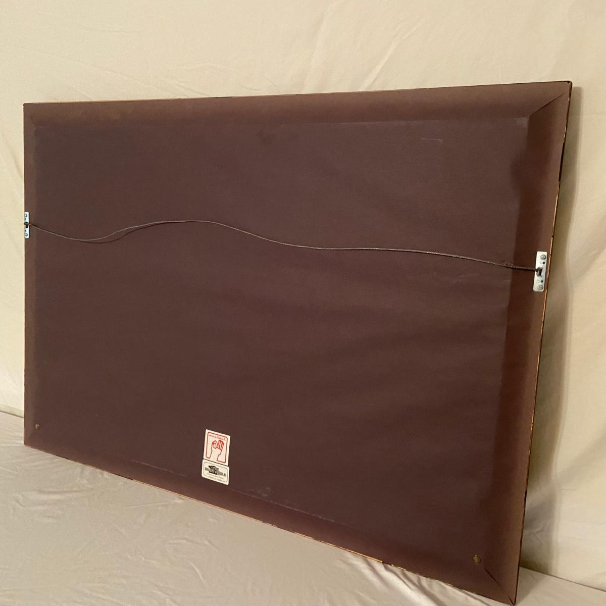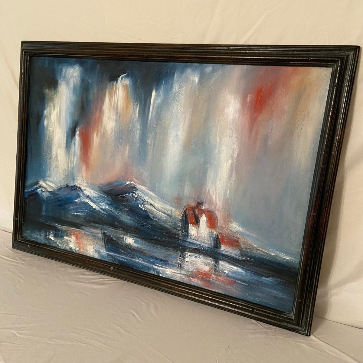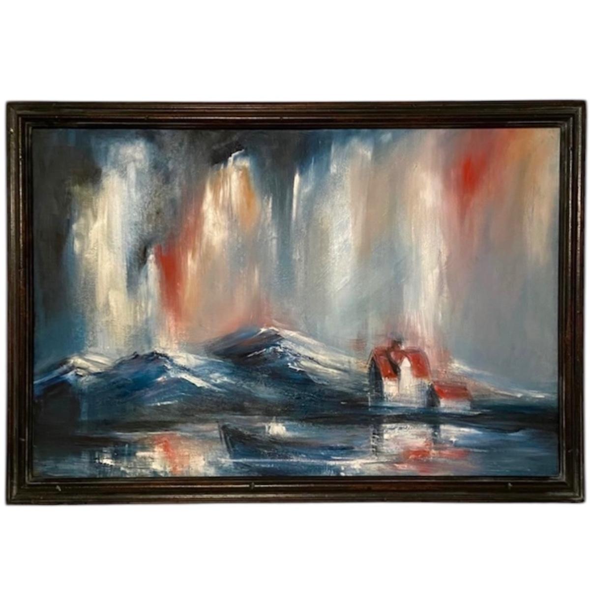 Painting of mountain landscape with textured layers. Wood frame has a dark finish. The painting appears to be an original on canvas with no signature. Frame measures 39” x 27”H.