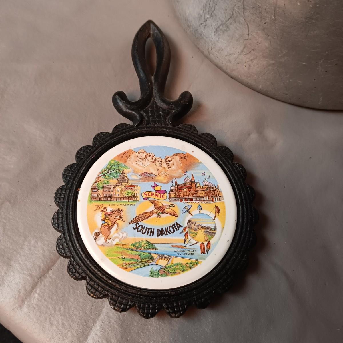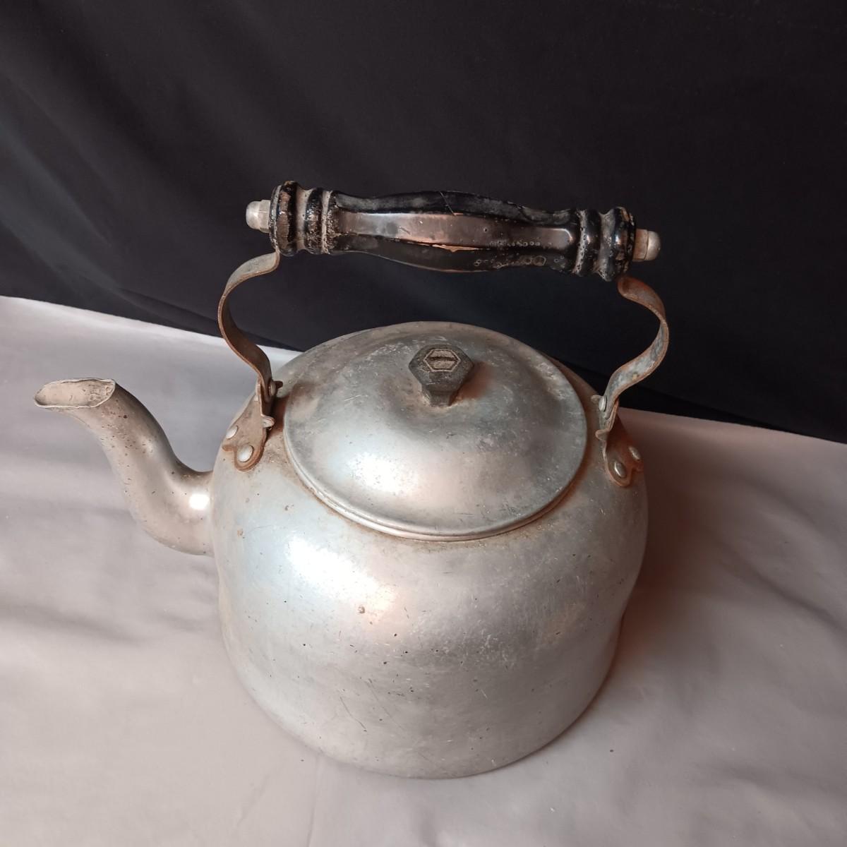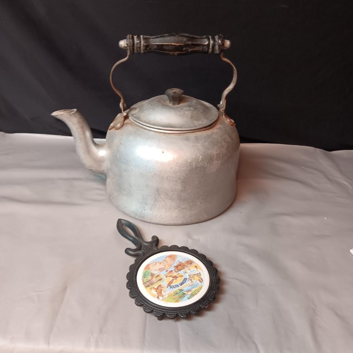 HEAVY ALUMINUM MIRRO KETTLE AND CAST IRON TRIVET