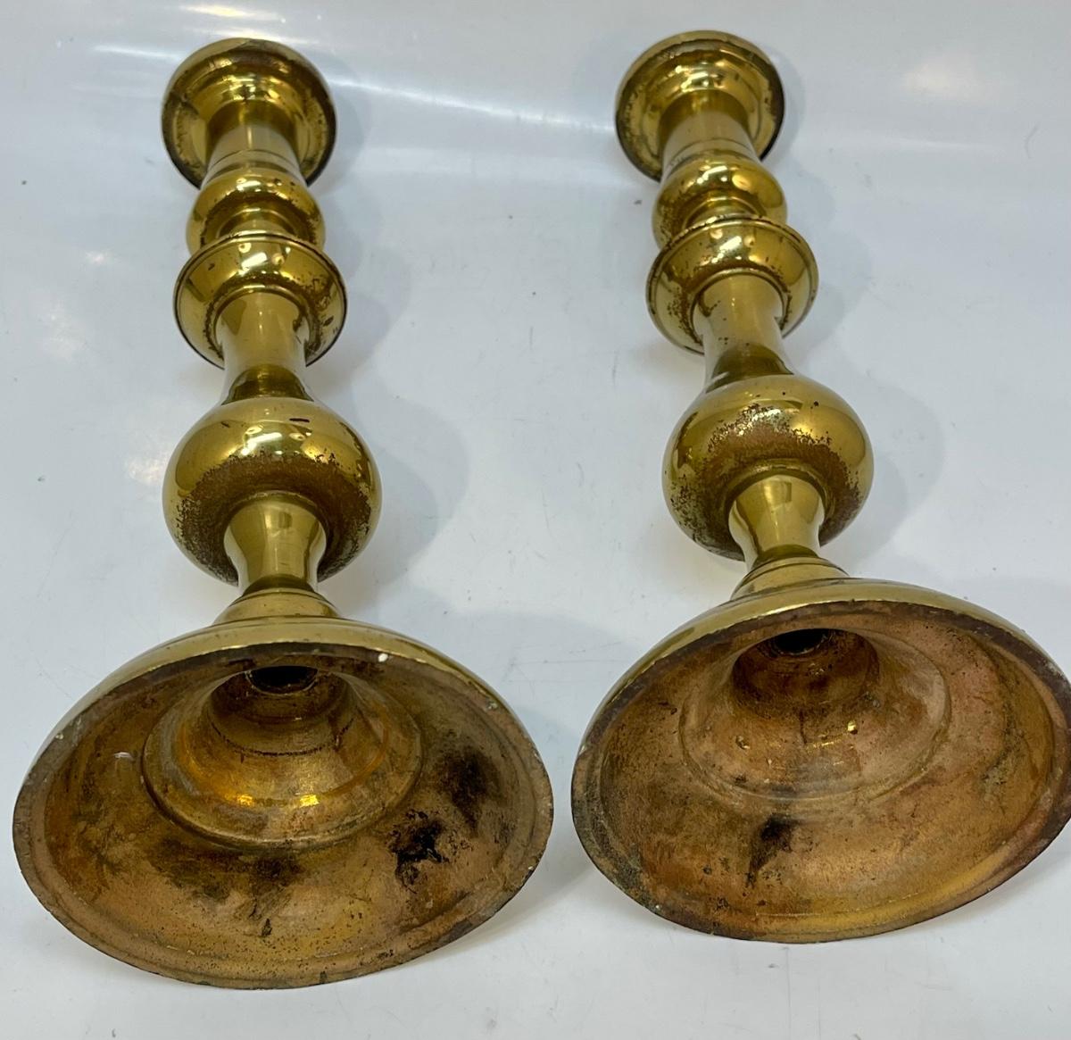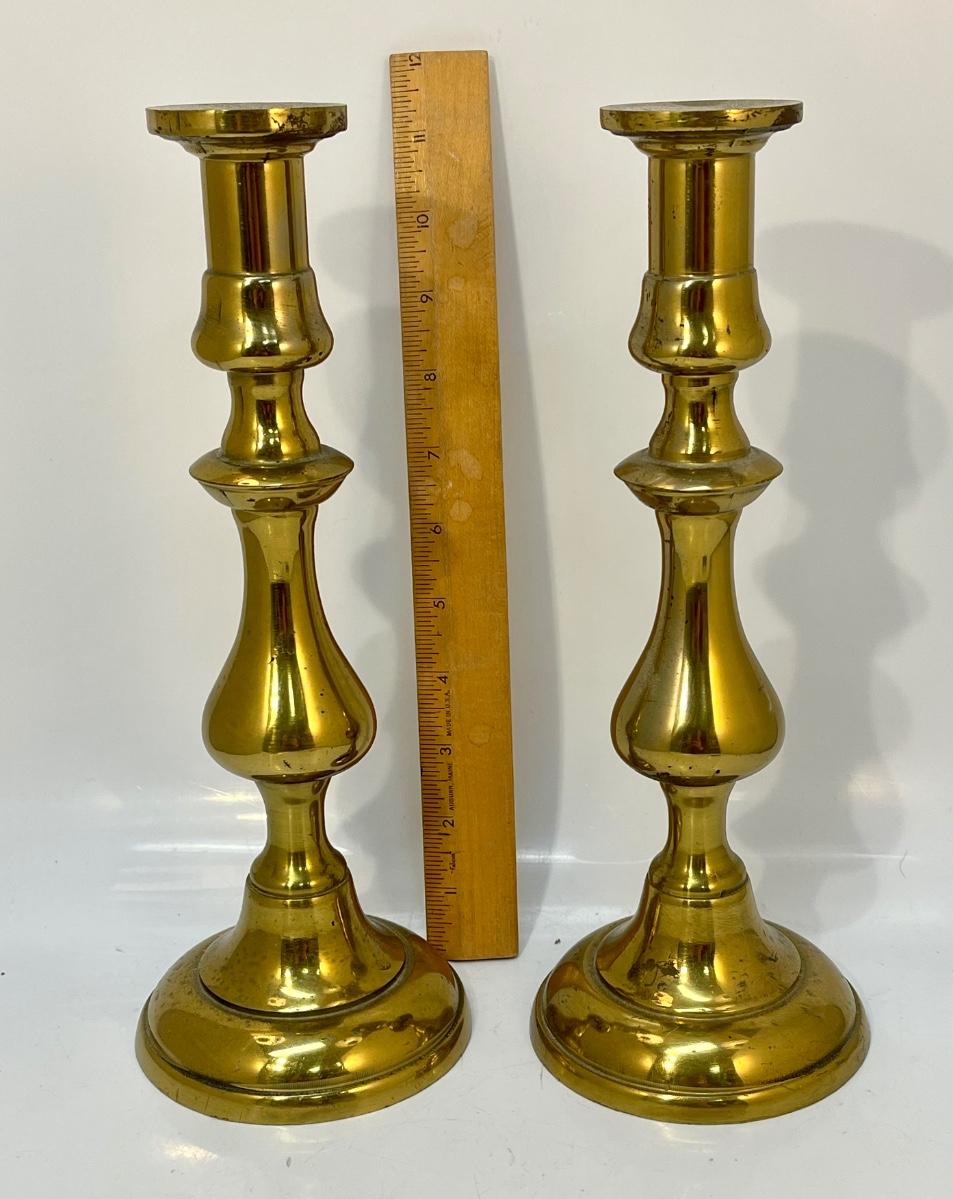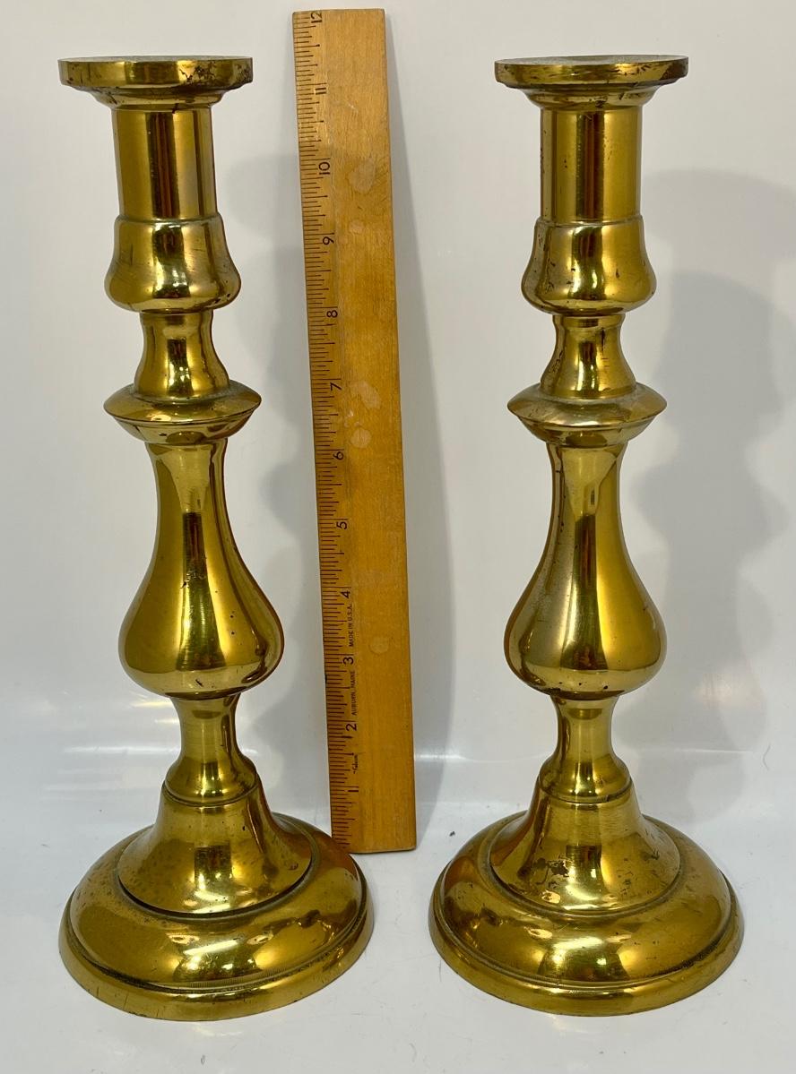 Vintage Set of Heavy Brass Candle Holders Candlesticks. About 12" tall. In good used condition.