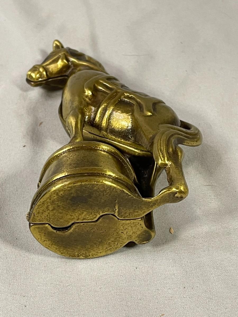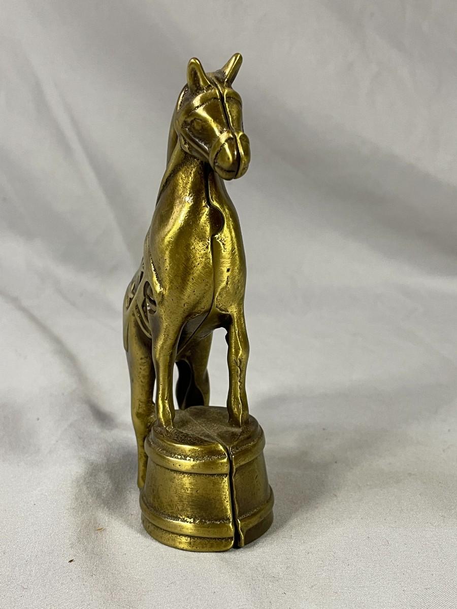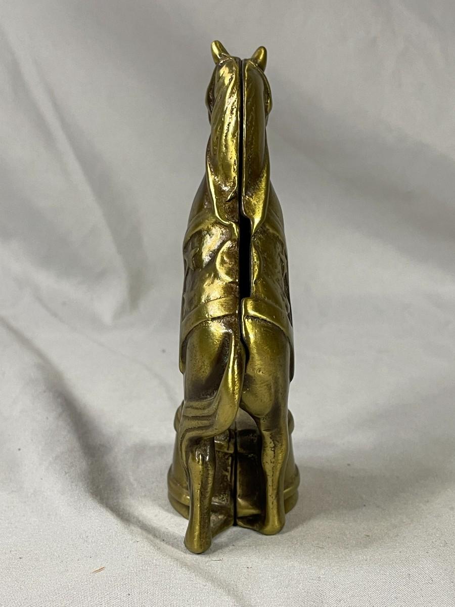 This has the weight of cast iron, but the look of brass. It is about 5.25" tall and has a slot in the saddle to drop coins in.