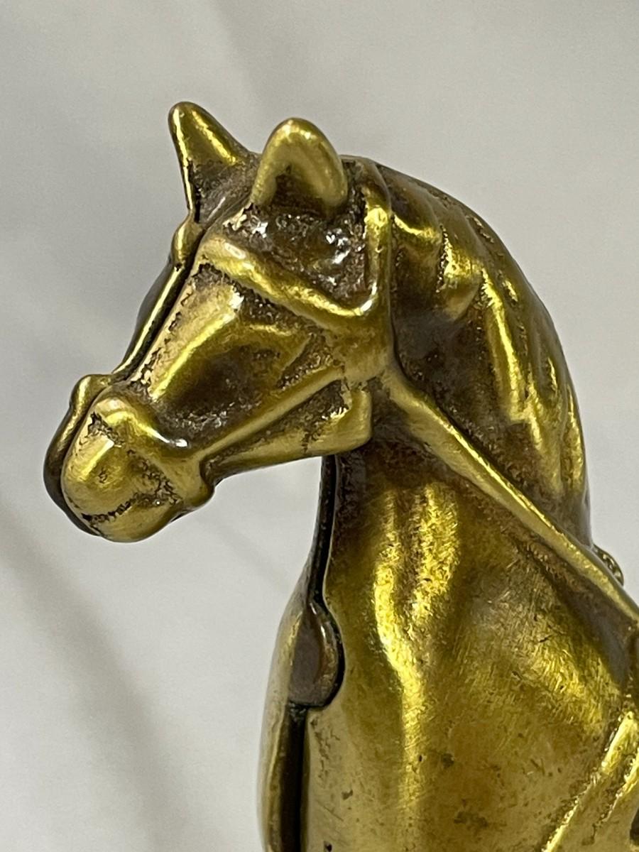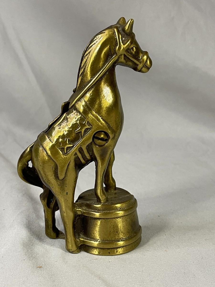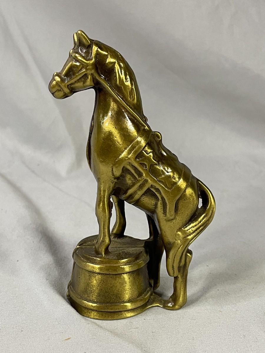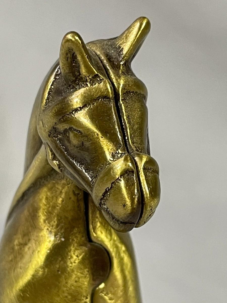This has the weight of cast iron, but the look of brass. It is about 5.25" tall and has a slot in the saddle to drop coins in.