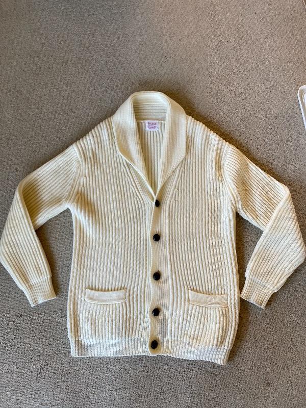 Off white heavy cardigan sweater. Size larg. Very light spot near bottom.