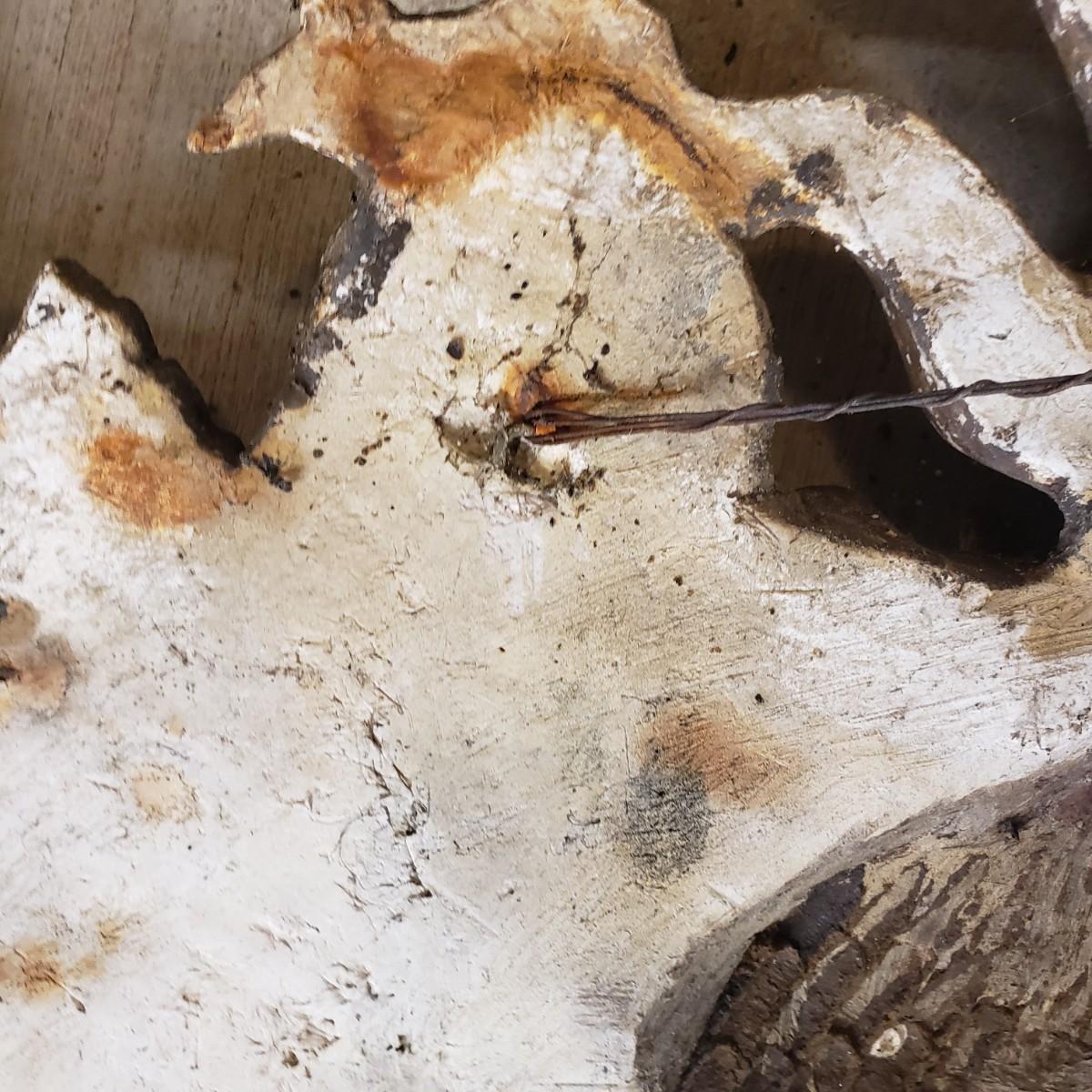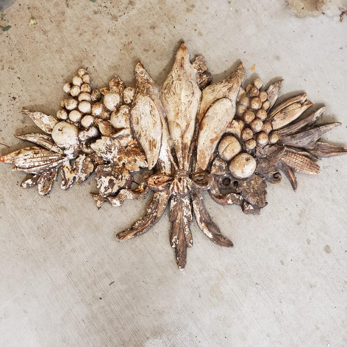 This heavy cornucopia ceramic hanging decoration measures 38" x 25". It has a rustic weathered look, as either it has peeled off, or it's intended to look weathered.