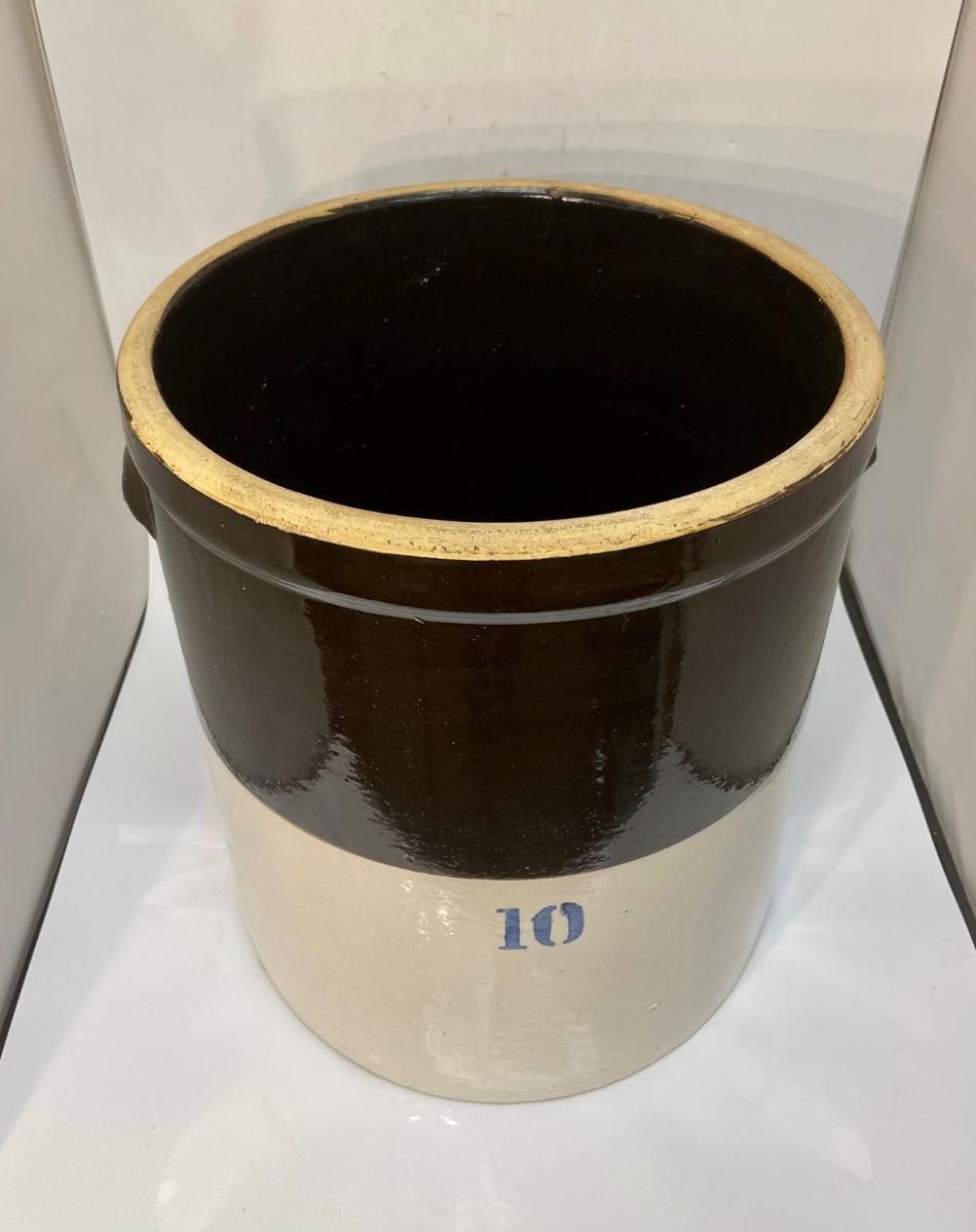 Vintage Antique Stoneware Salt Glaze Two Tone 10 Gallon Stub Handle Crock. Marking indicates 10-gallon size. No maker mark on the bottom. In good vintage condition.