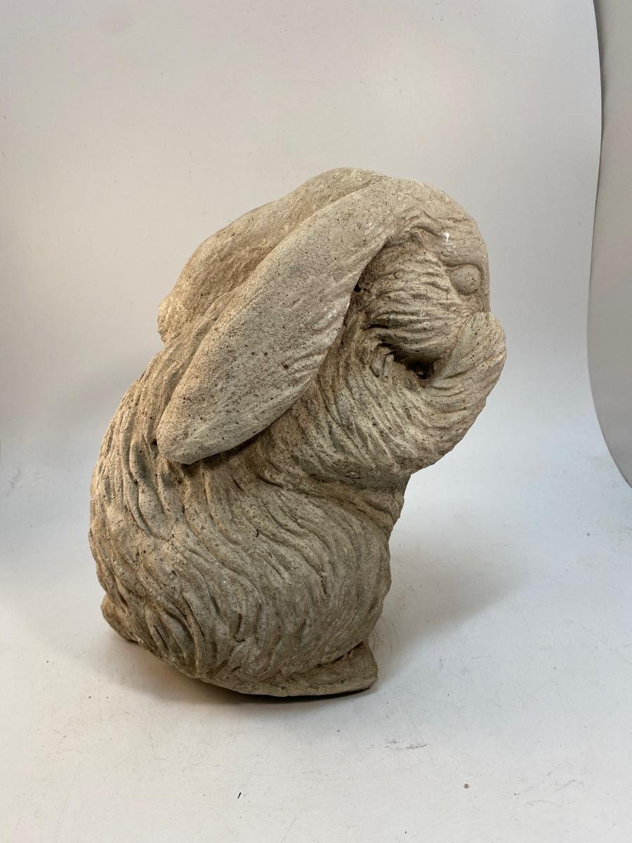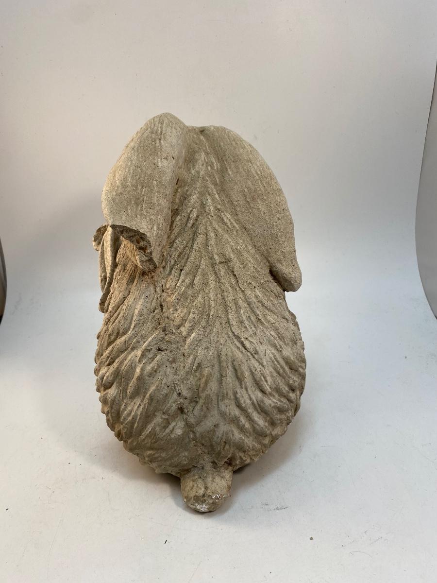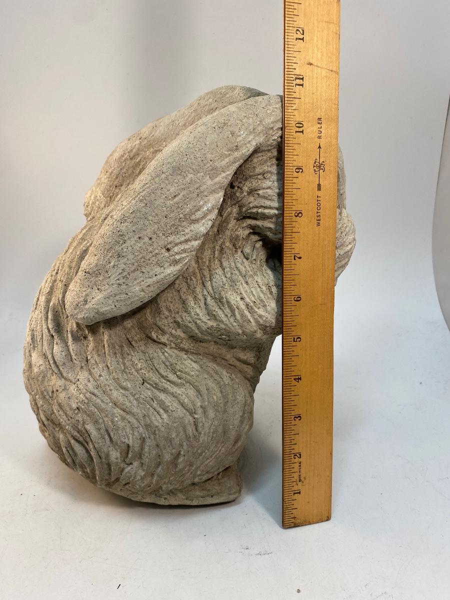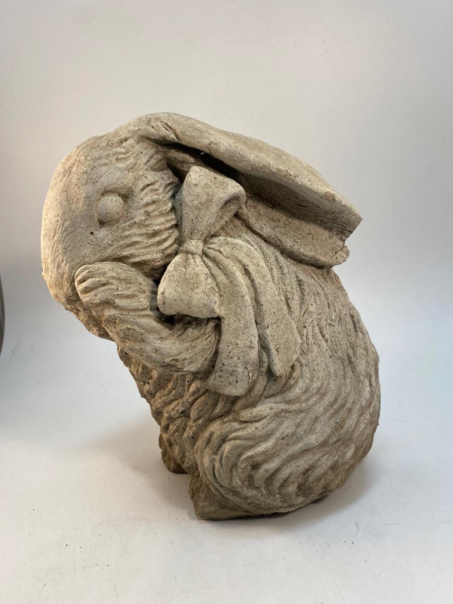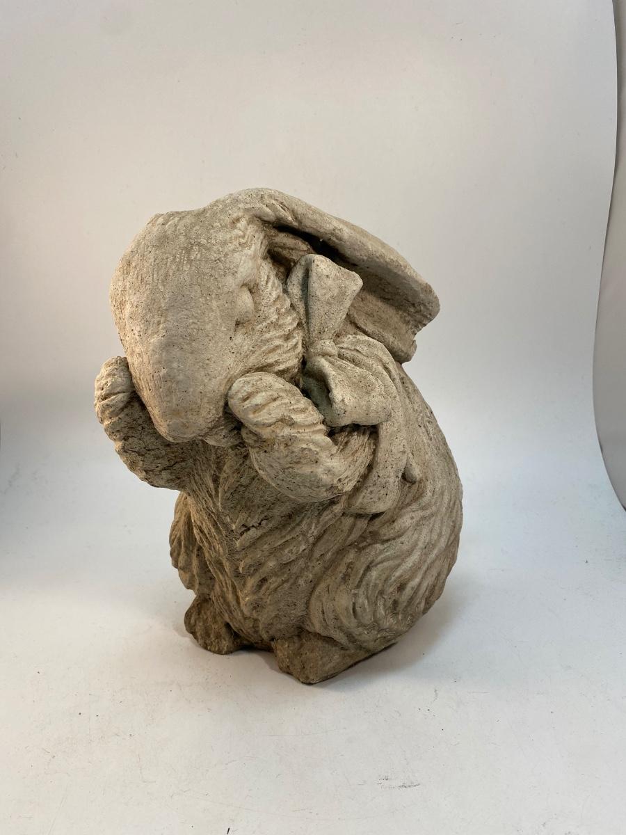 Heavy Concrete Cement Bunny Rabbit with Bow Garden Yard Art Statue. Solid cement. About 11" tall. In good weathered condition.