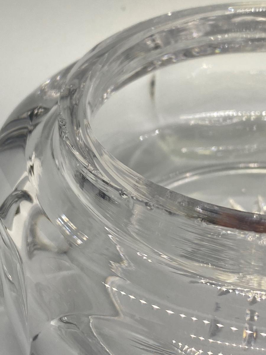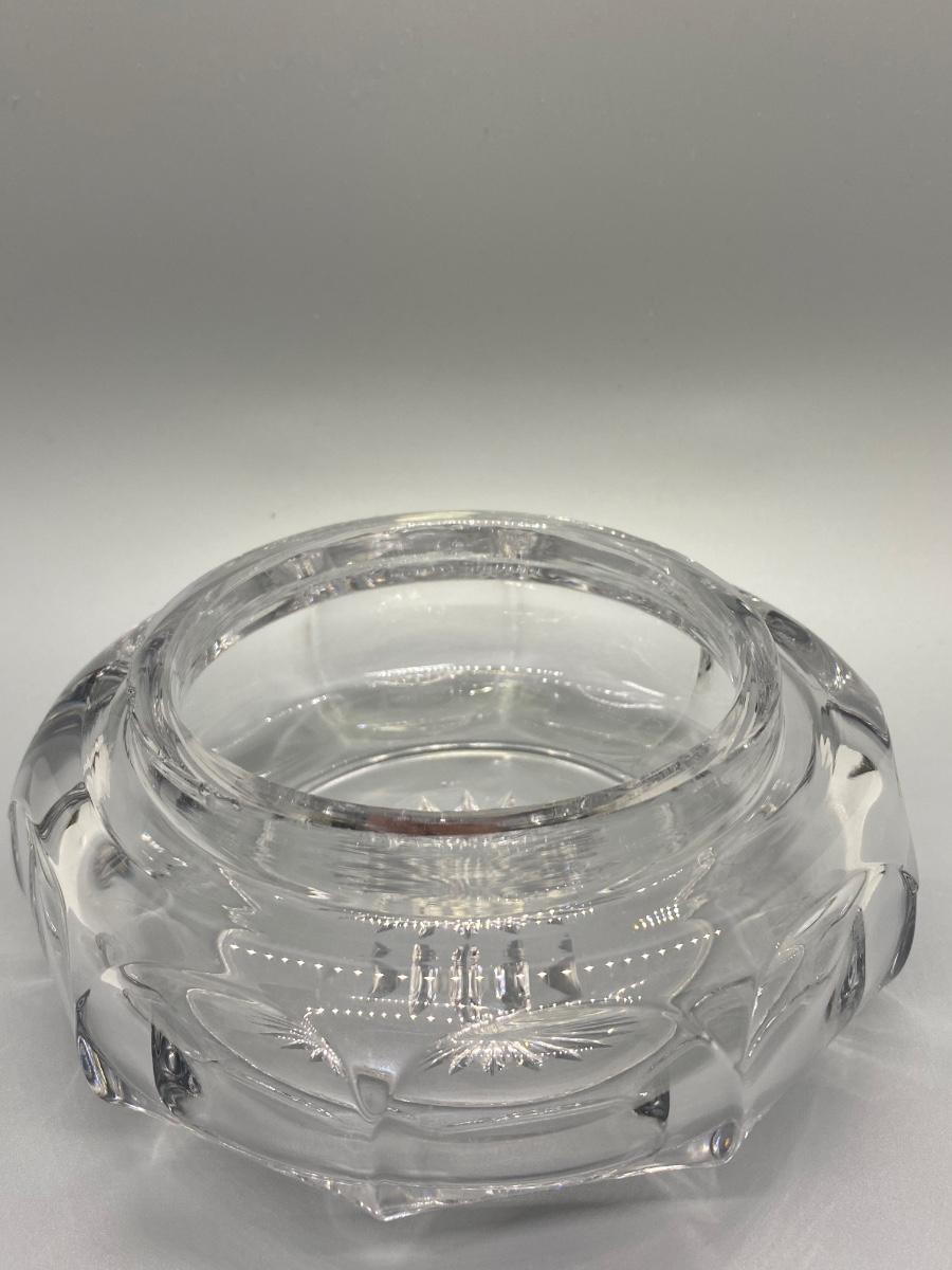 Heavy crystal powder jar. Great as a lidded trinket dish, candy dish, or jewelry holder. Good condition but did notice a couple very small flea bite chips along the inside edge. Under 5" diameter.