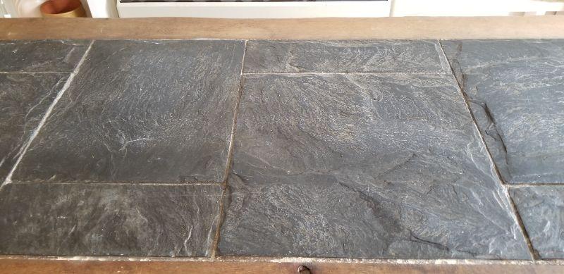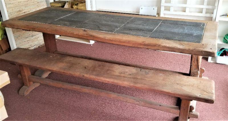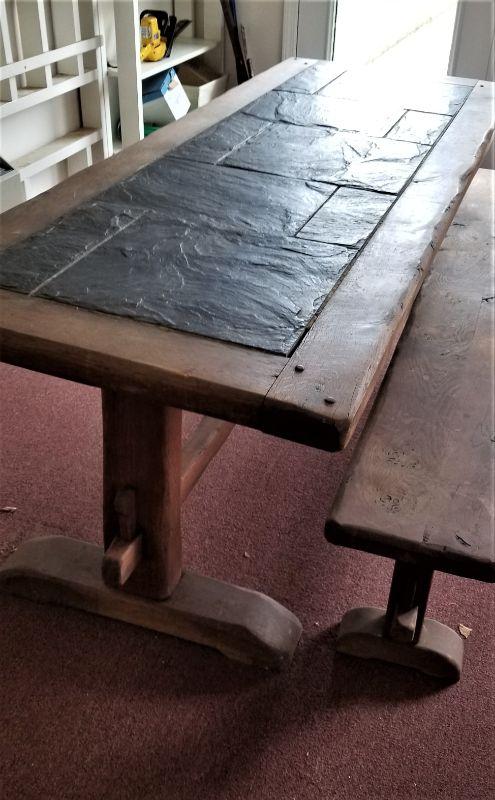 Heavy table that appears to be made of cypress - has a slate top. Trestle style with one bench. Bench is not attached. VERY HEAVY. You will need help to move this. Measures 86.5" long, 31.5" wide, 30" tall.
