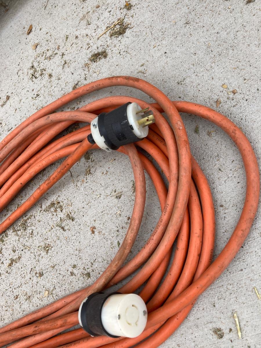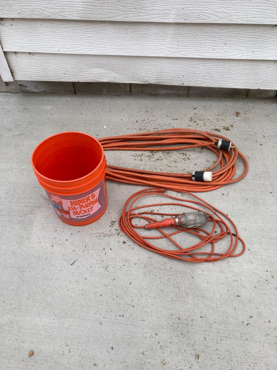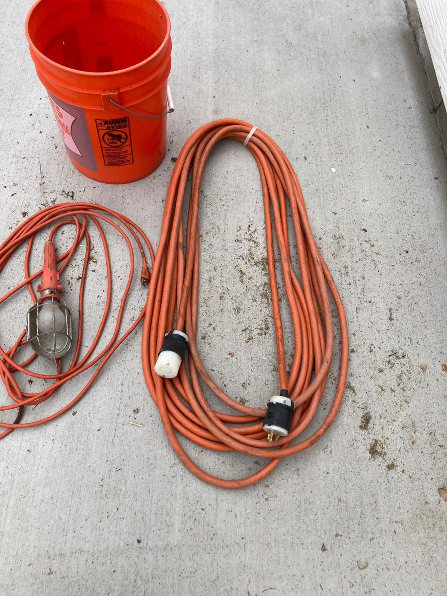 HEAVY DUTY 50’ 220V EXTENSION CORD, TREBLE LIGHT AND MATCHING ORANGE BUCKET ˜‰