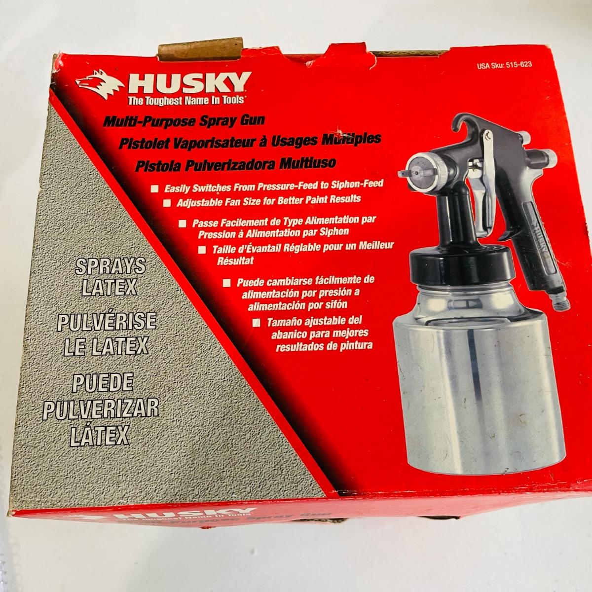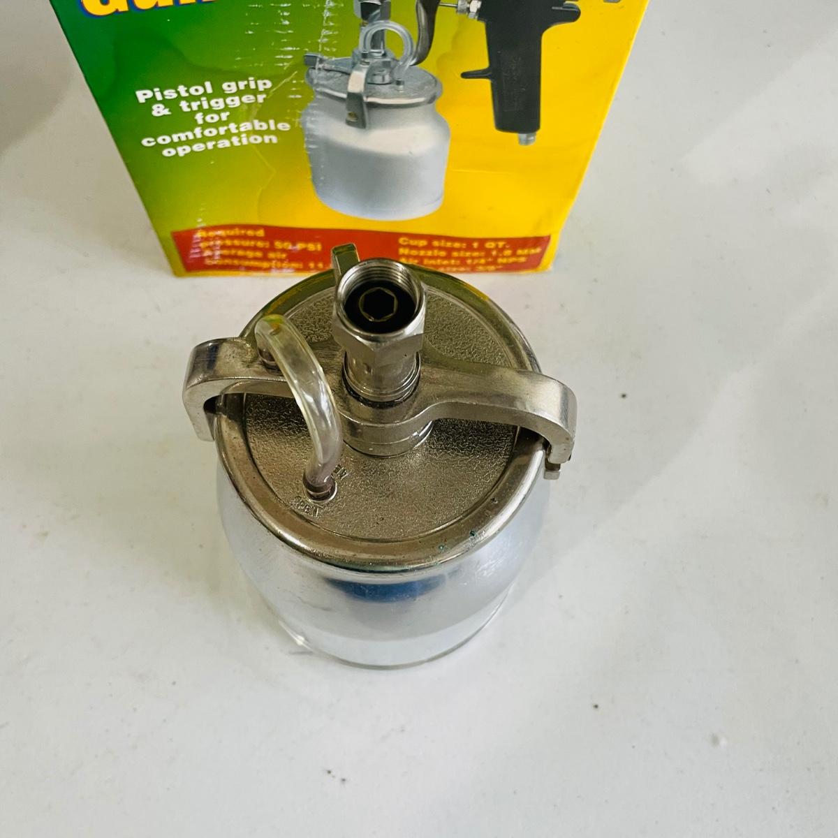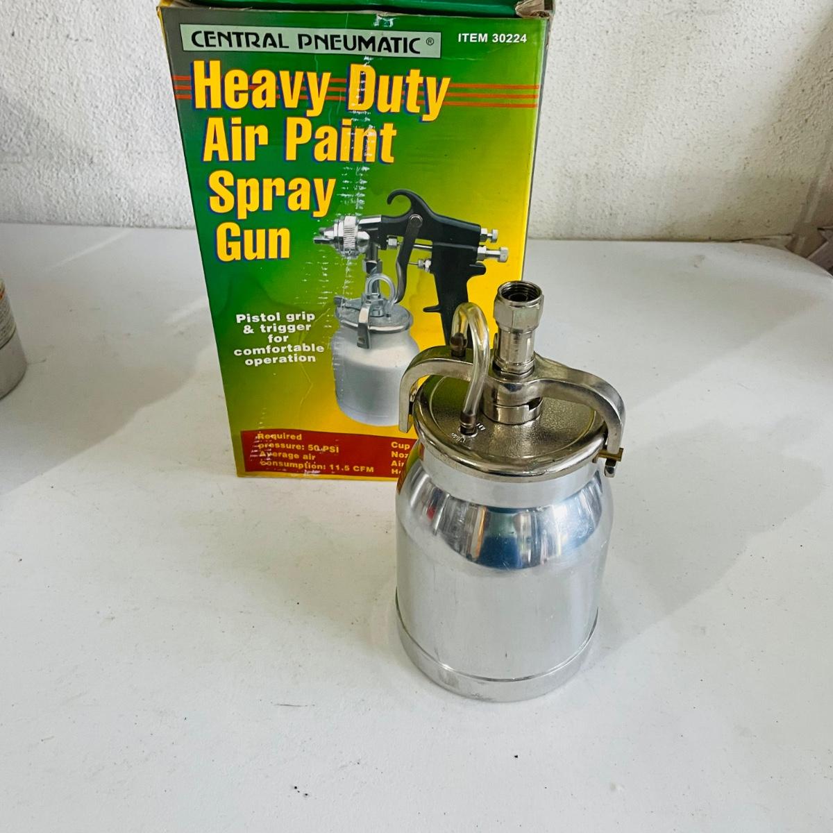 Lot includes 1qt Central Pneumatic Heavy Duty air paint spray gun in new condition. A Husky multi-purpose spray gun, brand new condition. A 5oz spray gun with 3 5oz containers, 4 1qt spray guns with containers. Also includes a bin of random spray gun accessory parts.