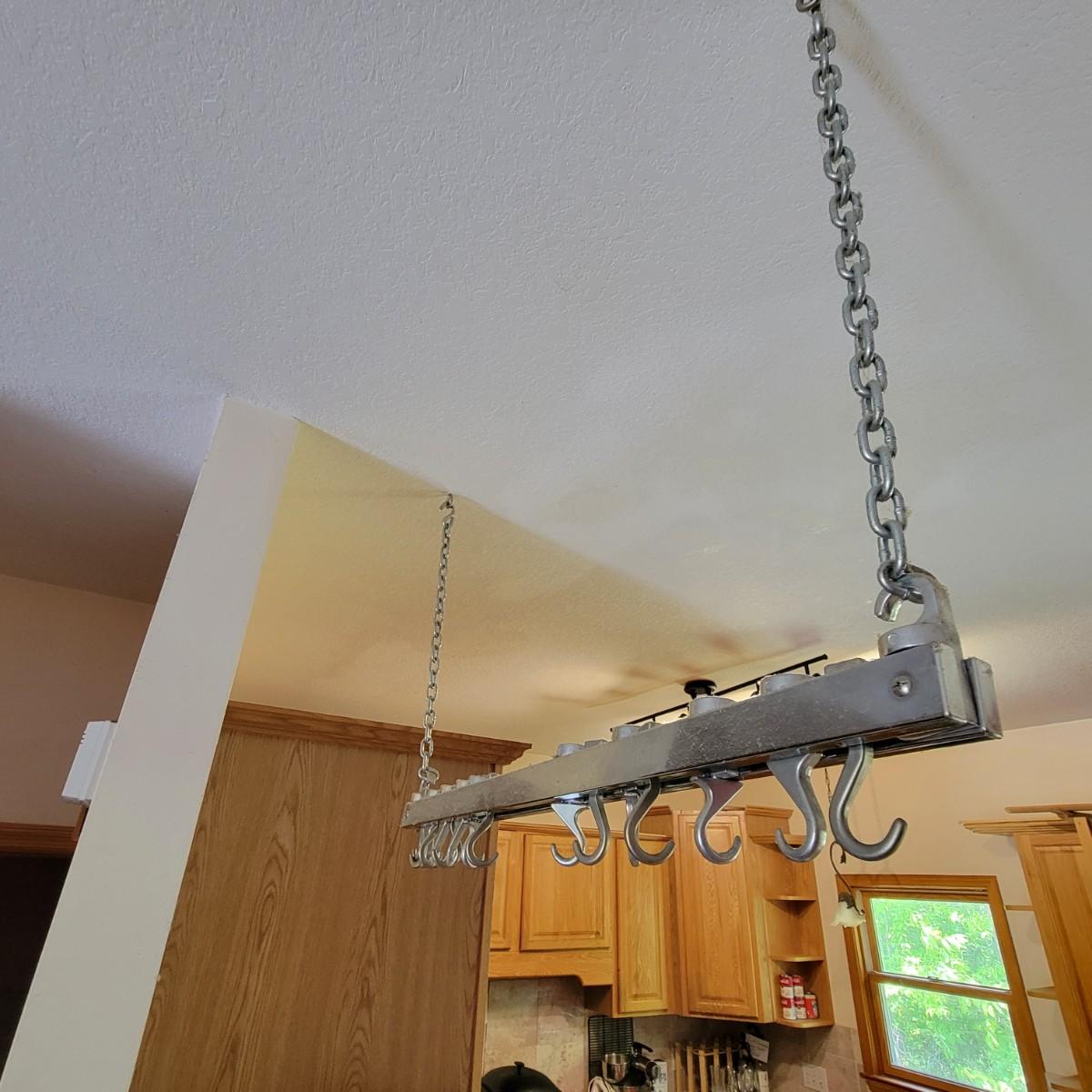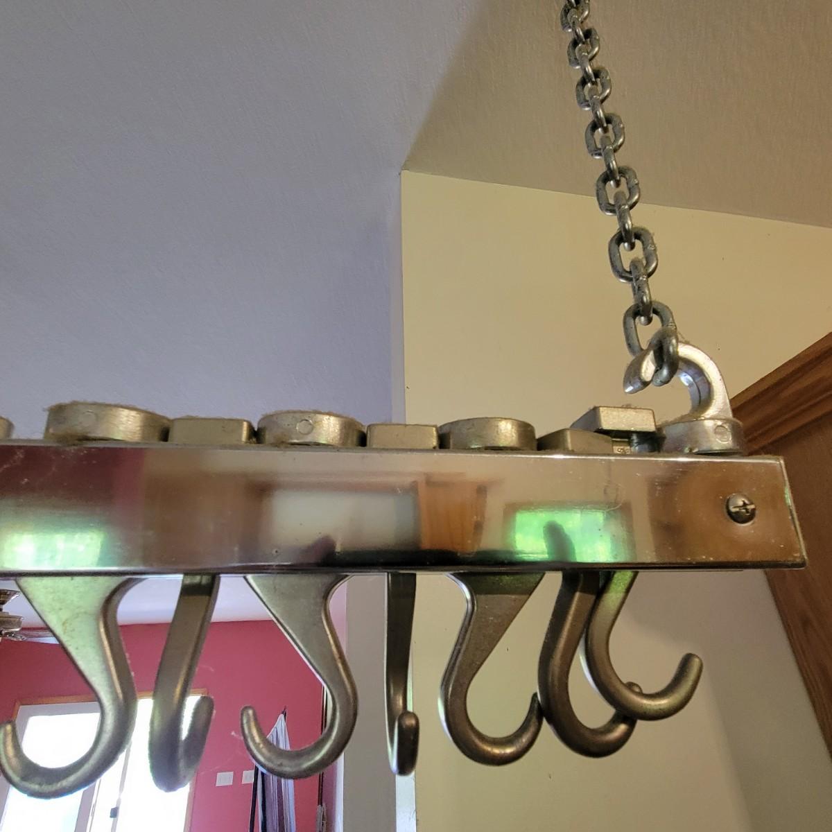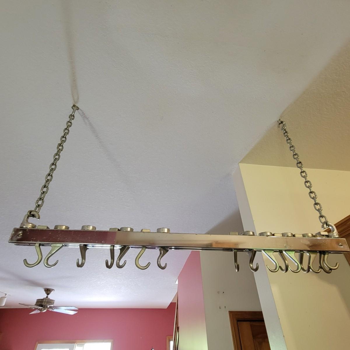 Heavy duty hanging pan rack with 16 hooks for hanging pans. Approximately 37" long and has 24" of chain to hang from the ceiling. Hooks are adjustable and swivel. Tools will be needed to remove hook eyes from ceiling if desired.