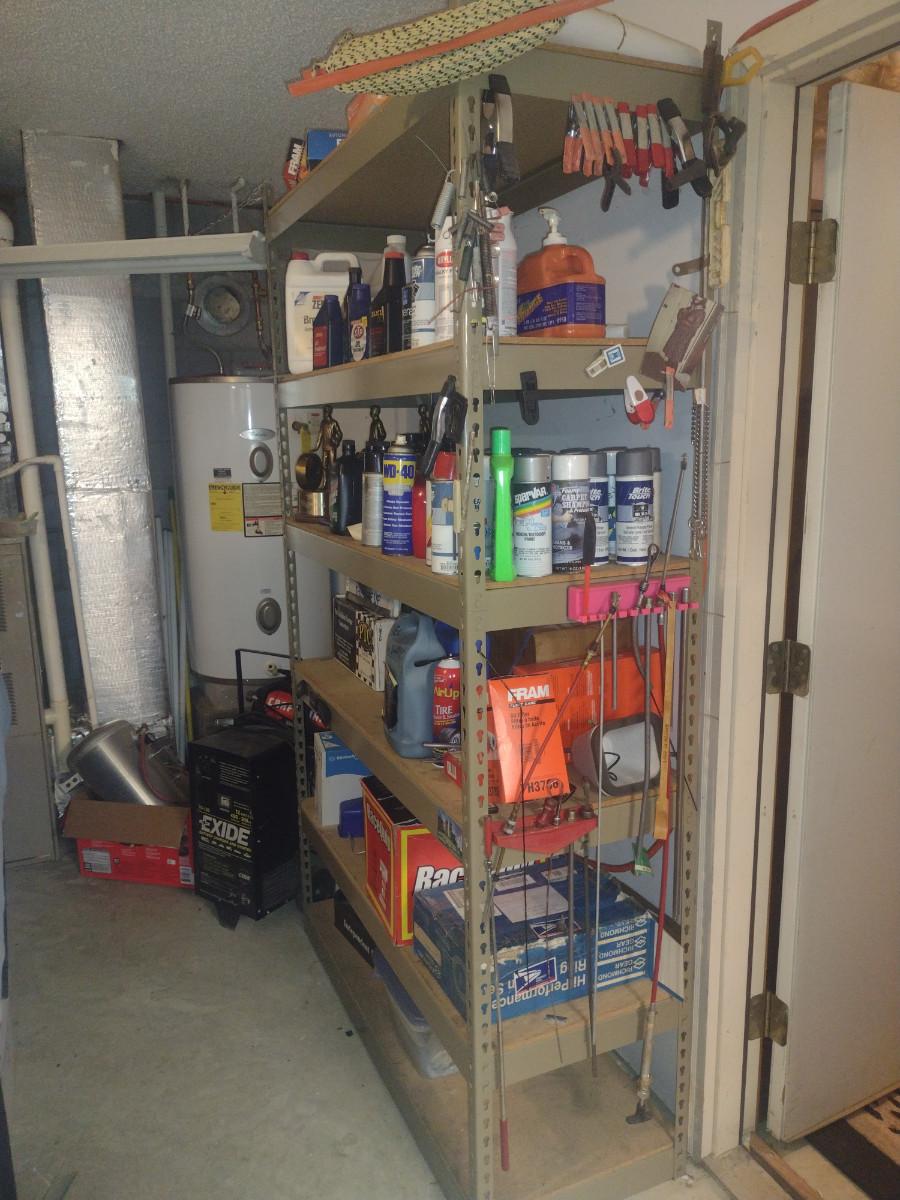 Heavy Duty Metal Adjustable Frame Shelf- Approx 48 1/2" x 18 1/2" x 84" Tall (Choice A). Item is located in garage and may have some staining on shelves. No contents included.