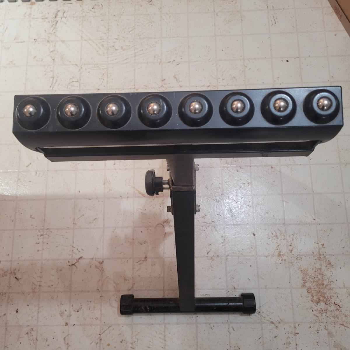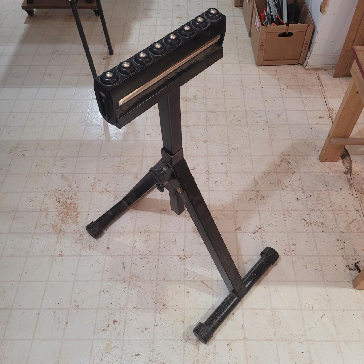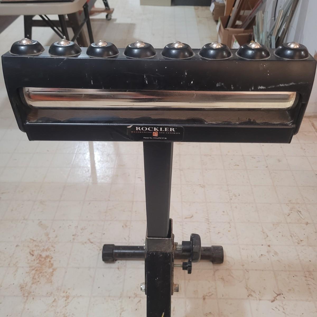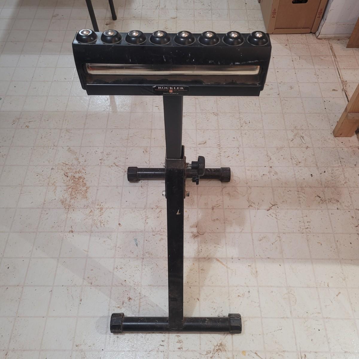 Rockler brand heavy duty foldable roller stand. Item measures 28" x 18" x 39". Height is adjustable. Made of metal with a few plastic components.